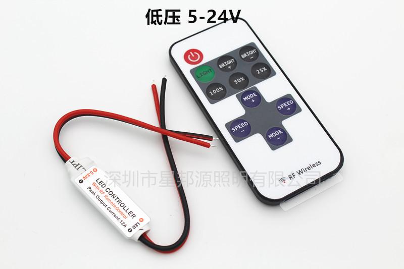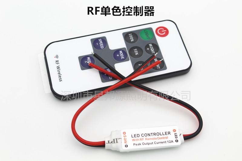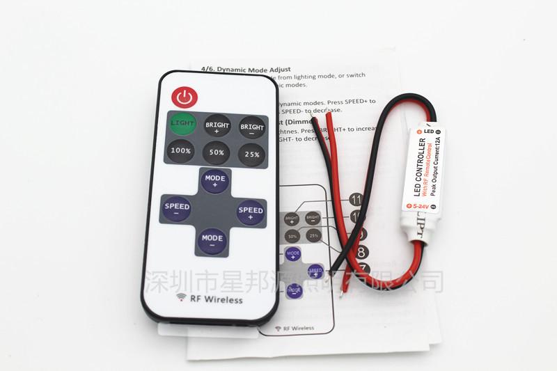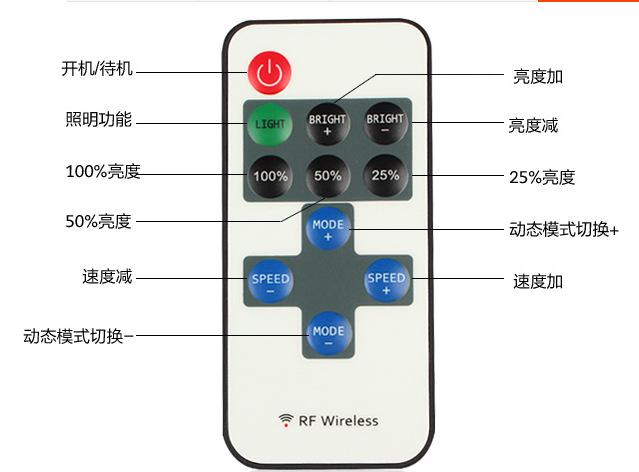 El controlador monocromático RF de 11 teclas utiliza señal inalámbrica de 433MHz para el control. Se utiliza para controlar varias lámparas monocromáticas con LED como fuente de luz. Por ejemplo: fuente de luz puntual,
