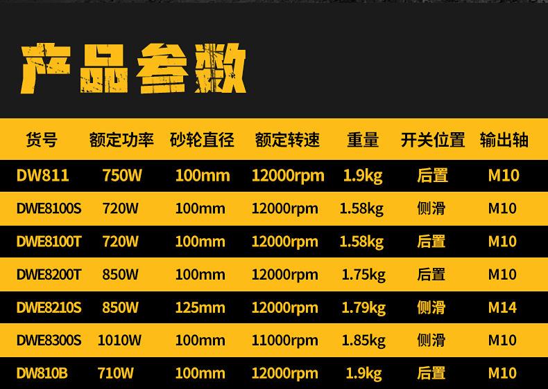 100mm 680W angle grinder (rear switch) DW810B-A9, 100mm 750W angle grinder (rear switch) DW811-A9, 100mm 720W ...