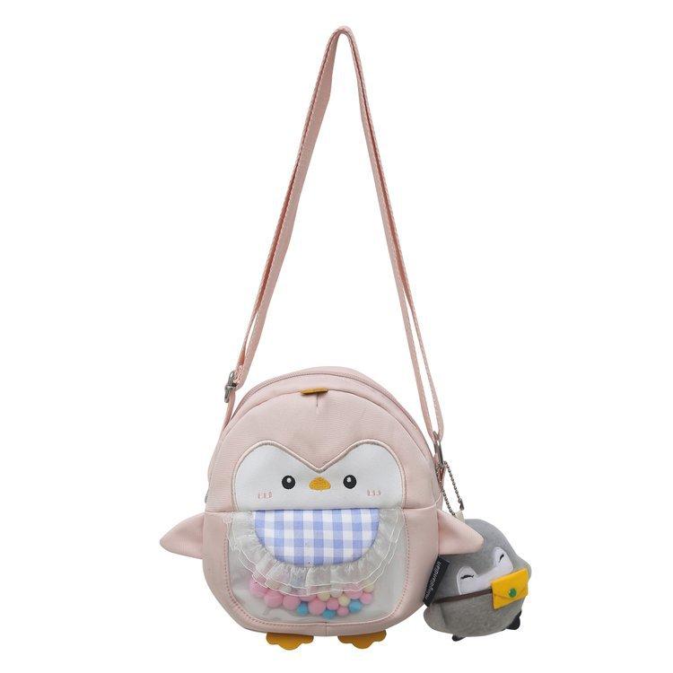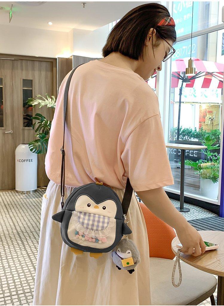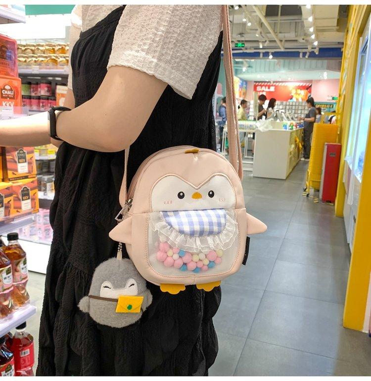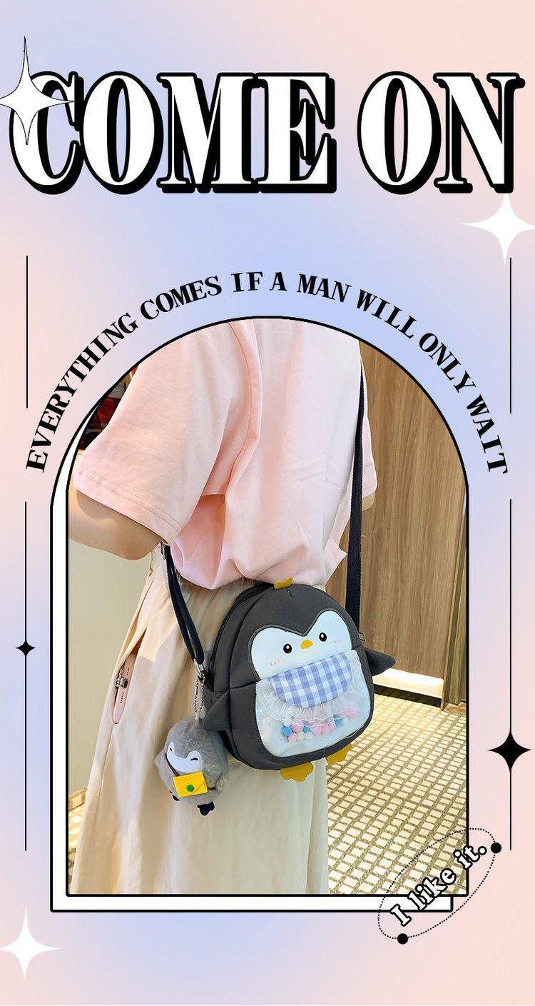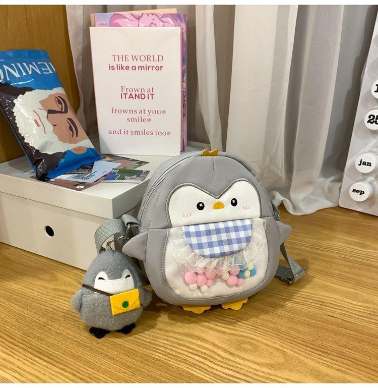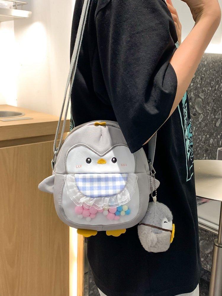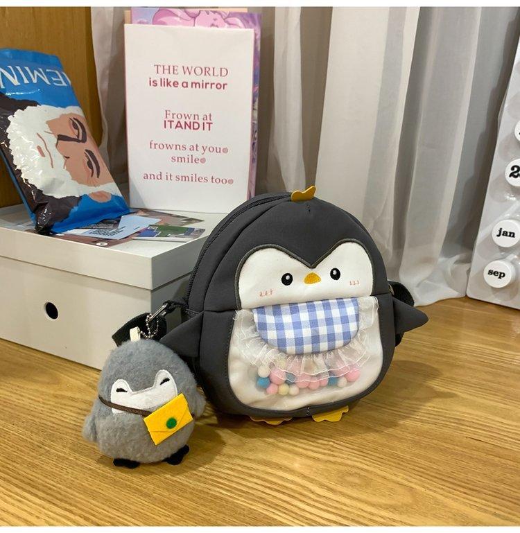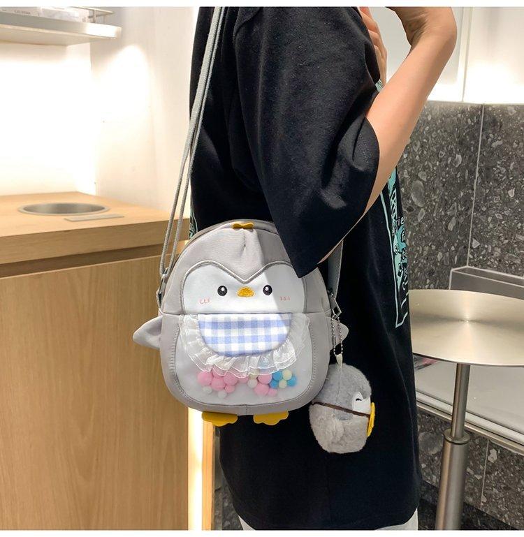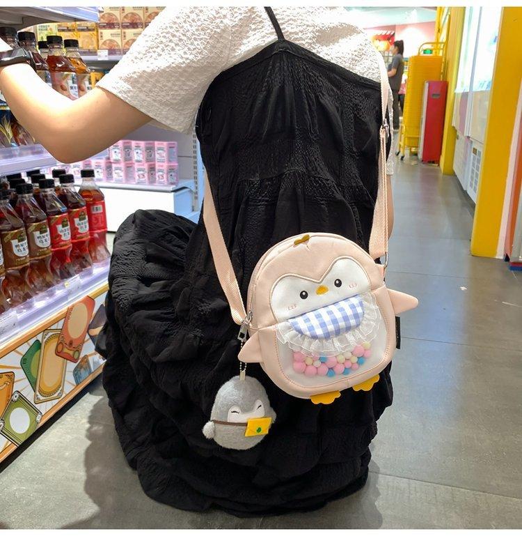 Bolso bandolera con diseño de pingüino y babero de dibujos animados, estilo japonés, dulce y suave, para niñas, mochila pequeña con encaje para el hombro.