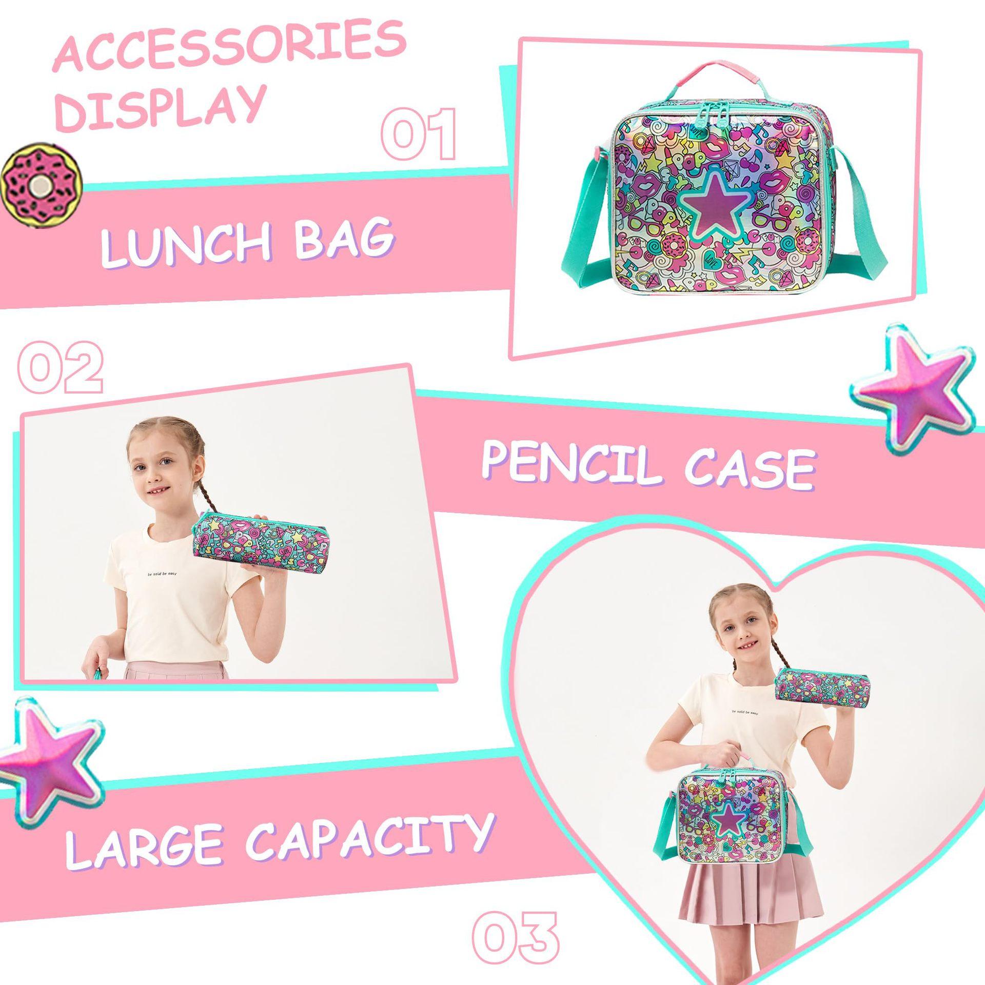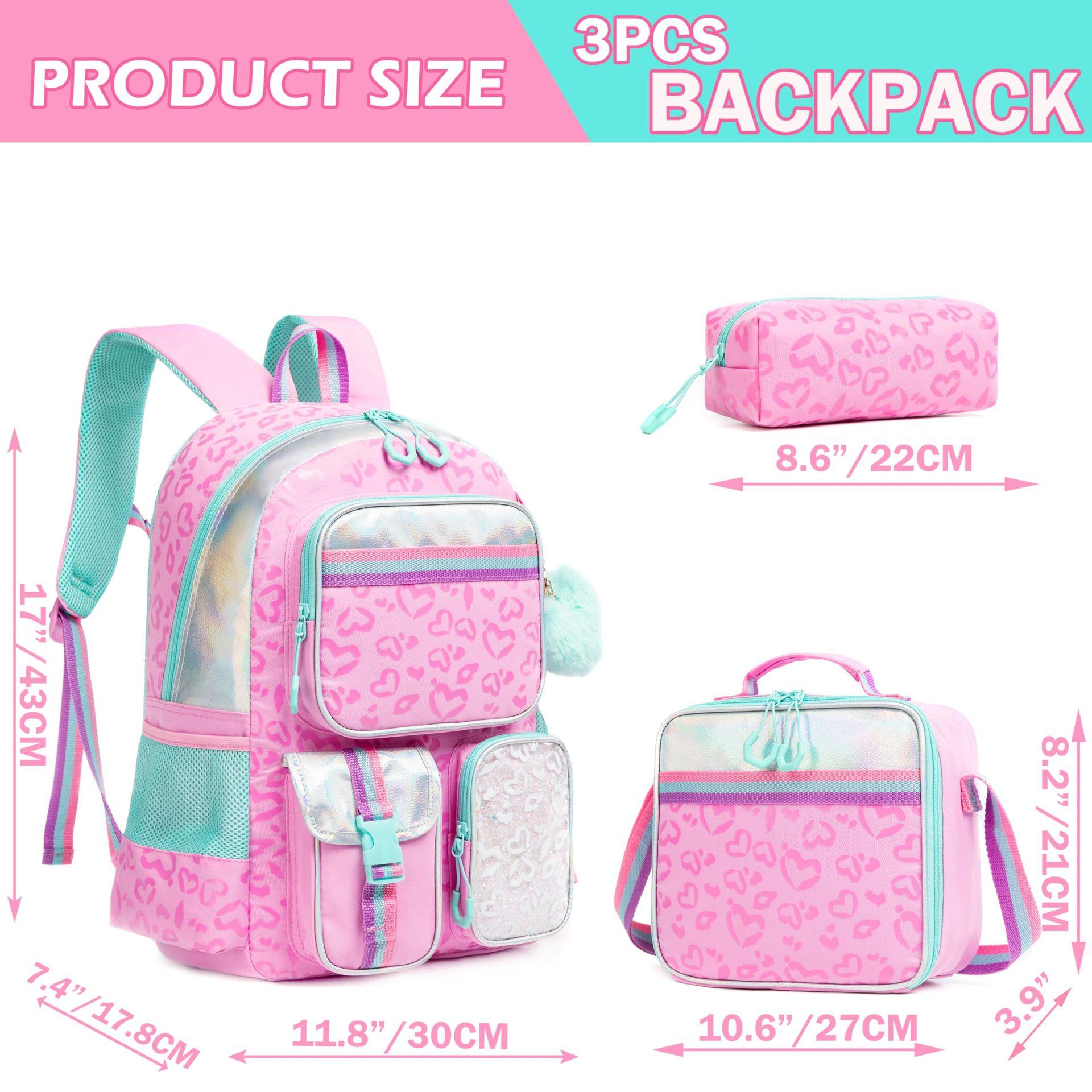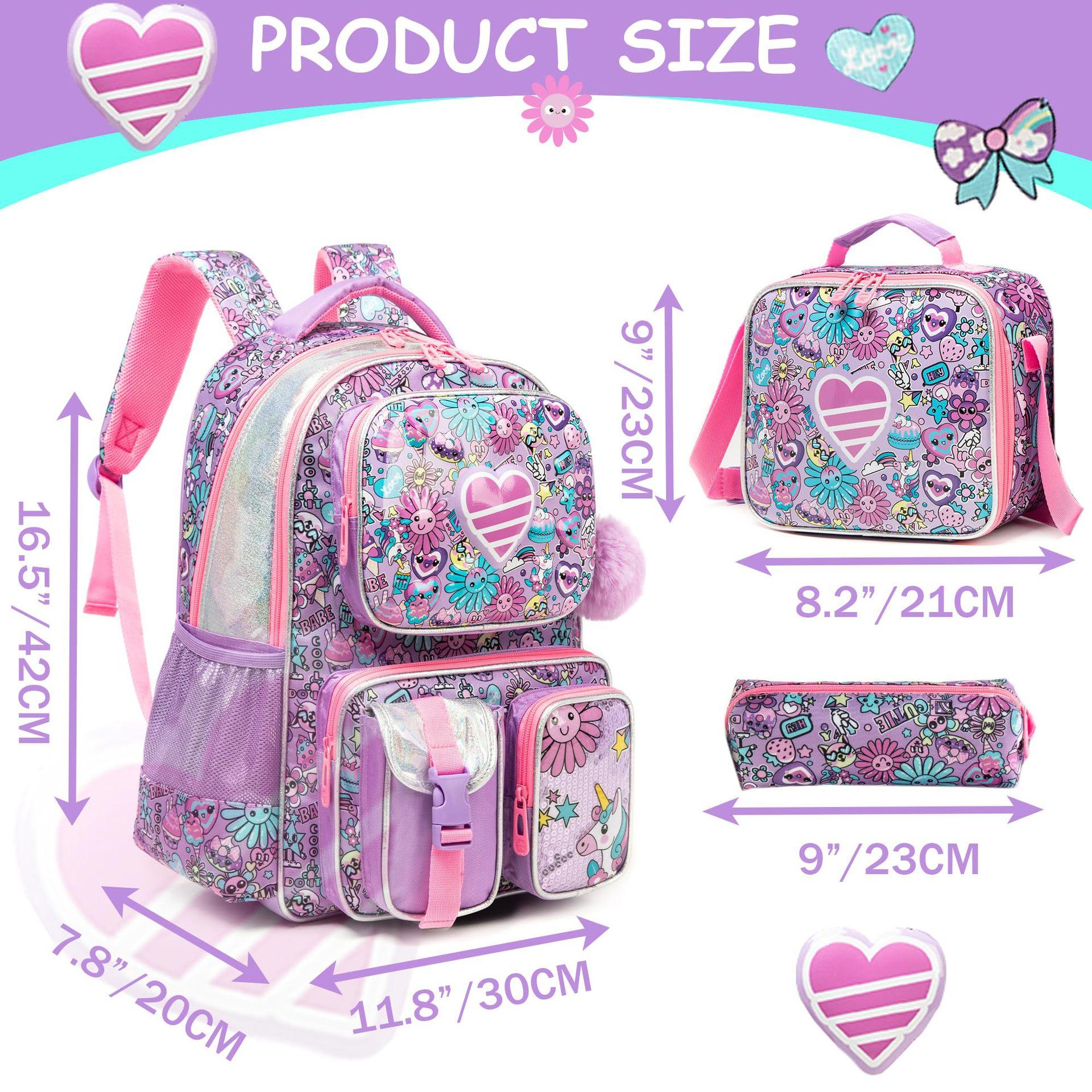 [Tamaño de mochila kawaii] Mochila: 45,8 cm x 27,8 cm x 19,4 cm Lonchera: 25,9 cm x 13,9 cm Estuche para lápices: 22,9 cm Incluye colgante de peluche de amor.