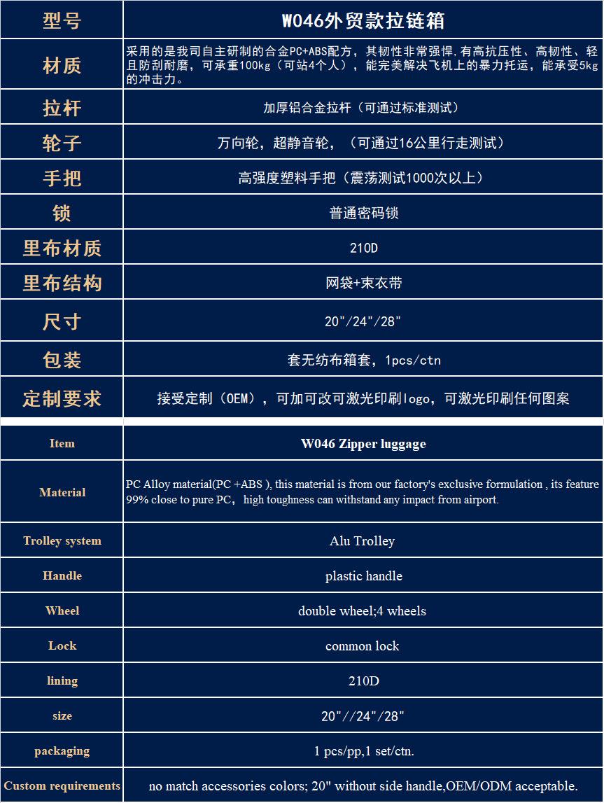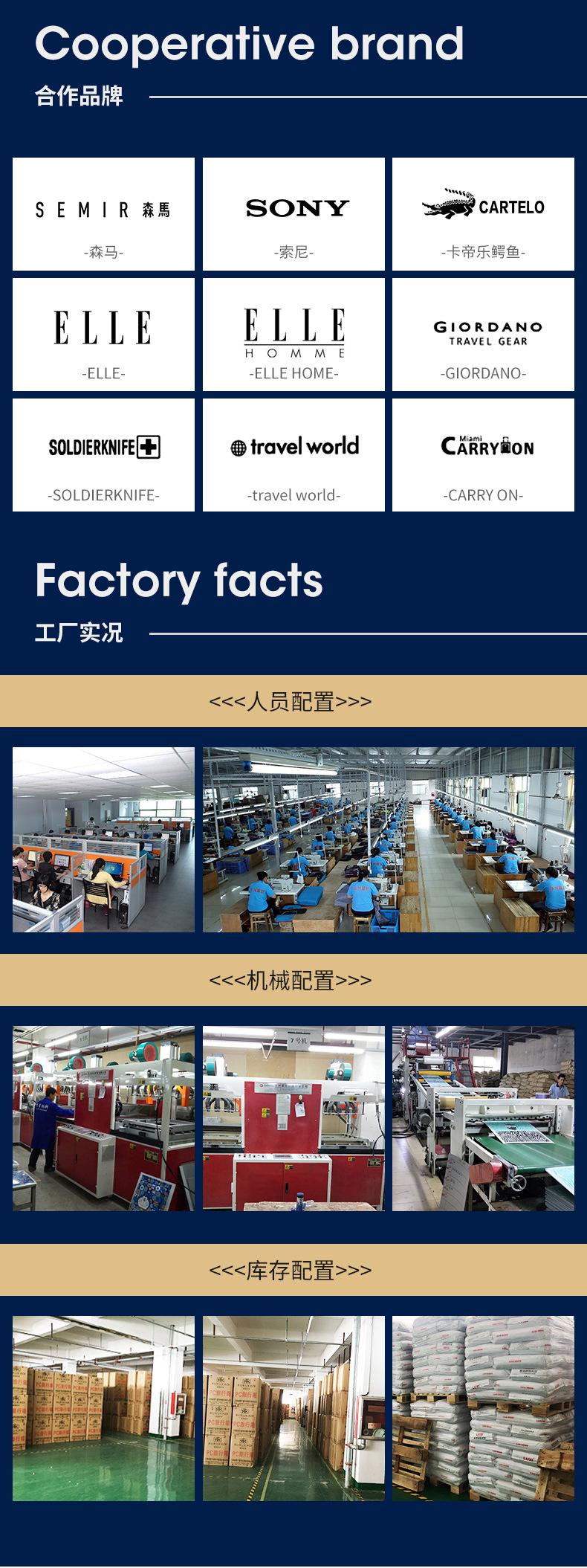1. Pedido de producto:La cantidad mínima de pedido para productos de maleta con ruedas es de 300 piezas. Si la cantidad requerida por el cliente es inferior a la cantidad mínima de pedido, el precio unitario se incrementará ligeramente. Por favor, comuníquese con el vendedor para obtener detalles.