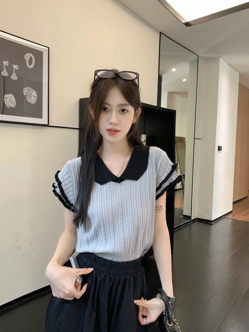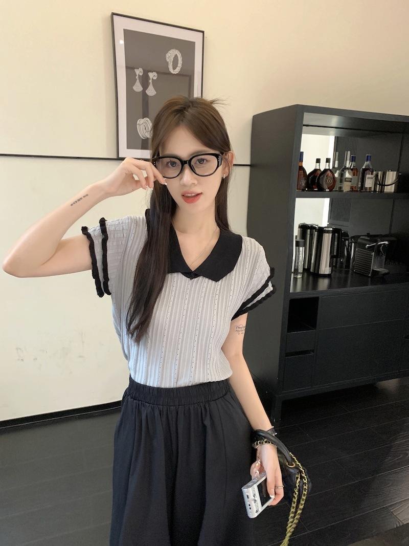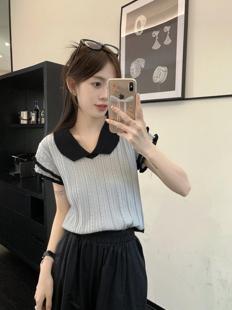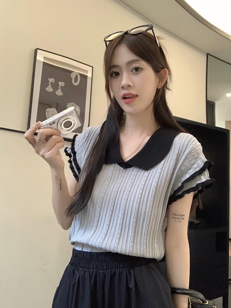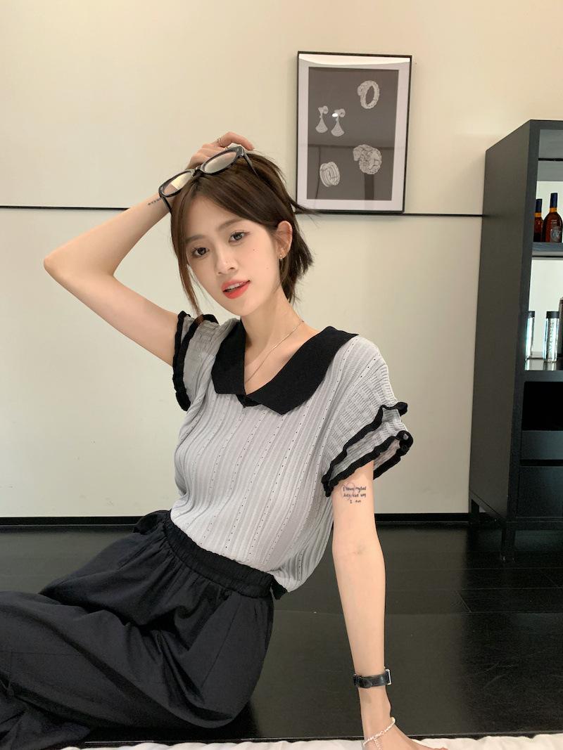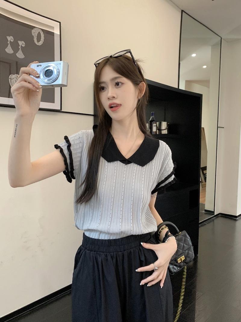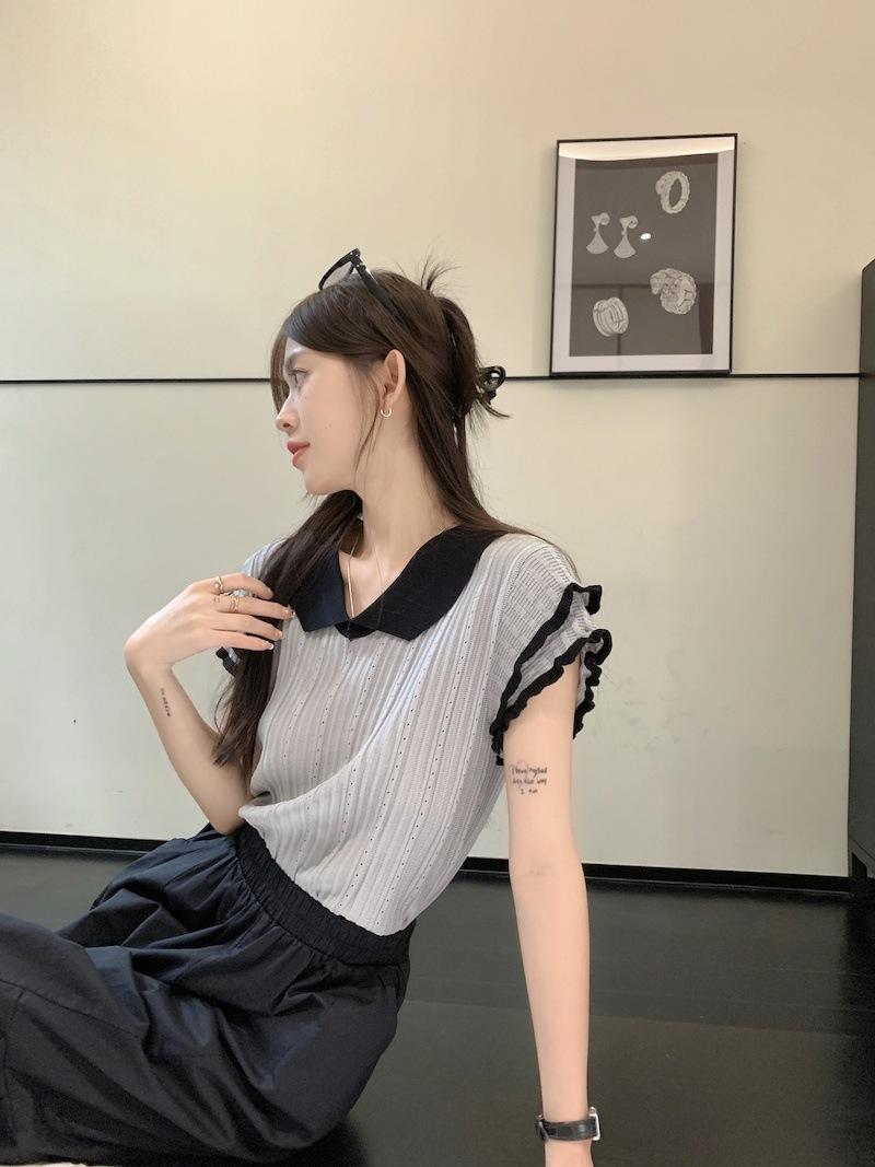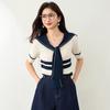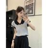 Suéter de Manga Corta con Borde Ondulado Estilo Francés Color en Contraste para Mujer Verano Nuevo Diseño Retro Sentido Solapa Delgado Corto