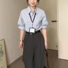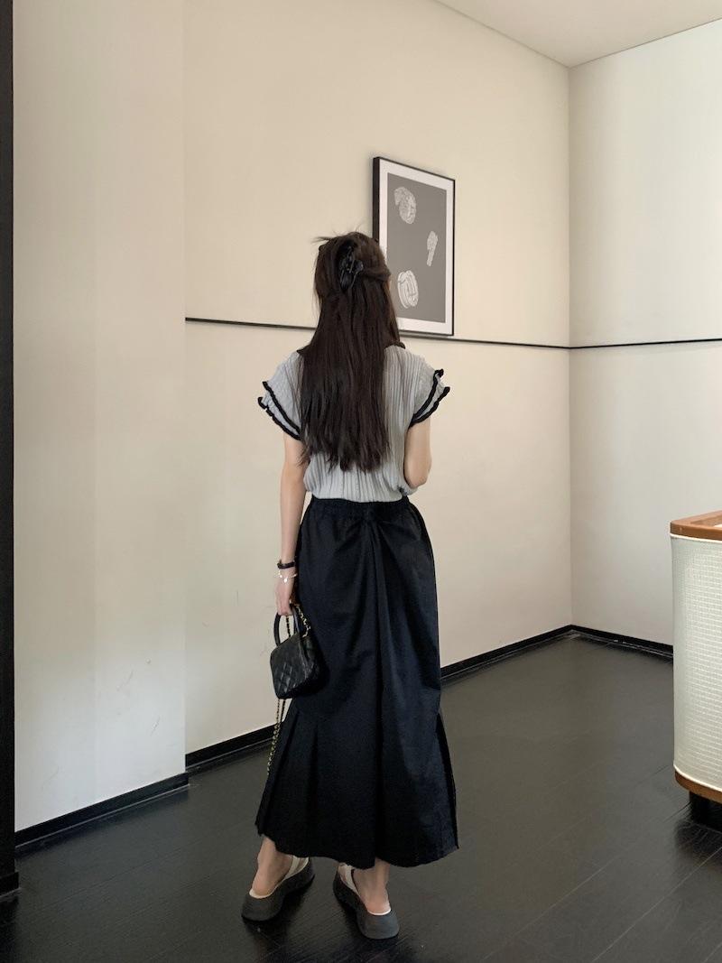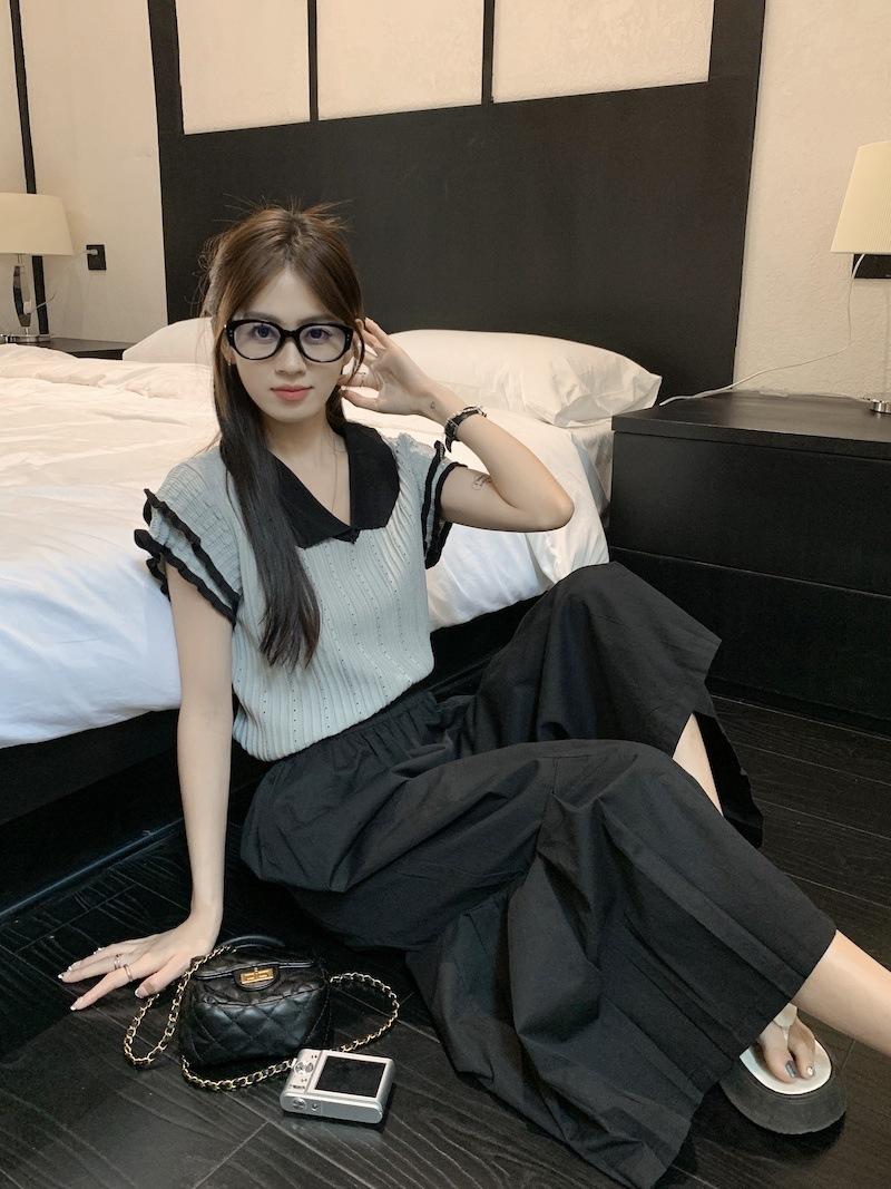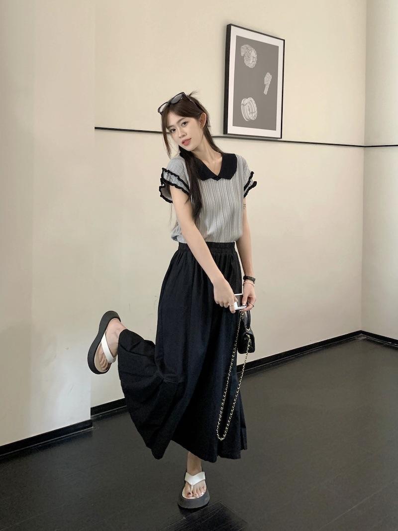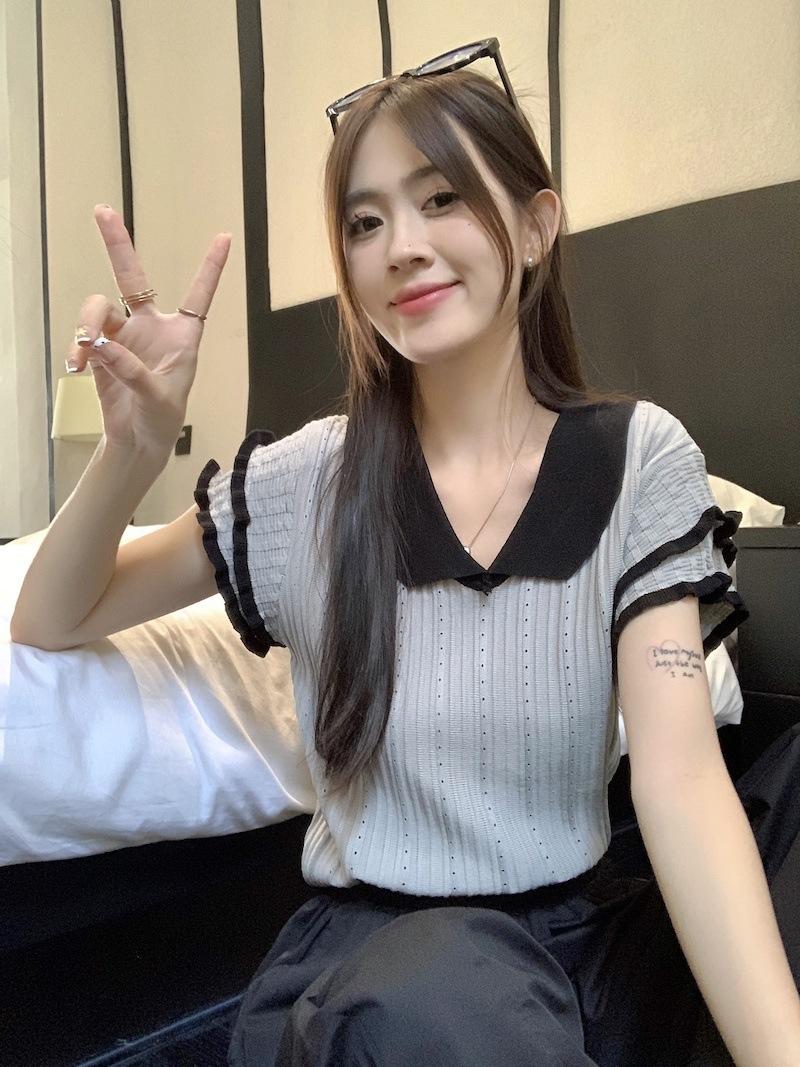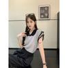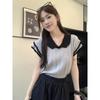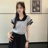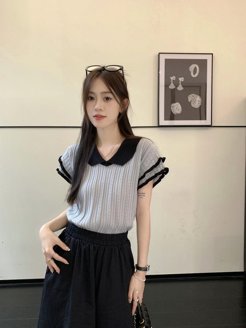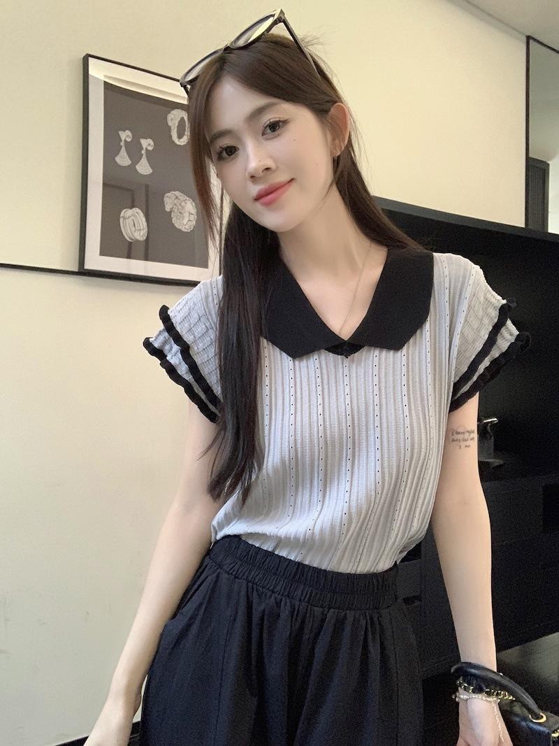 Suéter de Manga Corta con Borde Ondulado Estilo Francés Color en Contraste para Mujer Verano Nuevo Diseño Retro Sentido Solapa Delgado Corto