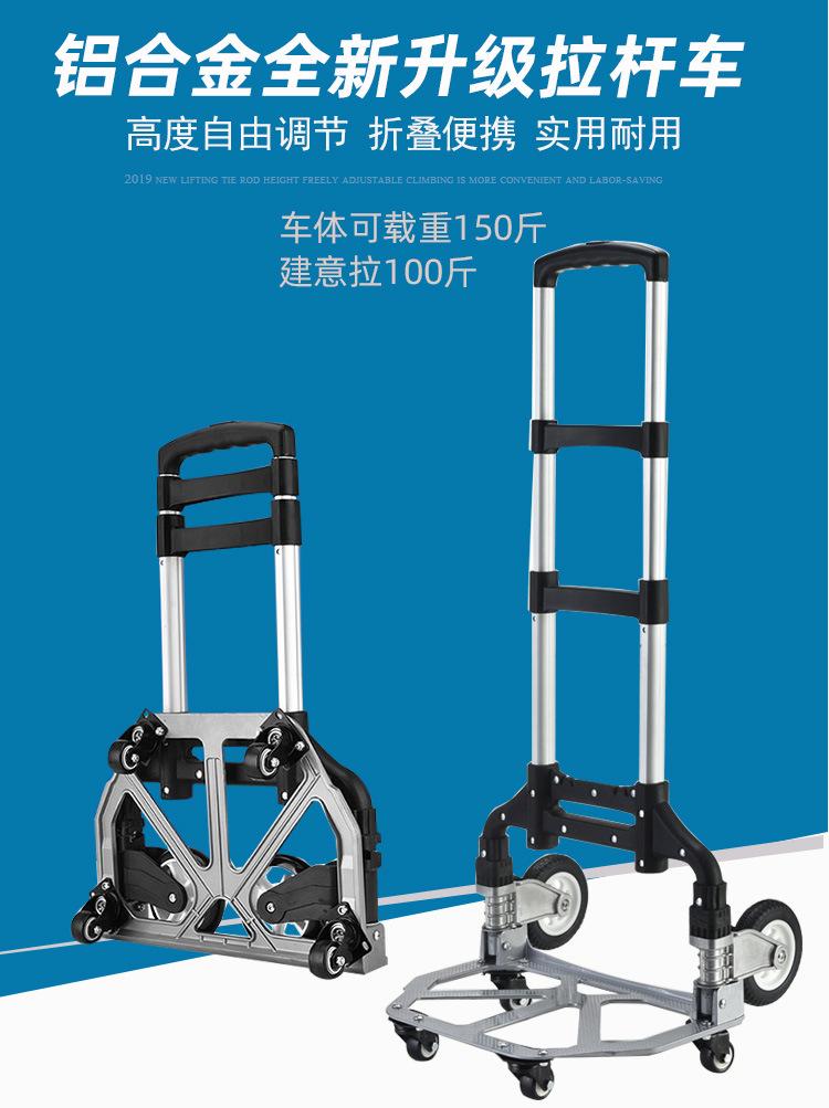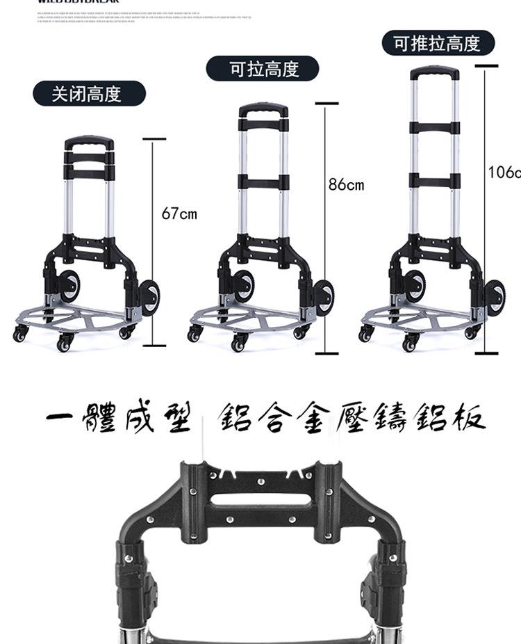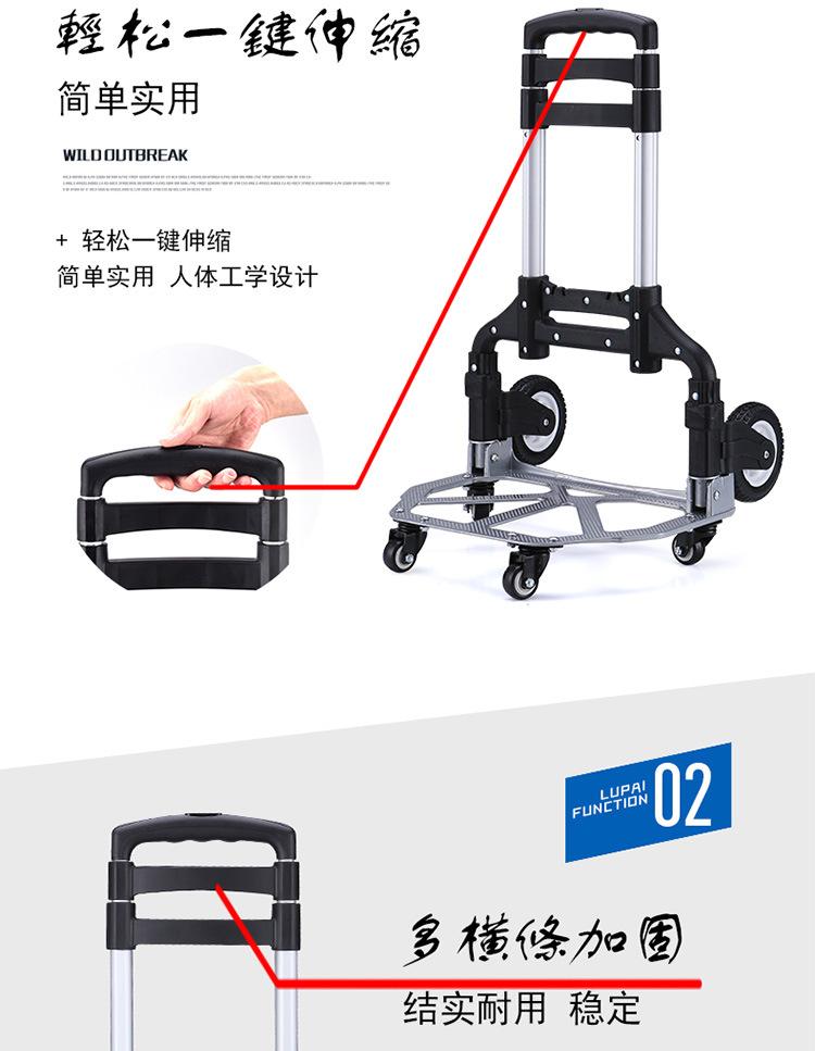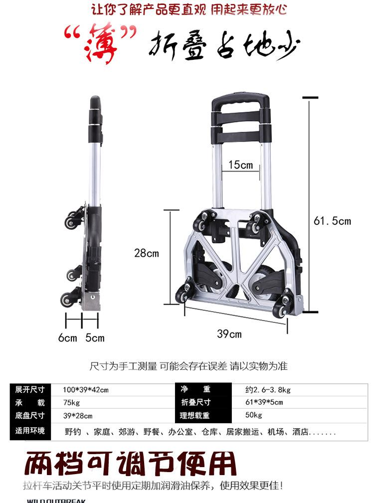Carrito de equipaje de venta directa de fábrica, volumen de ventas al por mayor de una pieza por consignación, por favor contacte al servicio al cliente, varilla de tracción de aleación de aluminio + base de aleación de aluminio + panel de plástico, rueda de goma mejorada + 4 ruedas pequeñas; modelo de producto 106-3A-4 modelo mejorado. Carga del cuerpo del carro 75 kg tamaño desplegado: 100*39*41cm tamaño plegado: 61.5*39*5cm
