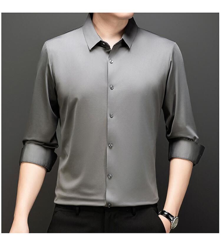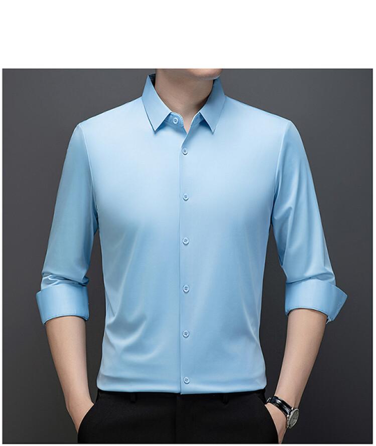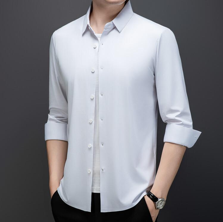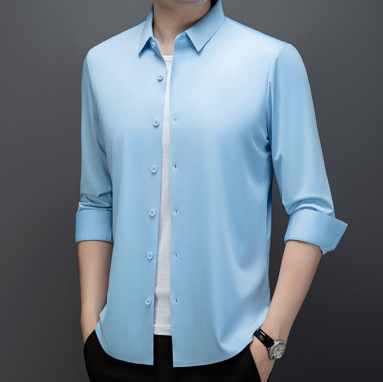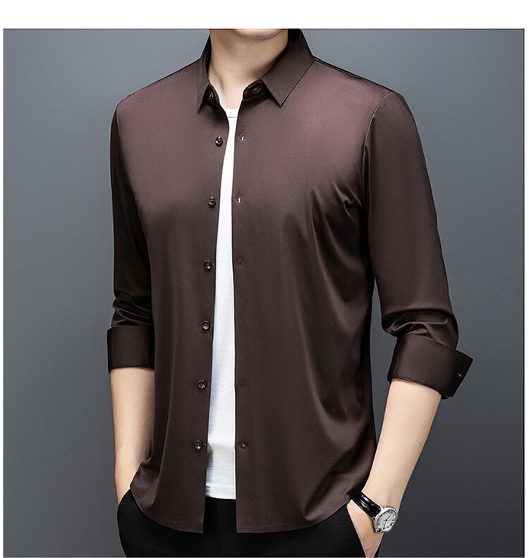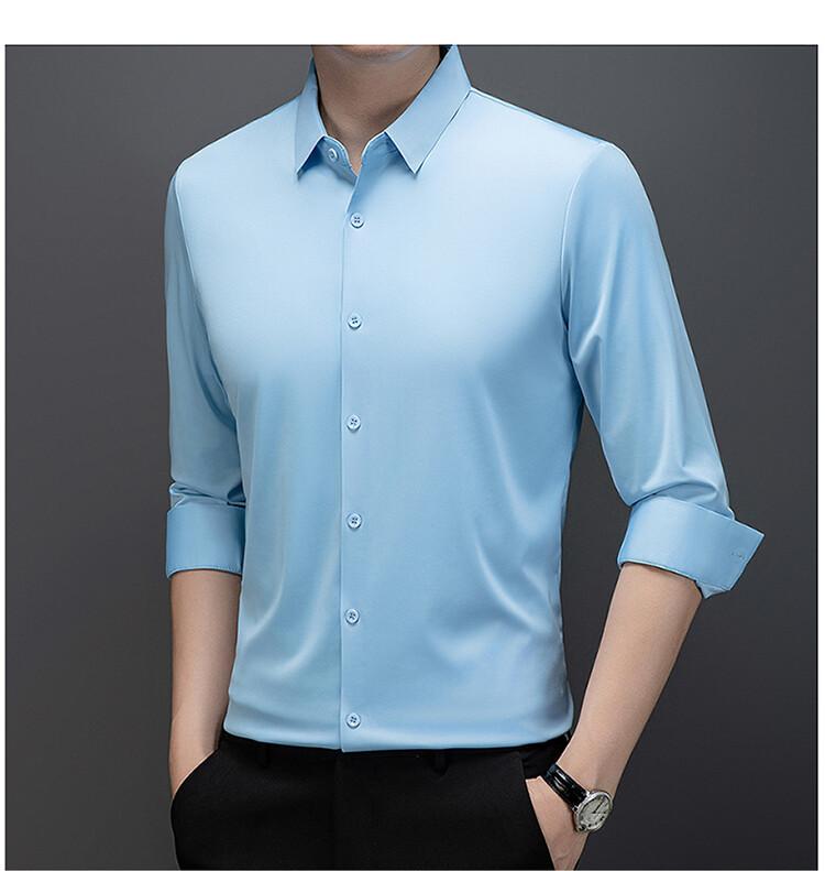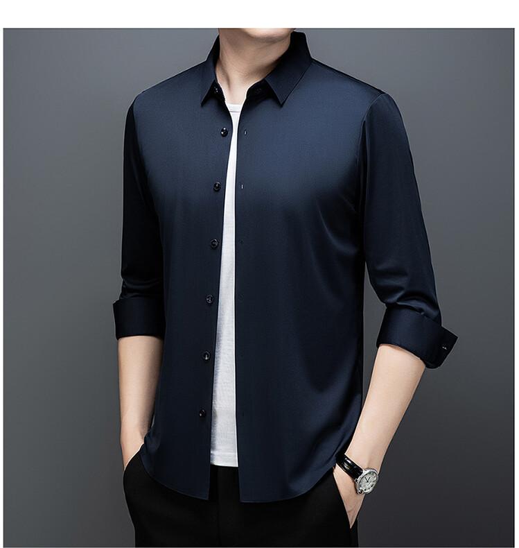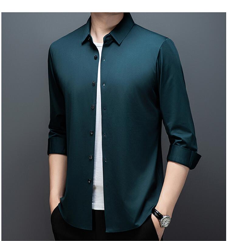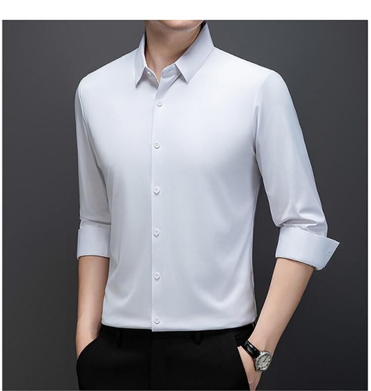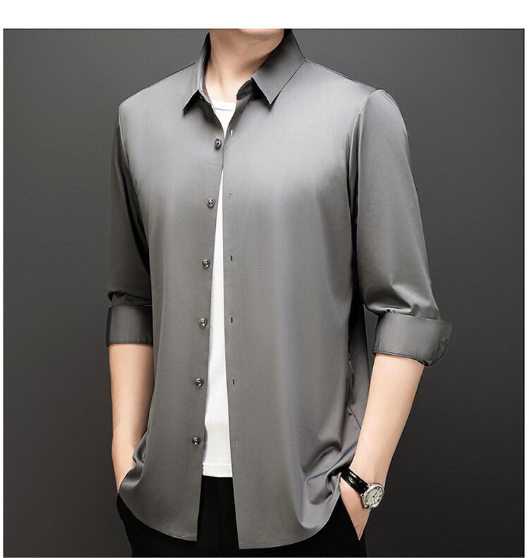 Camisa de manga larga fina y elástica de seda de hielo para hombre, informal, de primavera y otoño, para negocios, sin planchado, de color liso, para trabajo