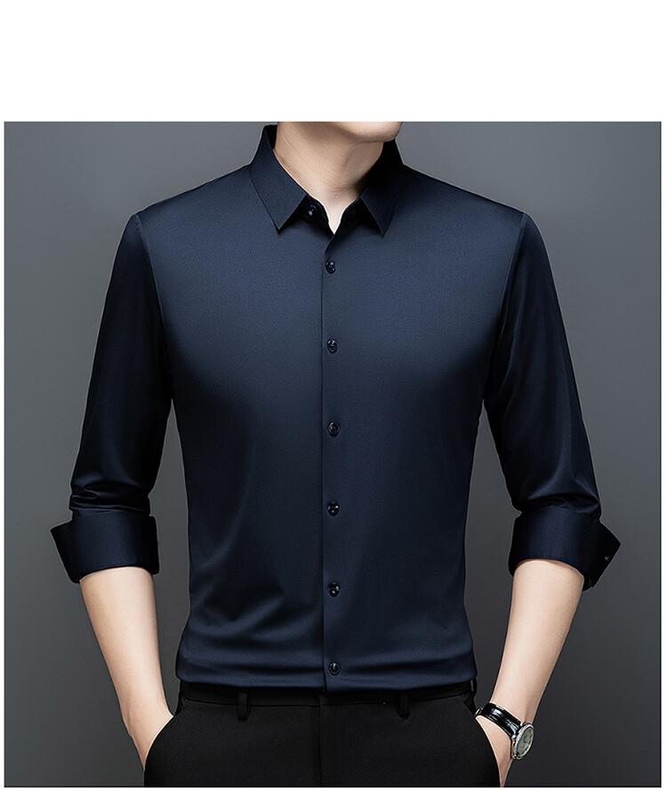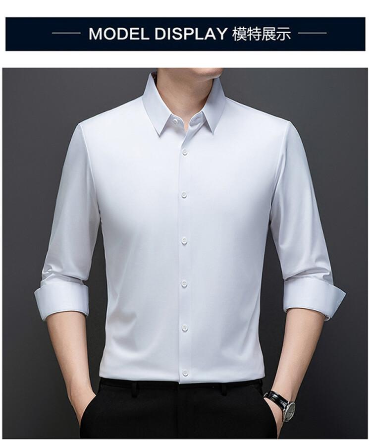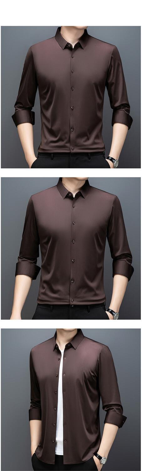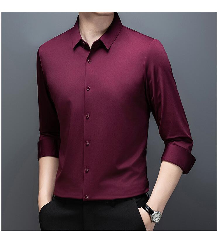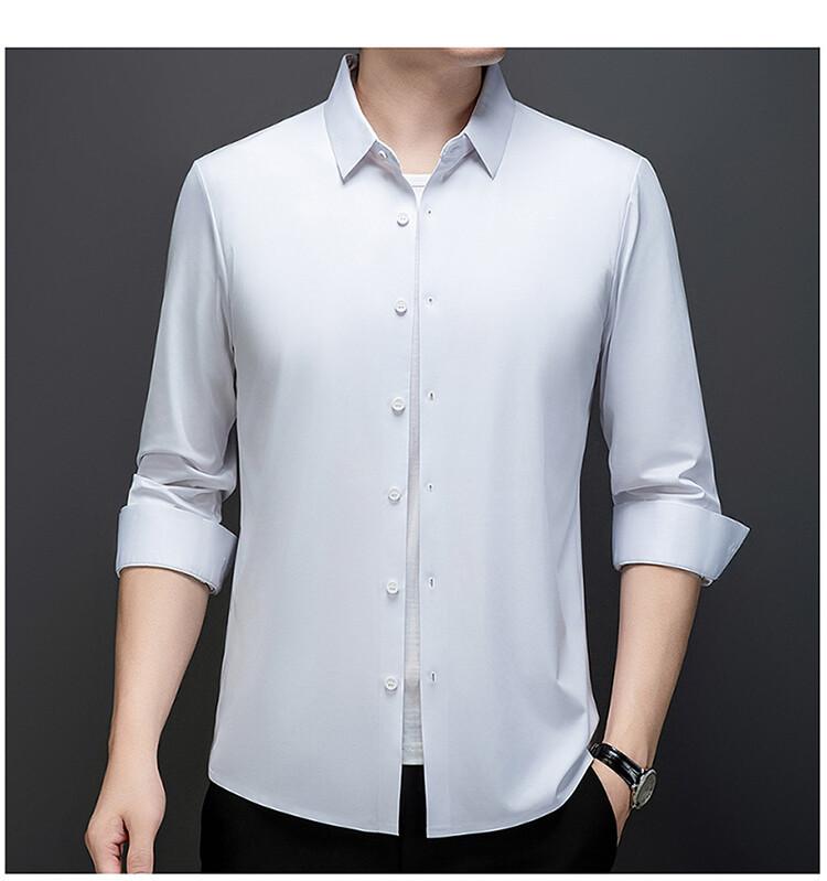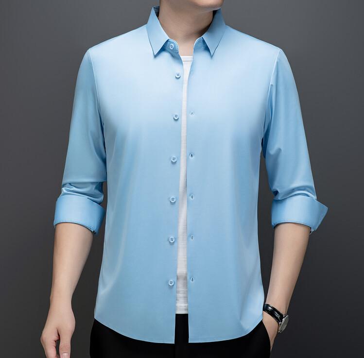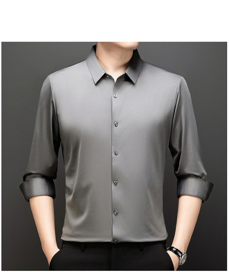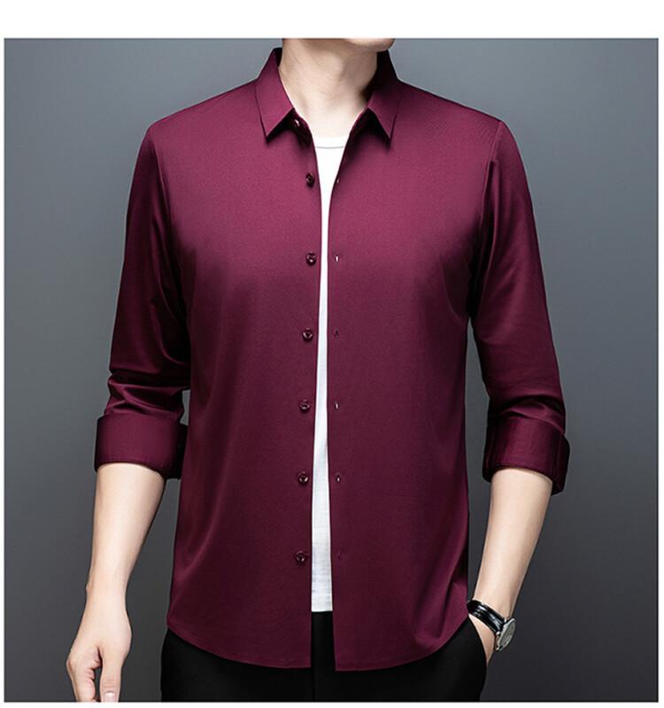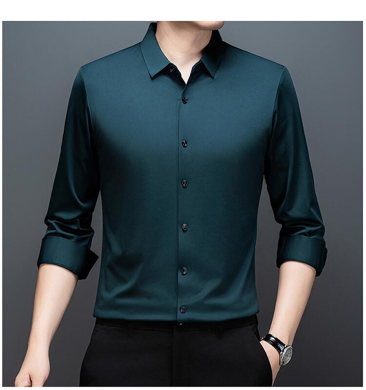 Camisa de manga larga fina y elástica de seda de hielo para hombre, informal, de primavera y otoño, para negocios, sin planchado, de color liso, para trabajo