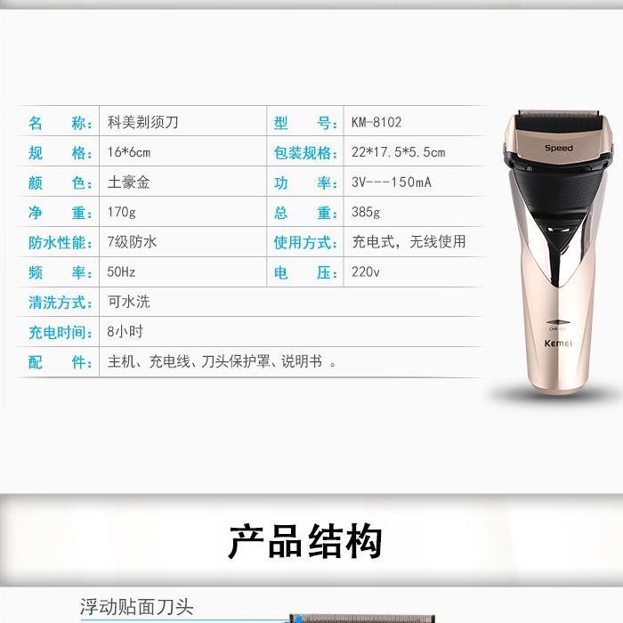 Maquinilla de afeitar eléctrica lavable Kemei Razor KM-8102 para hombre con cuerpo reciprocante