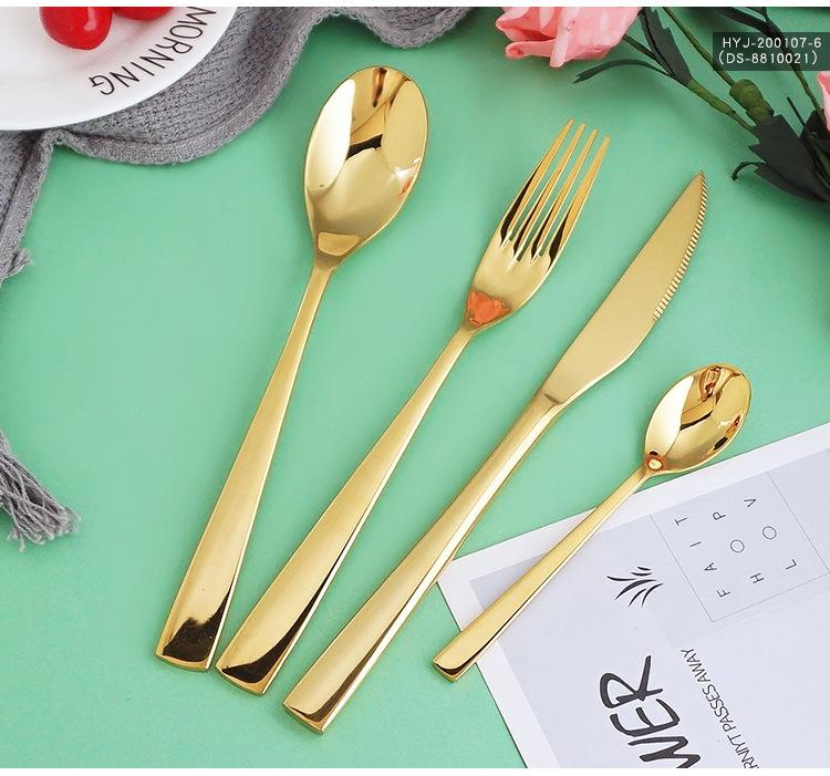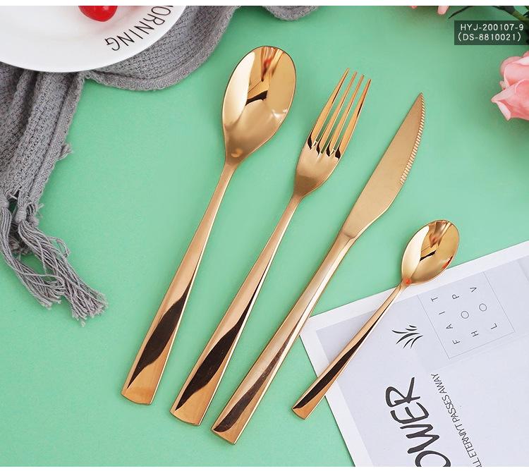 | Suministro directo de fábrica de vajilla Junneng, vajilla de acero inoxidable 304, cuchillo, tenedor, cuchara, cucharilla de té chapados en titanio, juego de vajilla elegante |