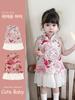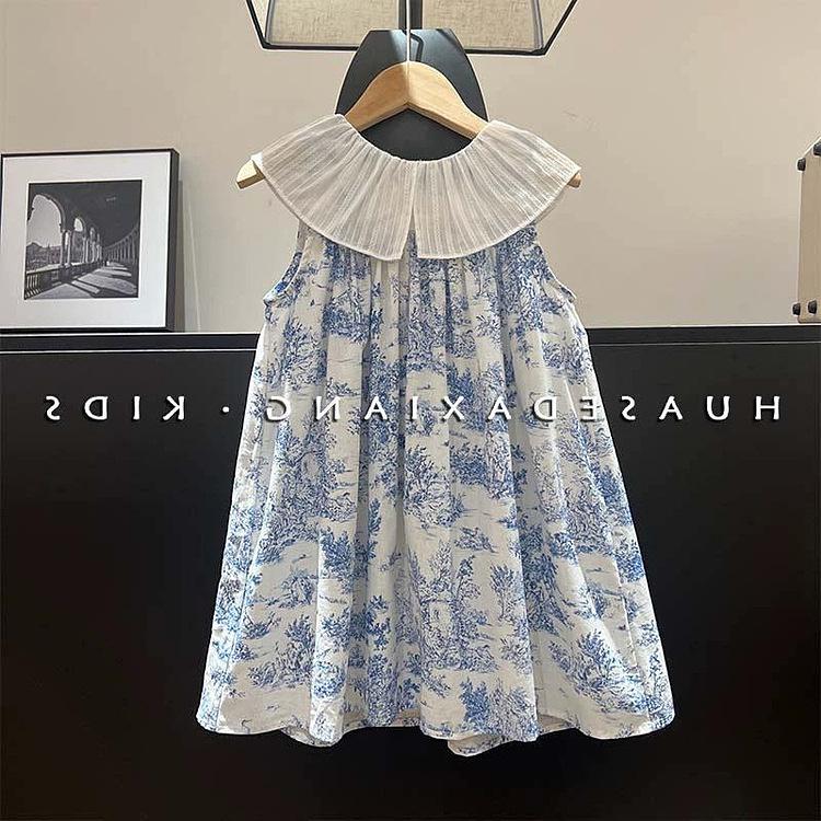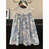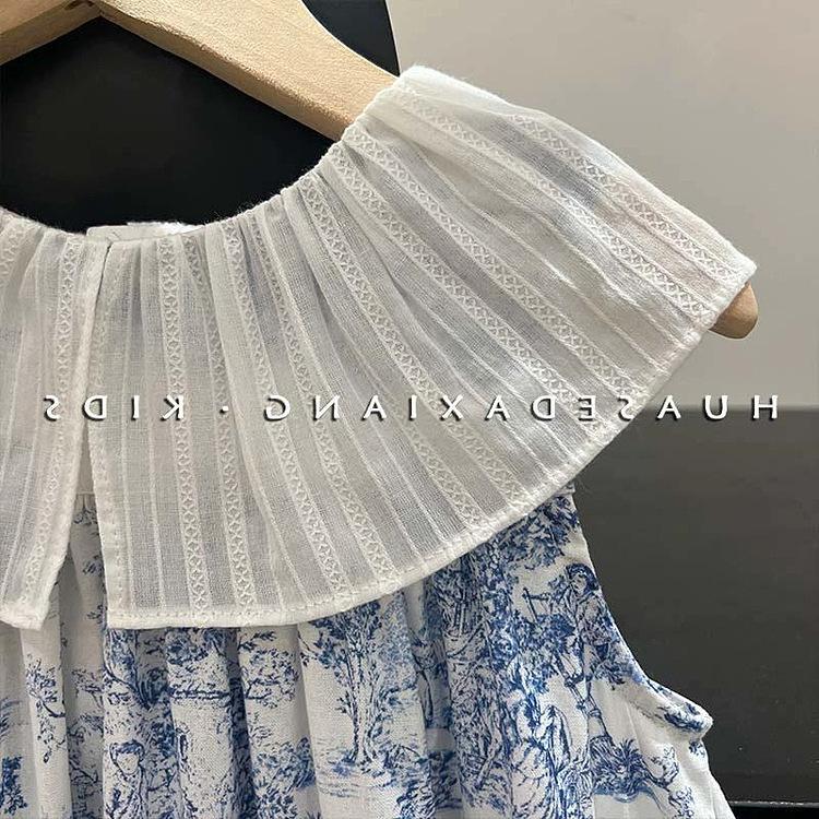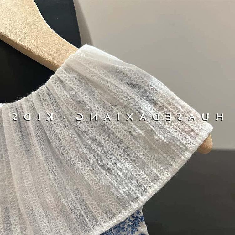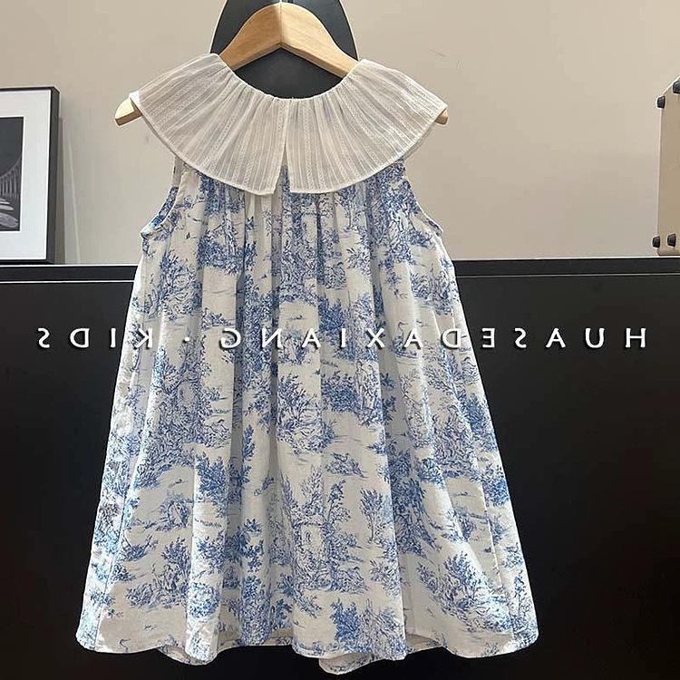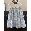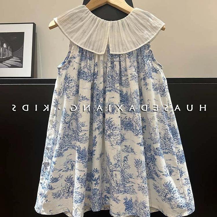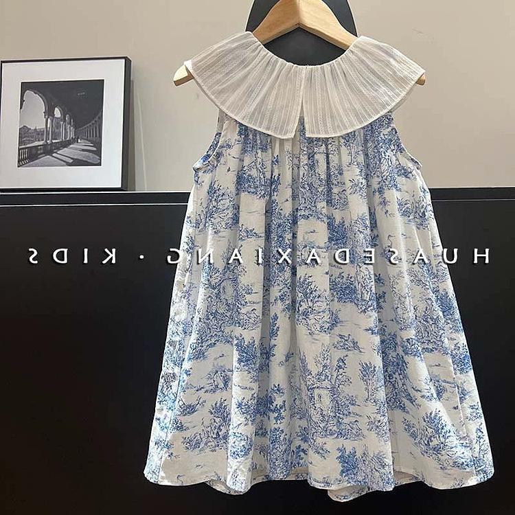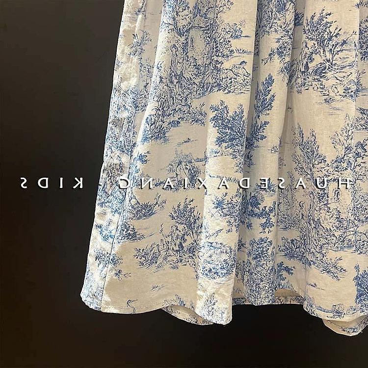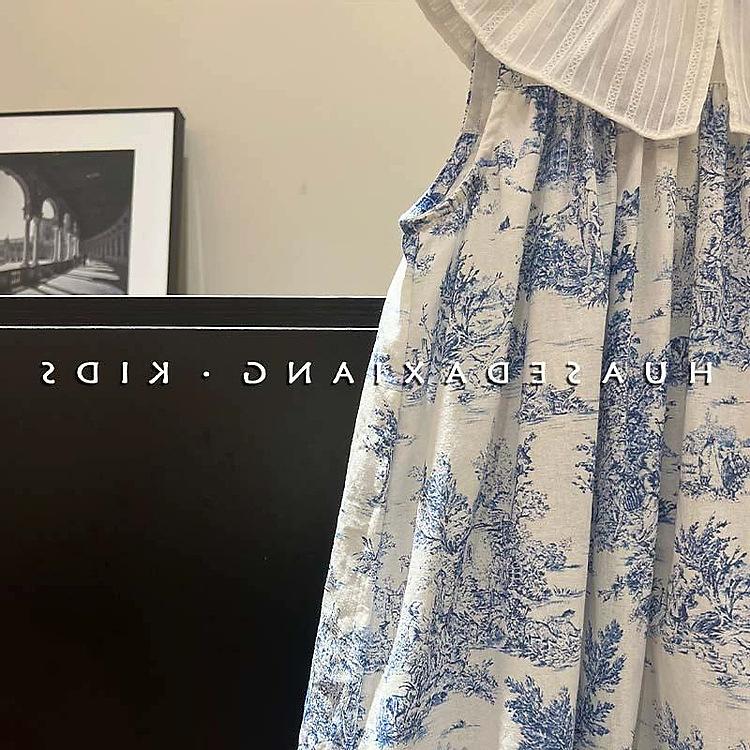 Vestido de Verano Nuevo Estilo 2025 para Niñas Estilo Chino Estampado Estilo Bosque Falda con Solapa Vestido para Niños