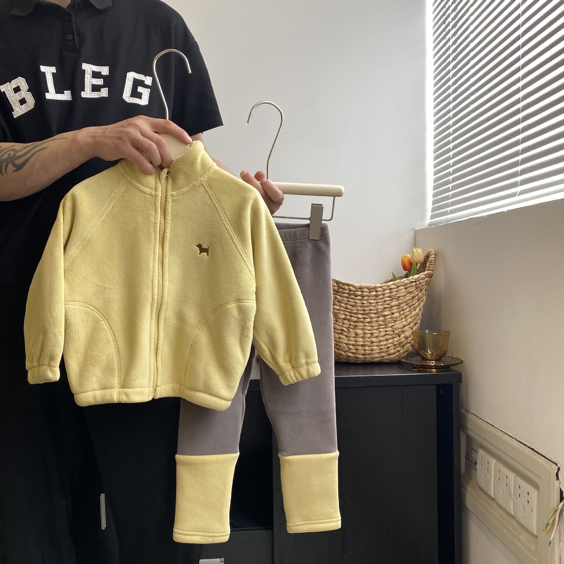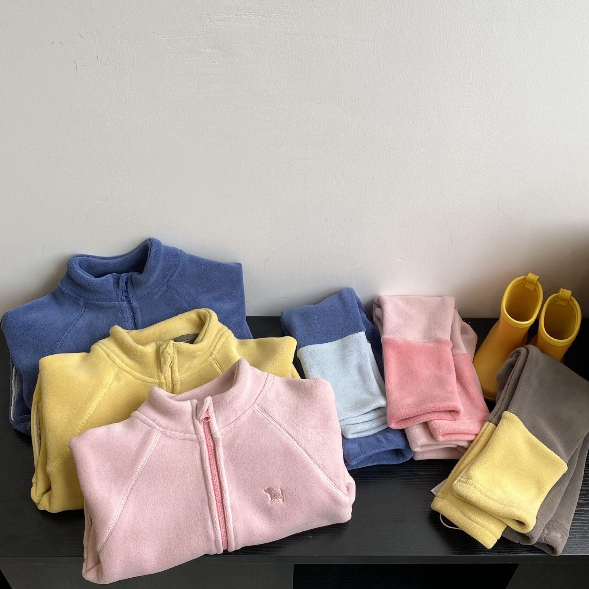 Pink coat, Blue coat, Yellow coat, Khaki and yellow leggings, Blue and light blue leggings, Light pink and pink leggings