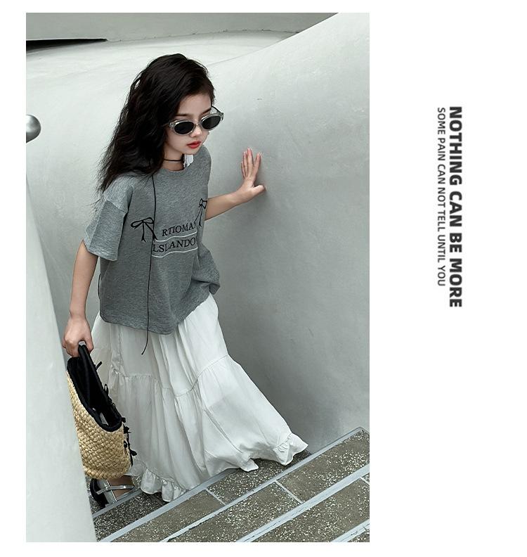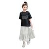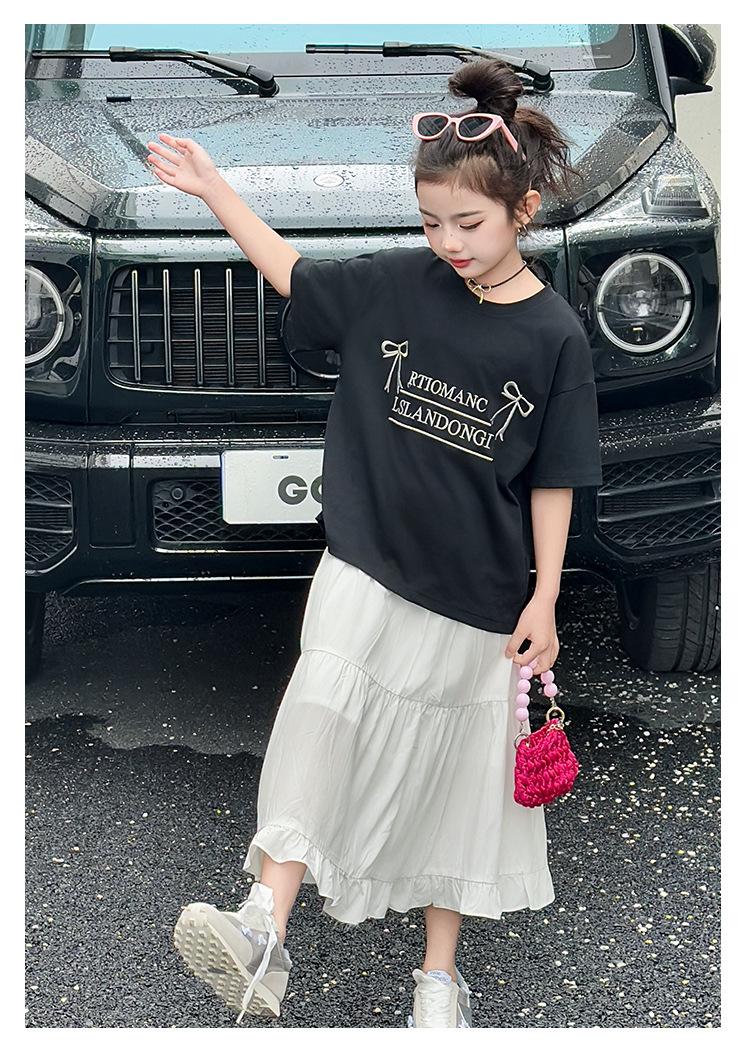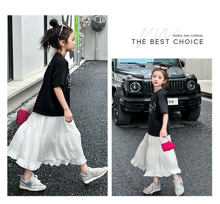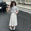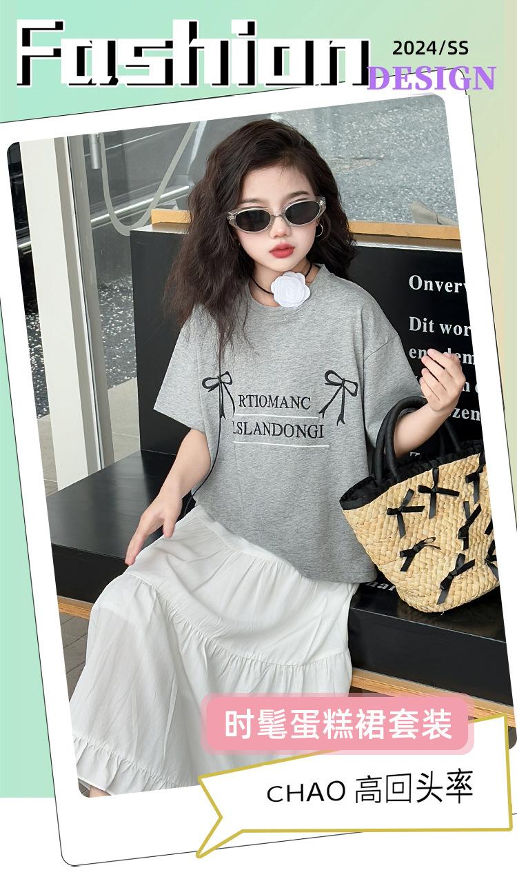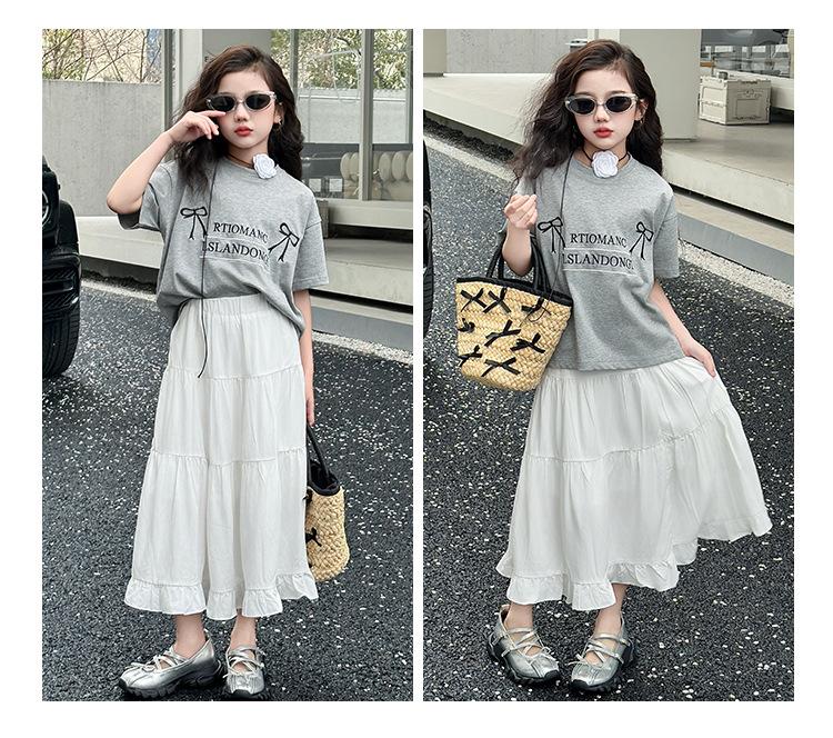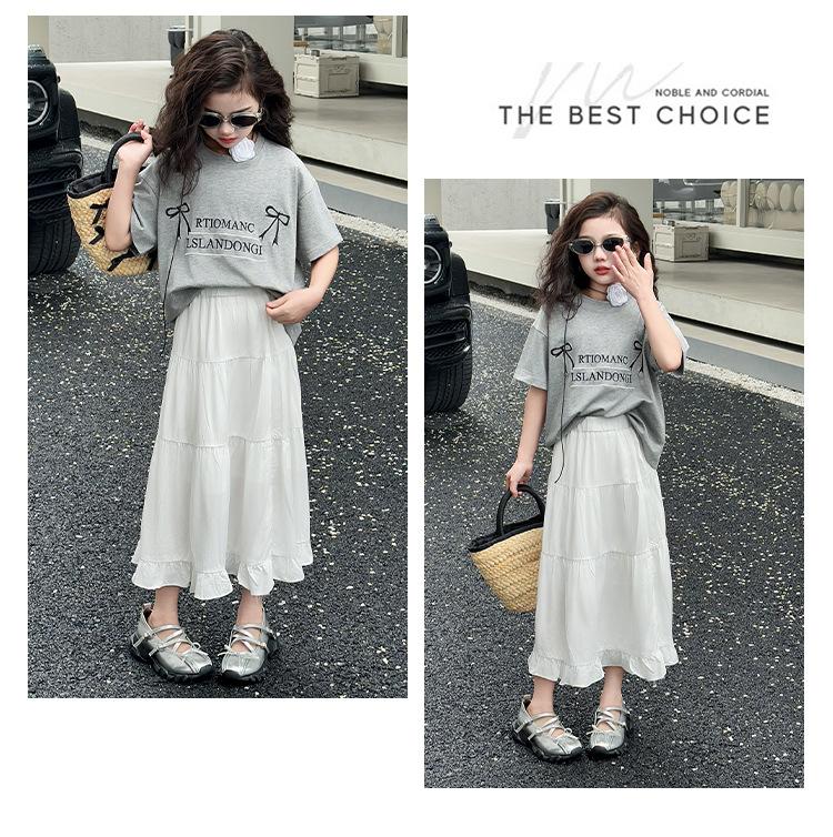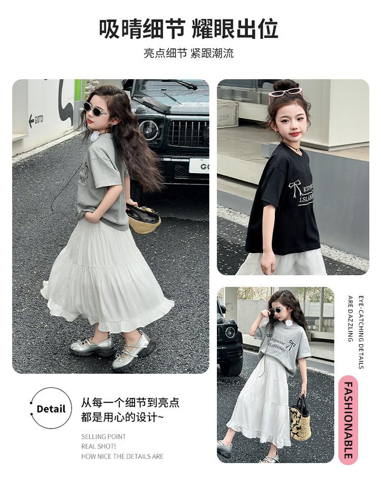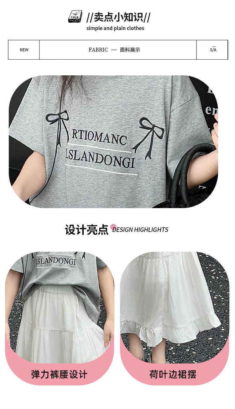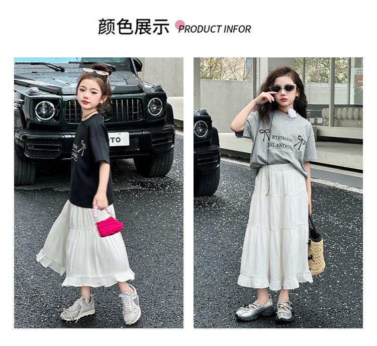 Traje de verano para niñas 2024, nuevo estilo occidental, conjunto de dos piezas fino de moda de verano para niñas de talla mediana a grande, con falda de media longitud y manga corta