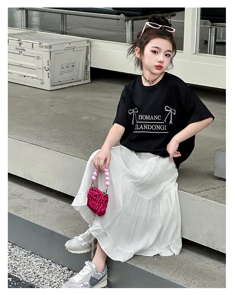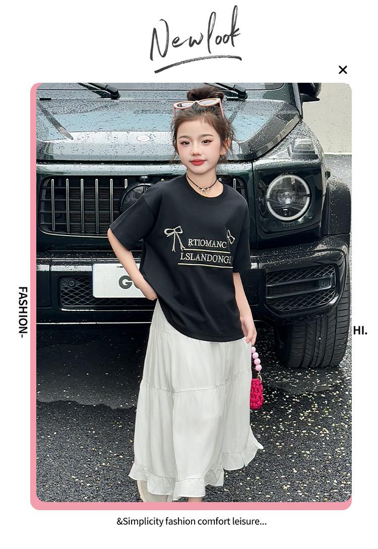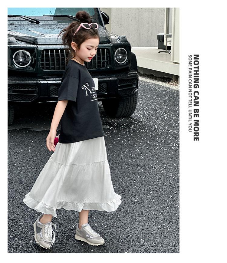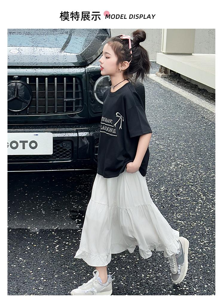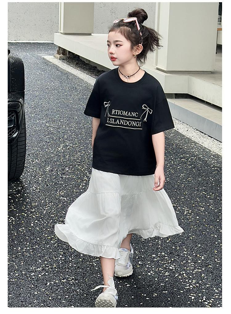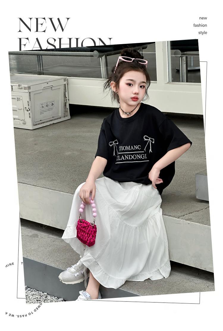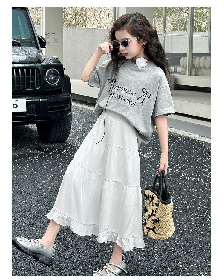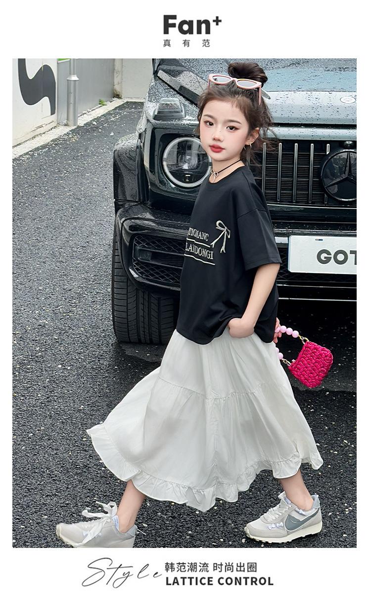 Traje de verano para niñas 2024, nuevo estilo occidental, conjunto de dos piezas fino de moda de verano para niñas de talla mediana a grande, con falda de media longitud y manga corta