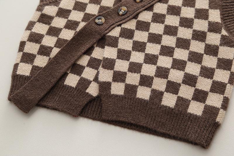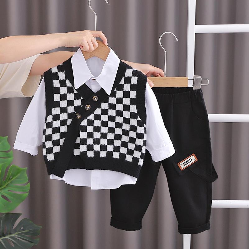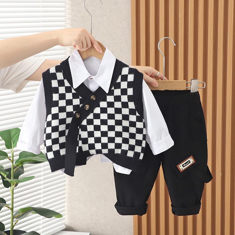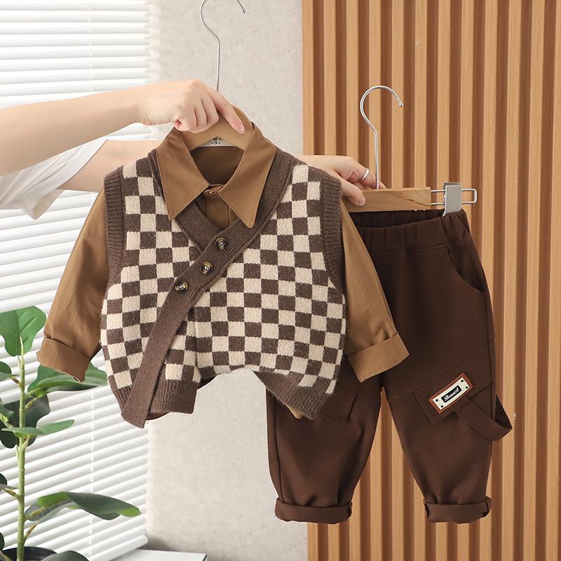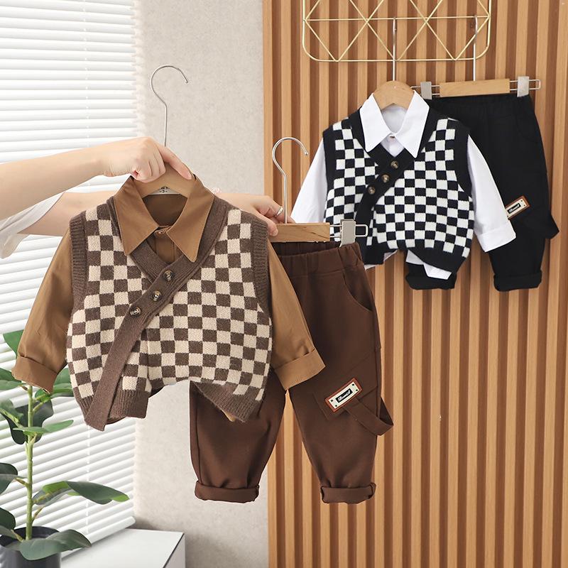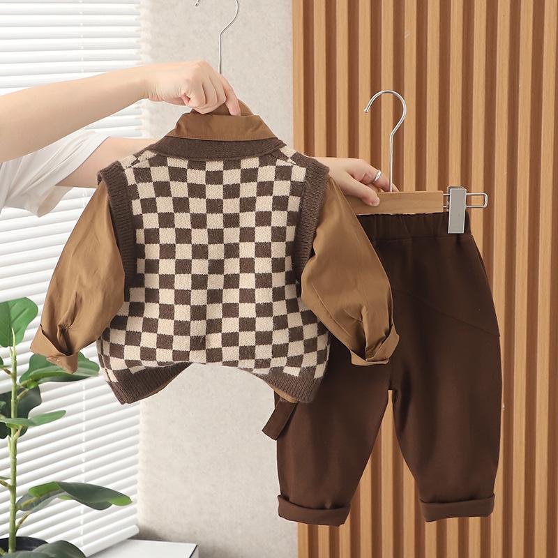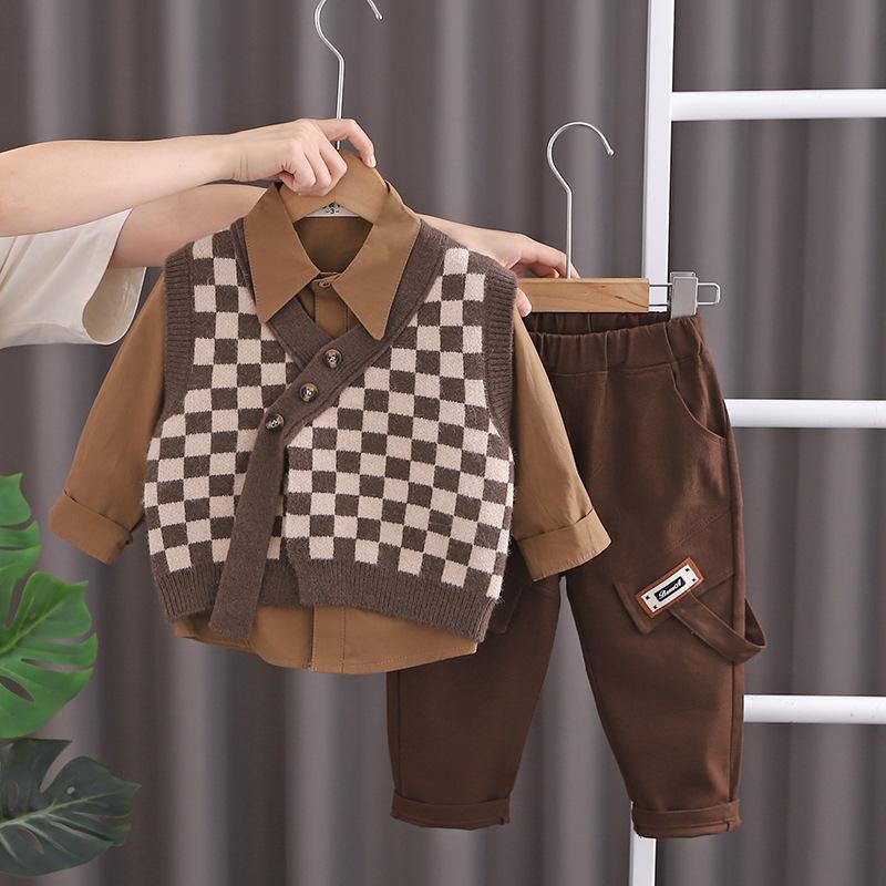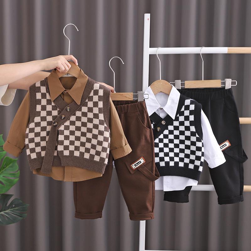 Ropa de otoño para bebé suéter para niño traje de cinta a cuadros 2023 nuevo estilo occidental ropa casual de tres piezas para bebé y niño
