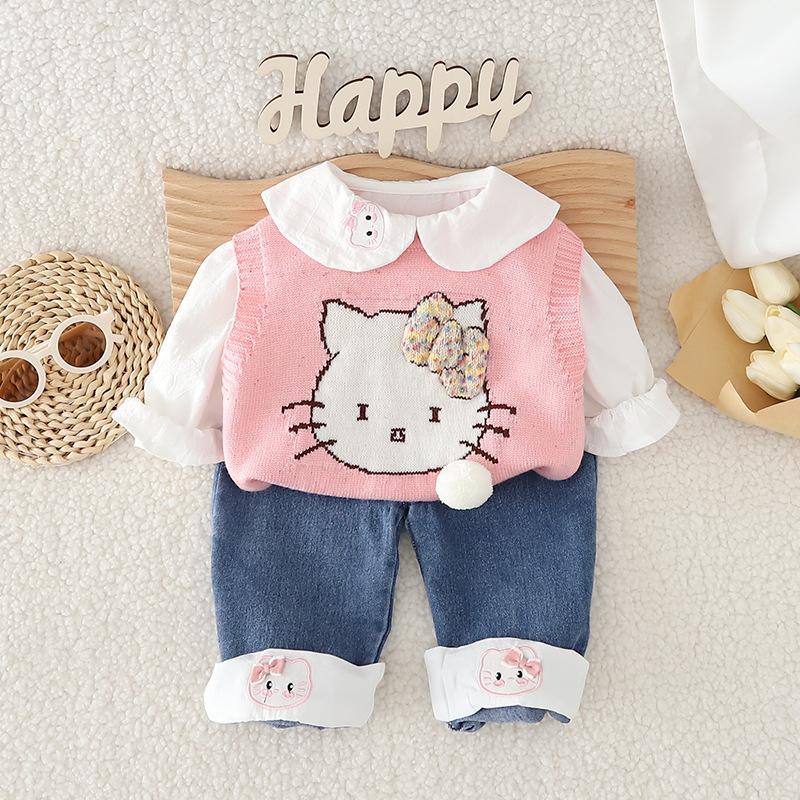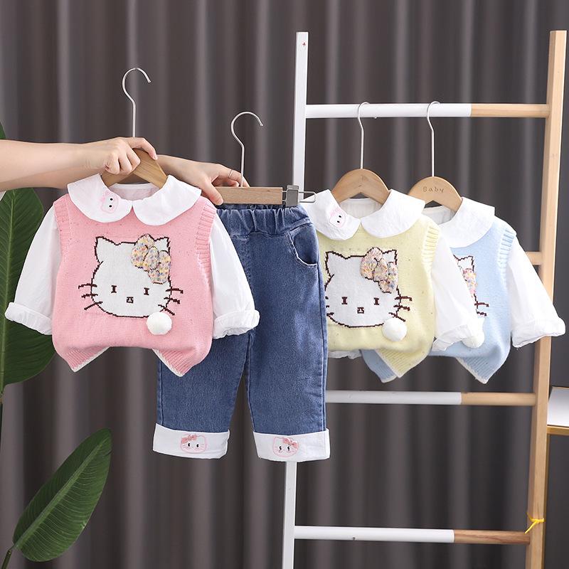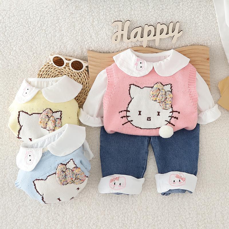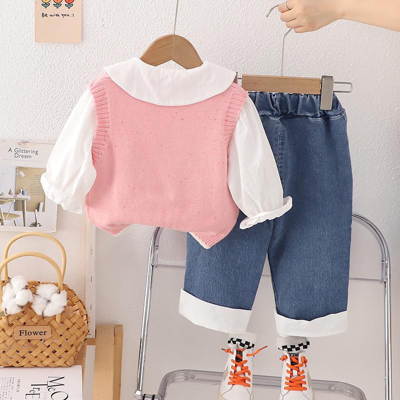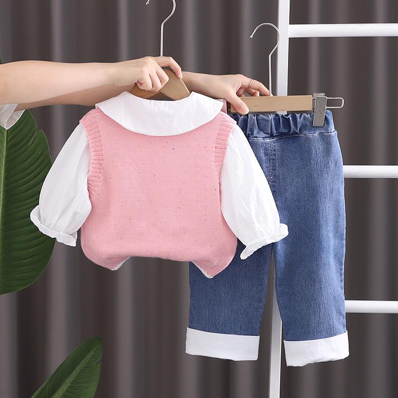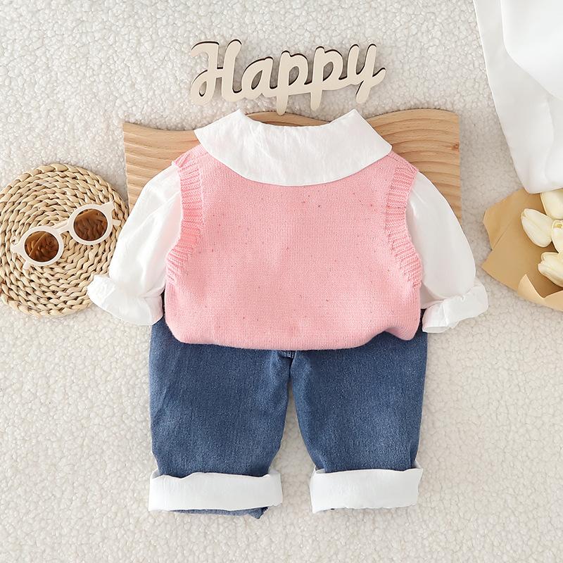 Traje de niña otoño nuevo estilo ropa de bebé princesa lazo suéter chaleco conjunto de tres piezas