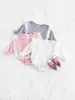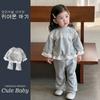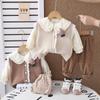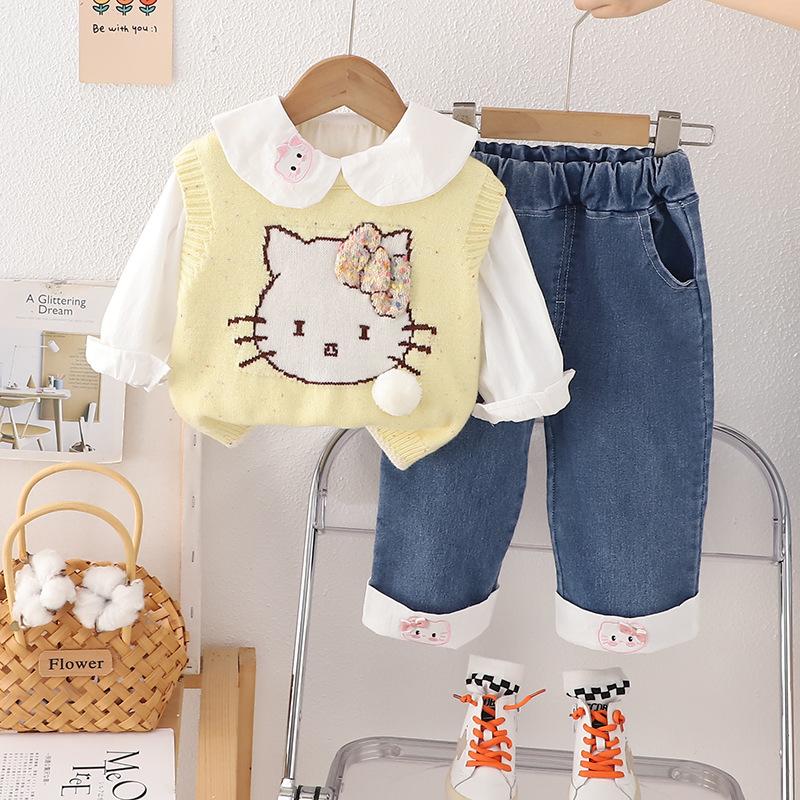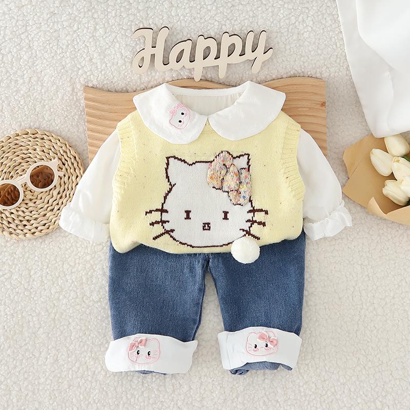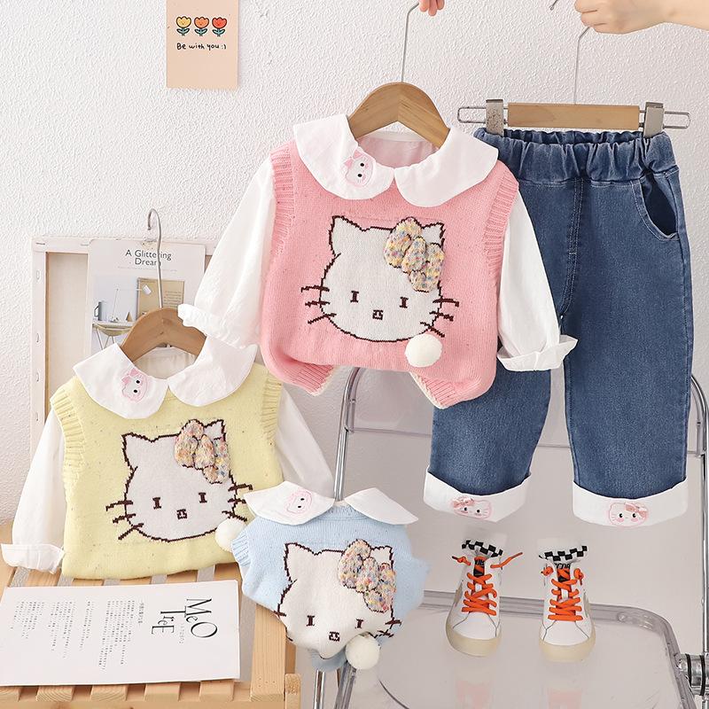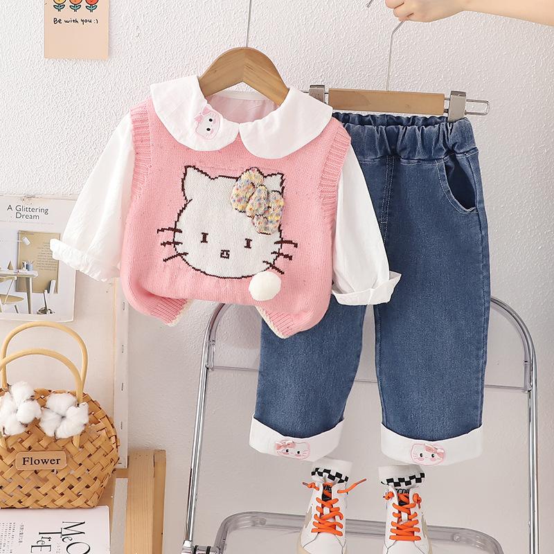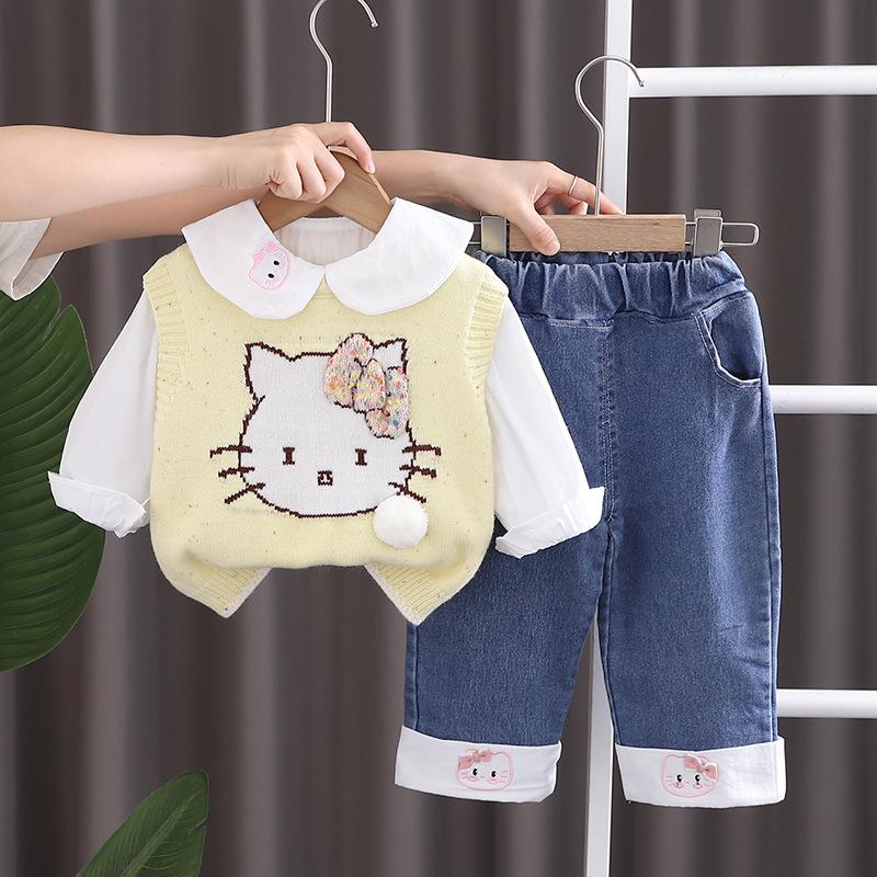 Traje de niña otoño nuevo estilo ropa de bebé princesa lazo suéter chaleco conjunto de tres piezas
