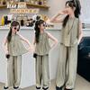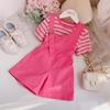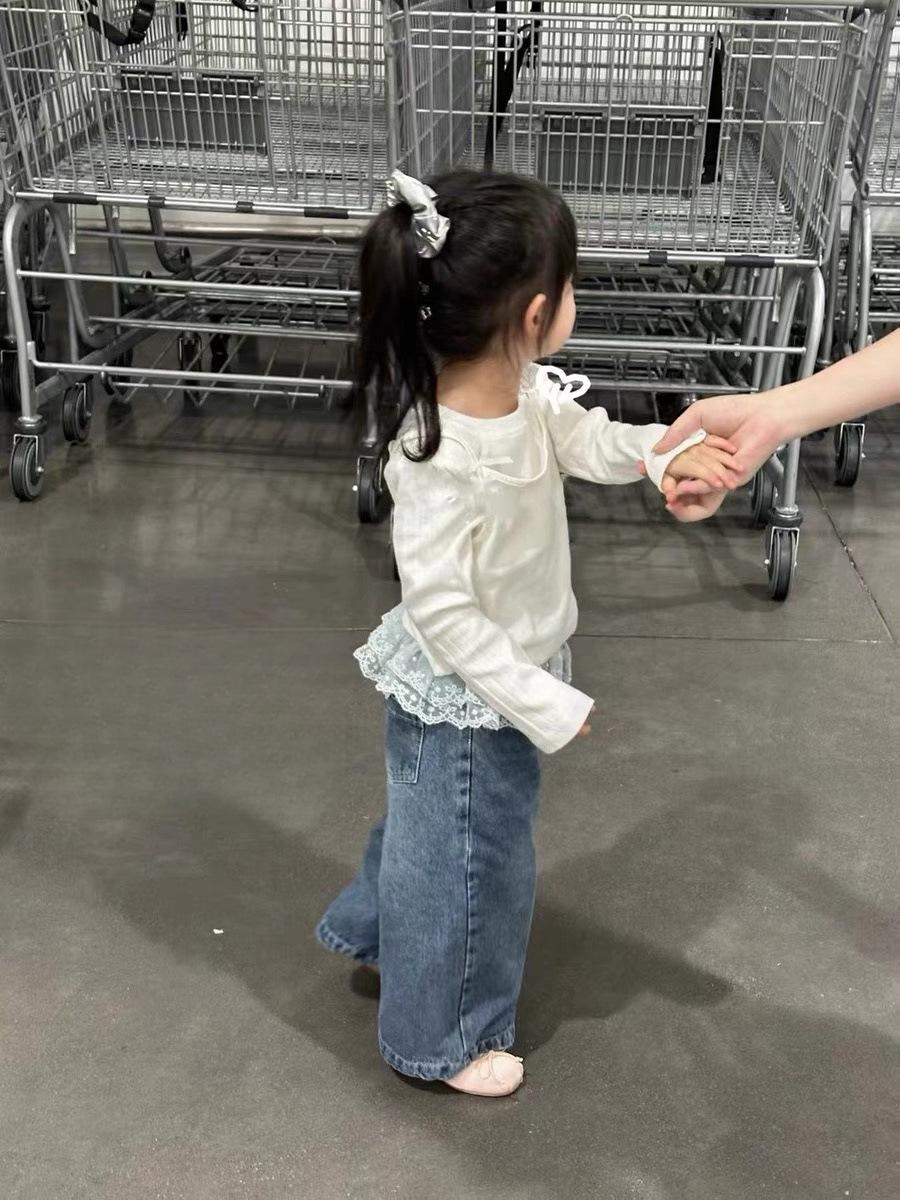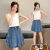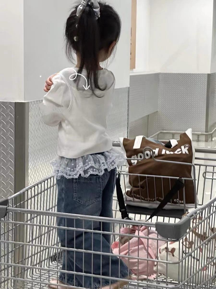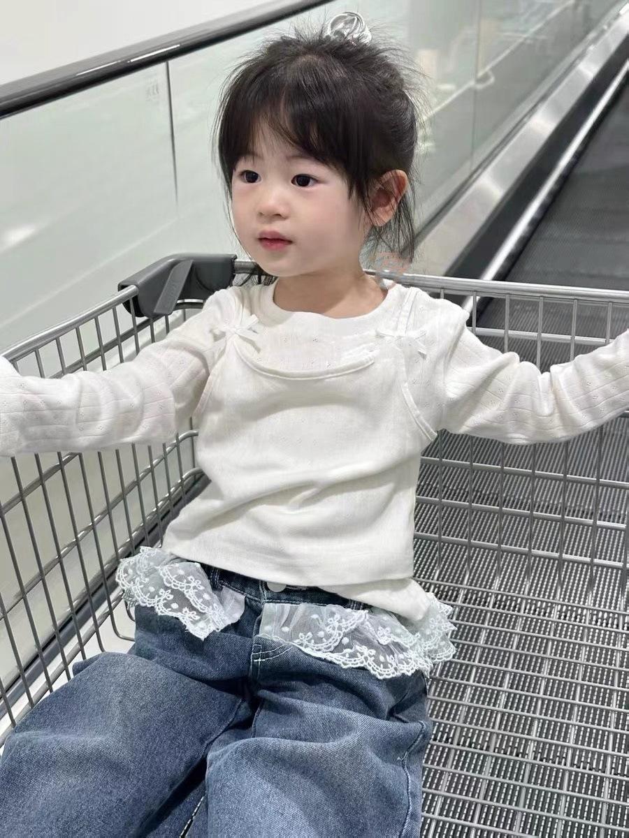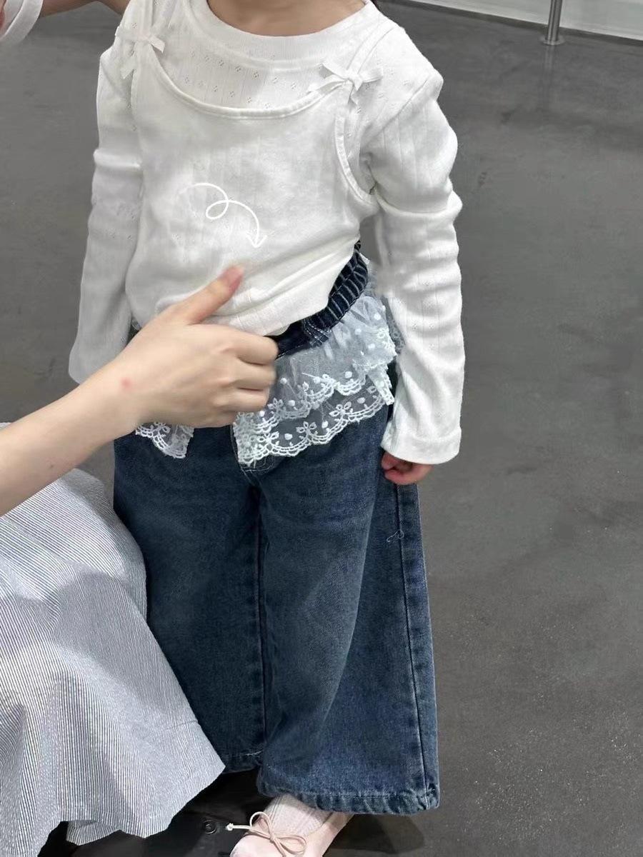 Traje de niña de color lima para otoño de 2024, dulce, de manga larga, con tirantes apilados, de dos piezas, con encaje y vaqueros.