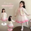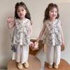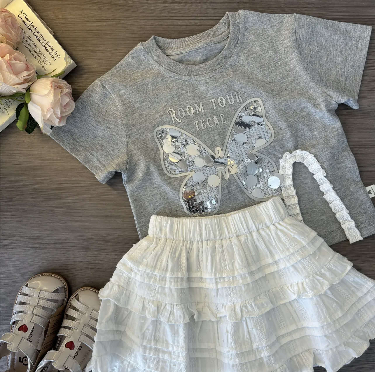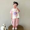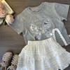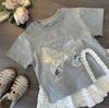 Traje Crema para Niñas 2025 Ropa Nueva de Verano Camiseta de Manga Corta con Lazo para Niños Faldas de Encaje Estilo Occidental Conjunto de Dos Piezas
