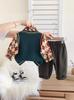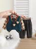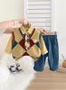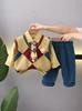 Traje de primavera y otoño para niño 2024, nuevo estilo occidental, para bebés de 1 a 3 años, suéter, chaleco, camisa, conjunto de tres piezas para el cabello.