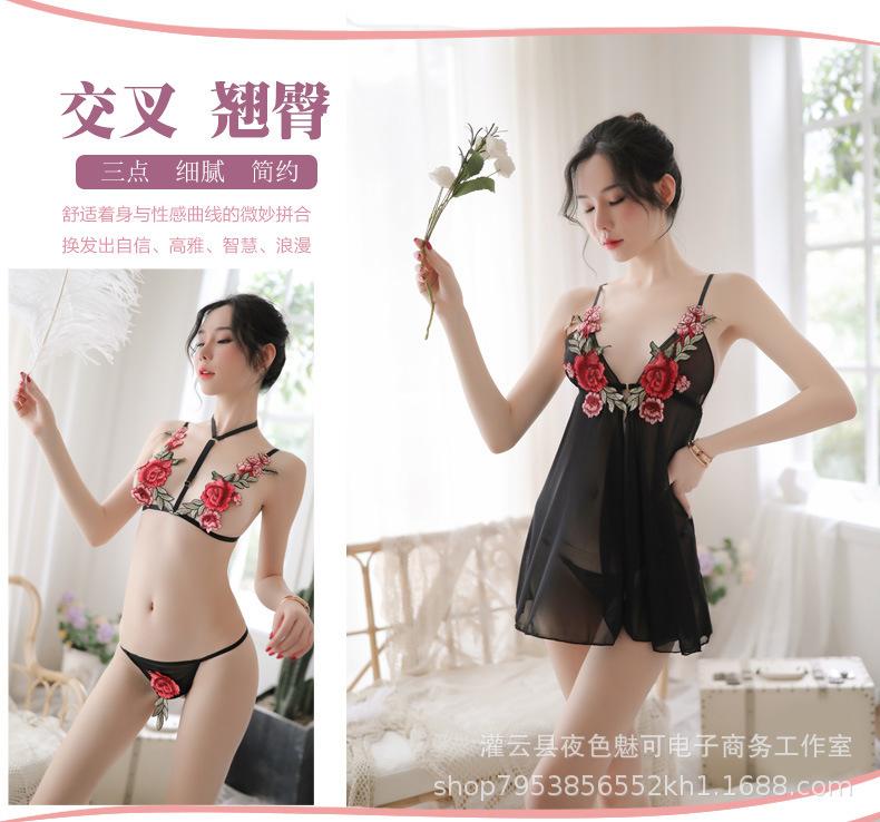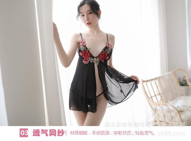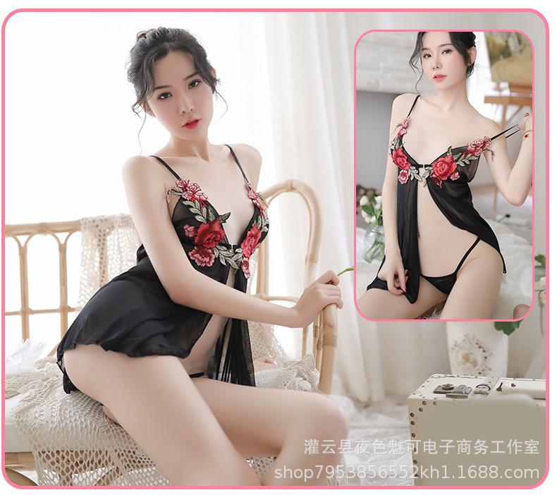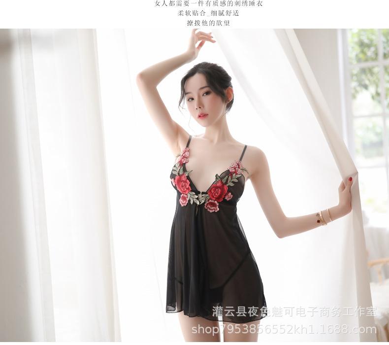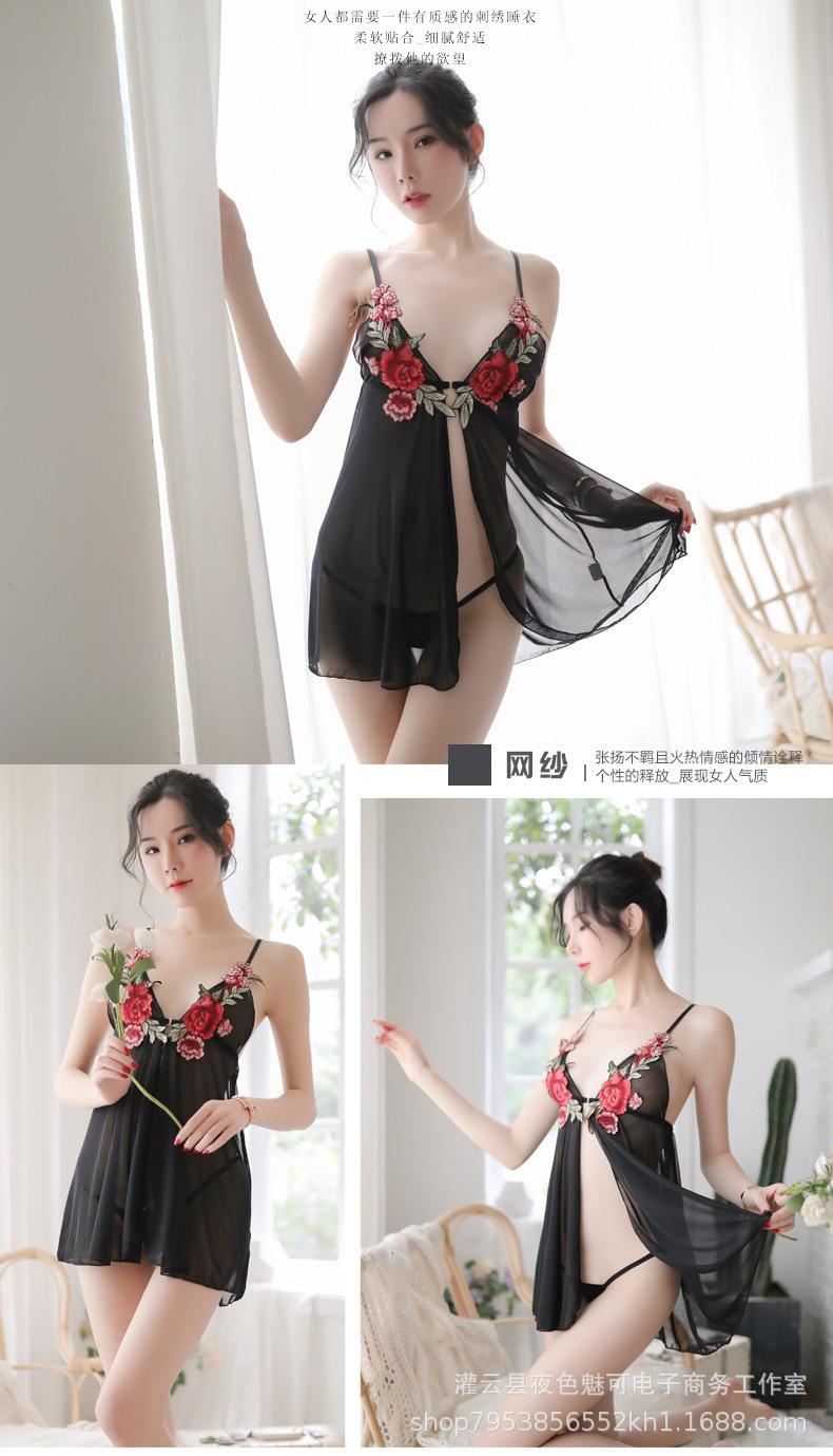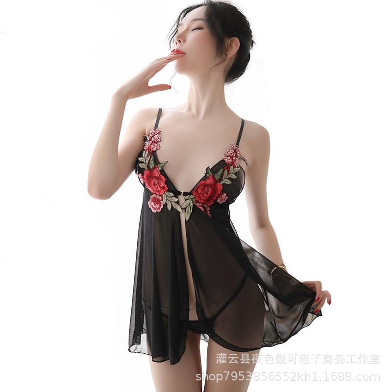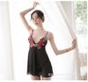 Lencería sexy con tirantes y abertura en el camisón de encaje bordado de malla transparente, pijama sexy de tres puntos