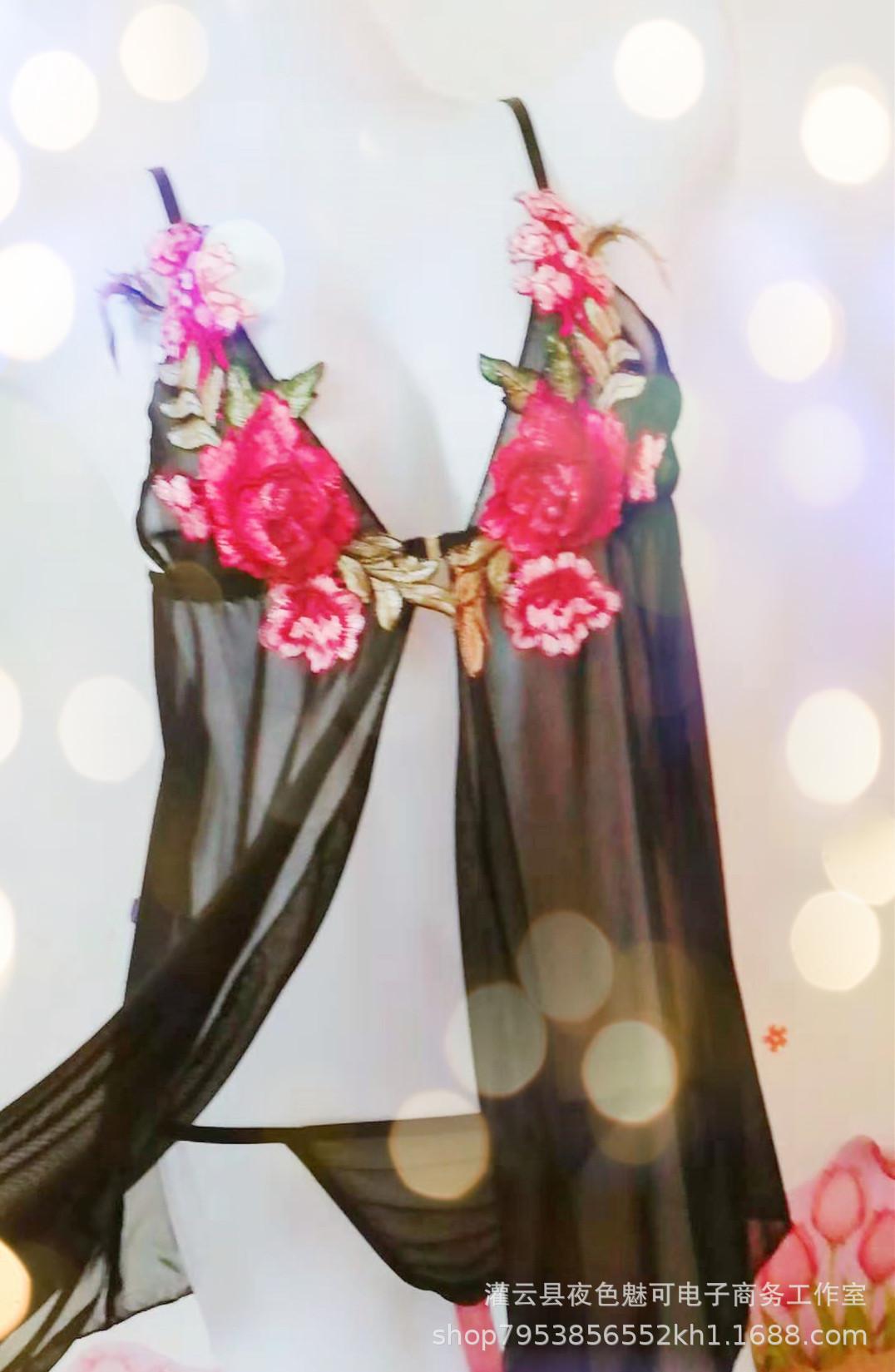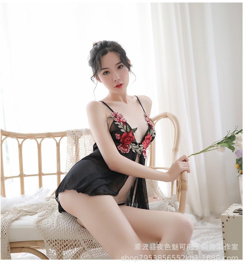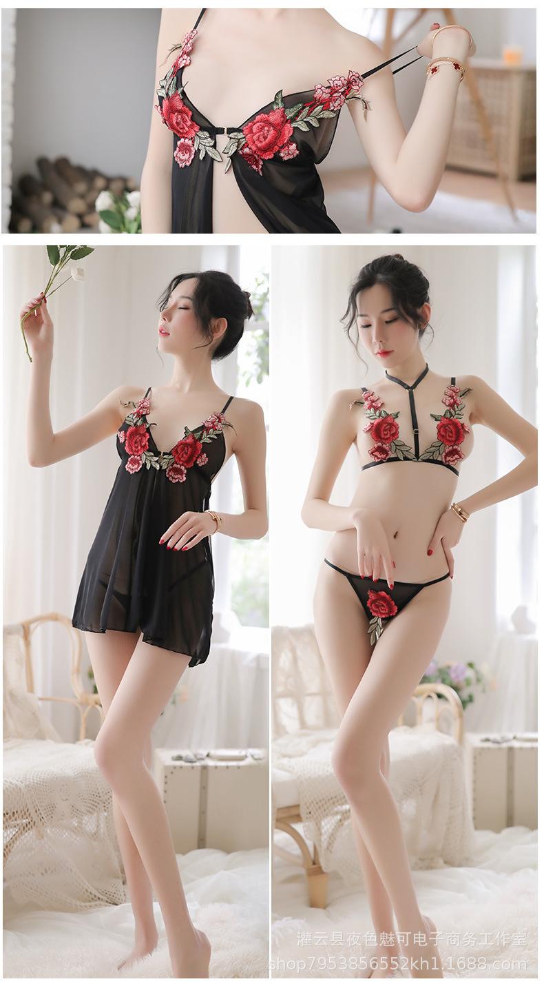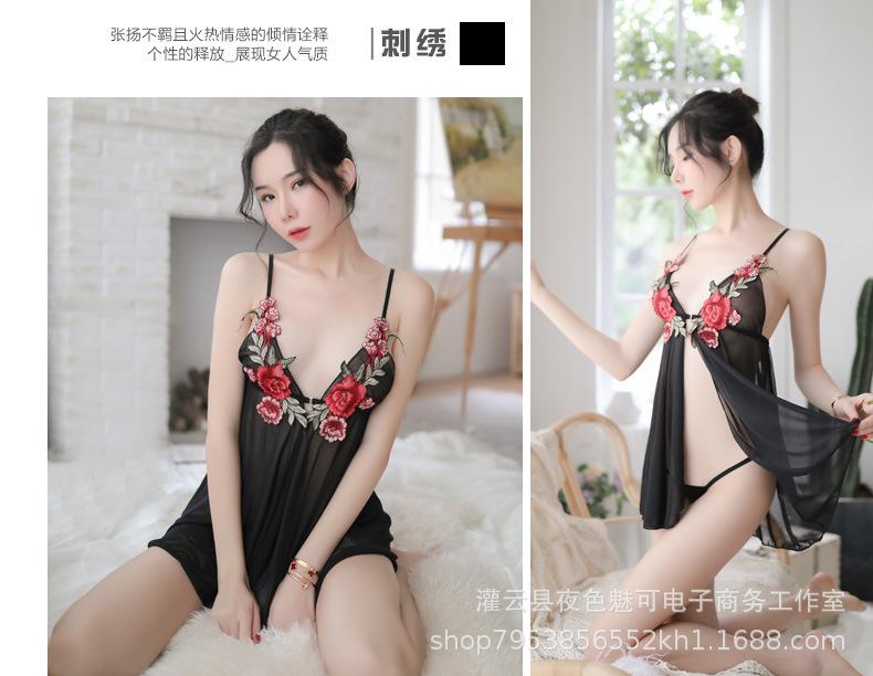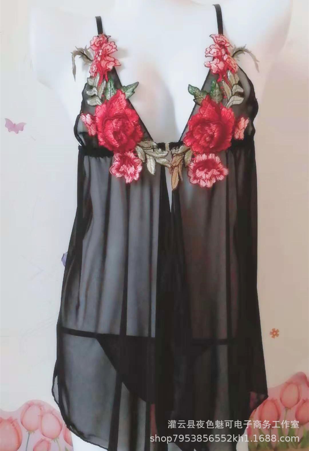 Lencería sexy con tirantes y abertura en el camisón de encaje bordado de malla transparente, pijama sexy de tres puntos