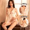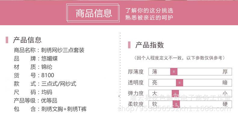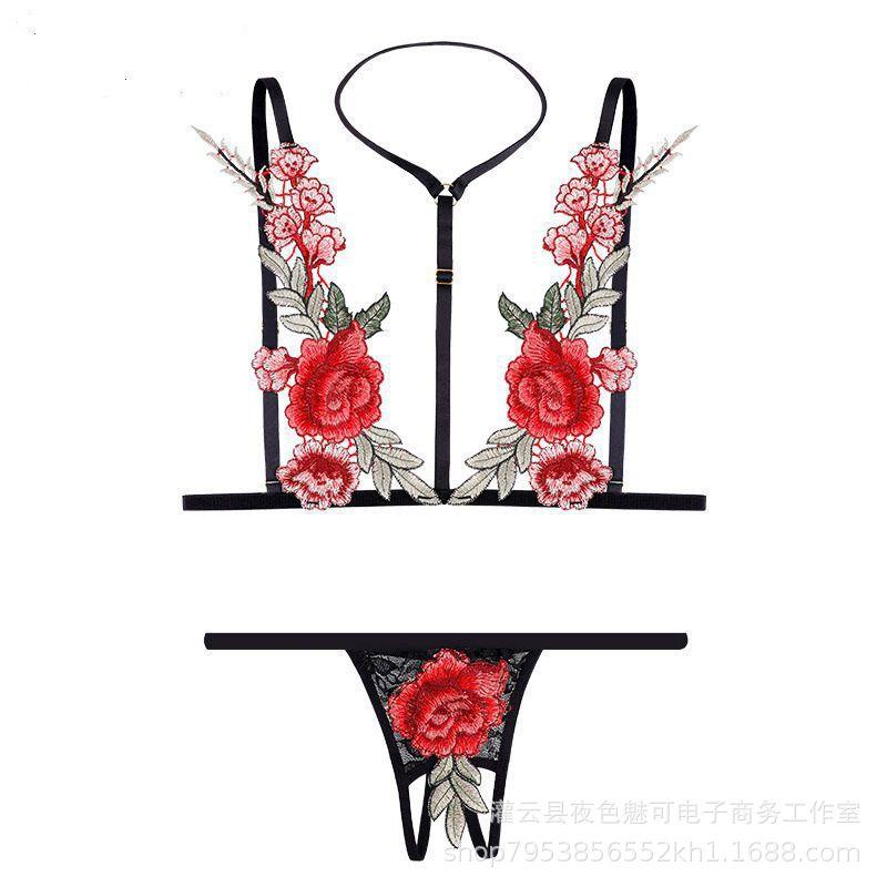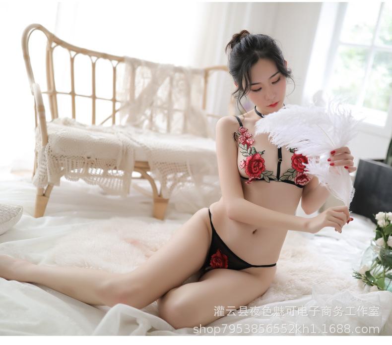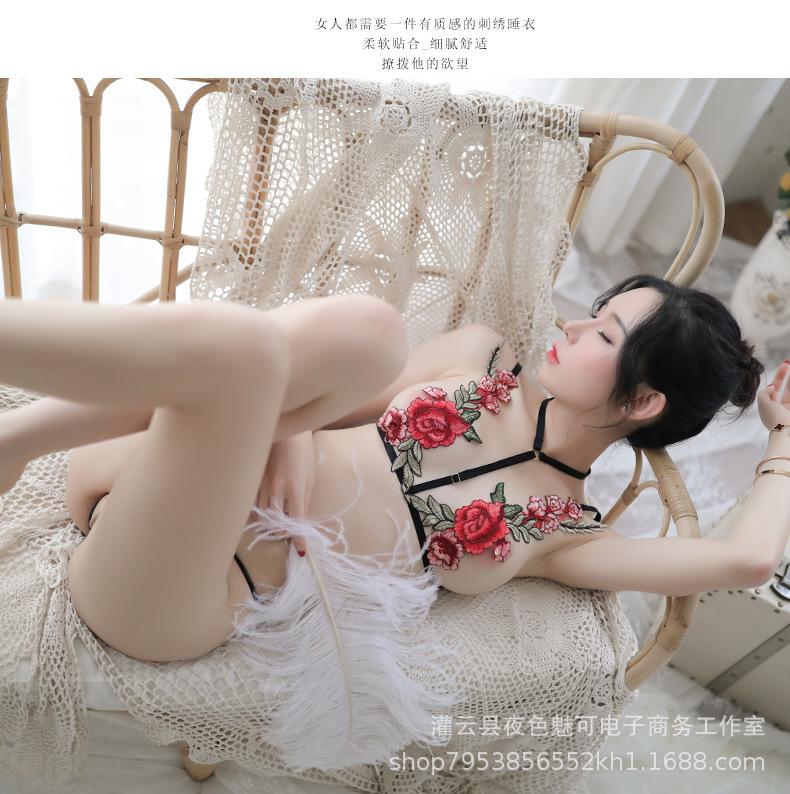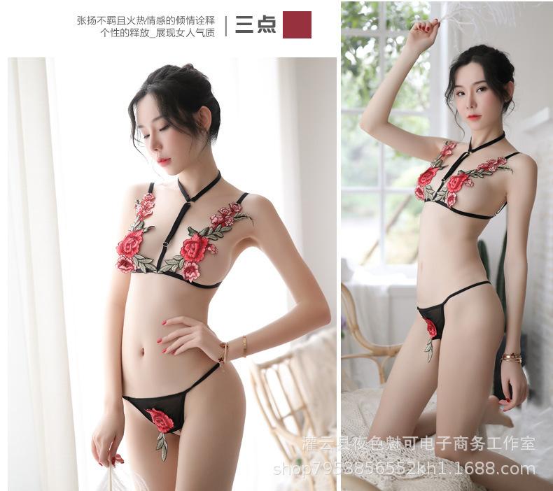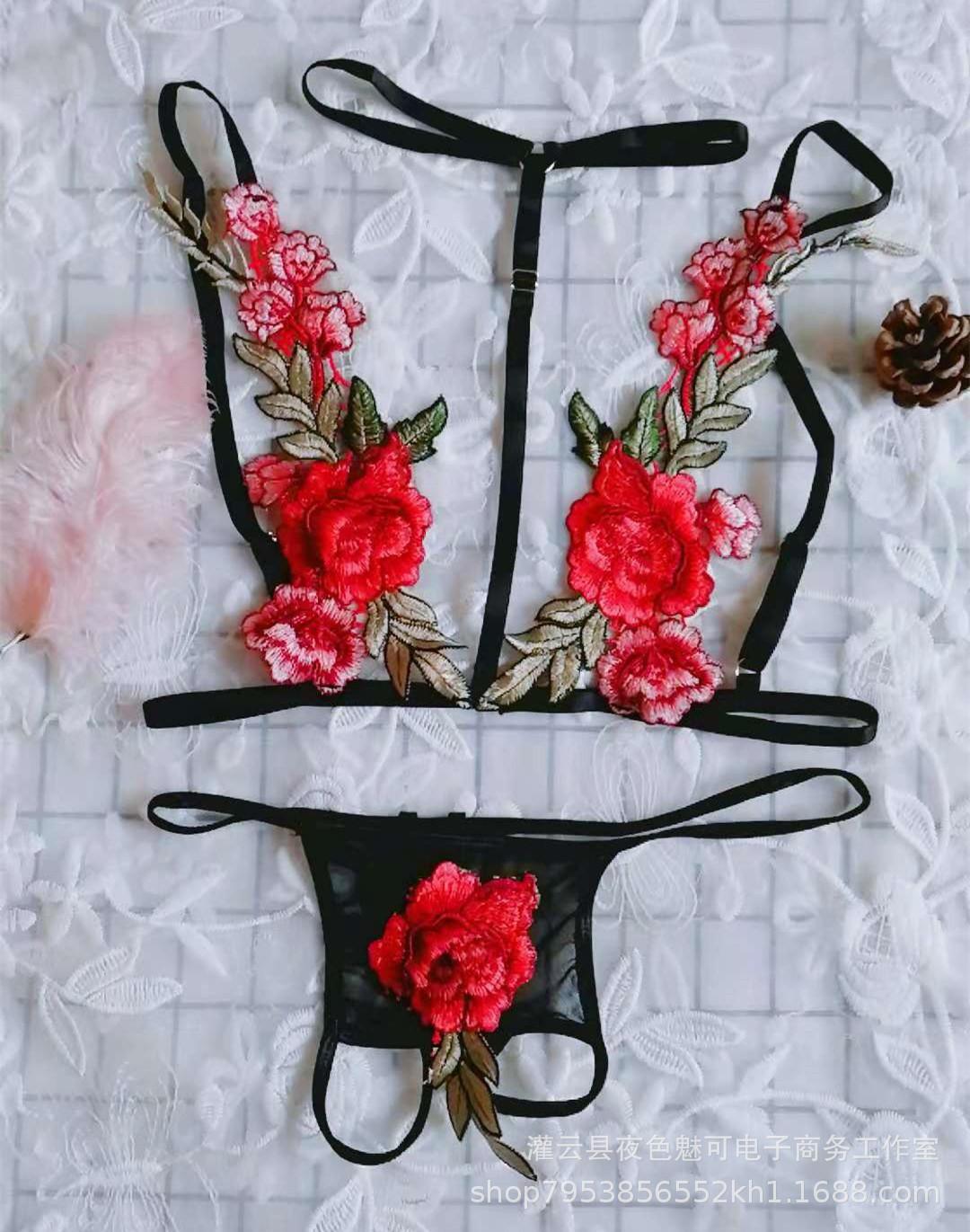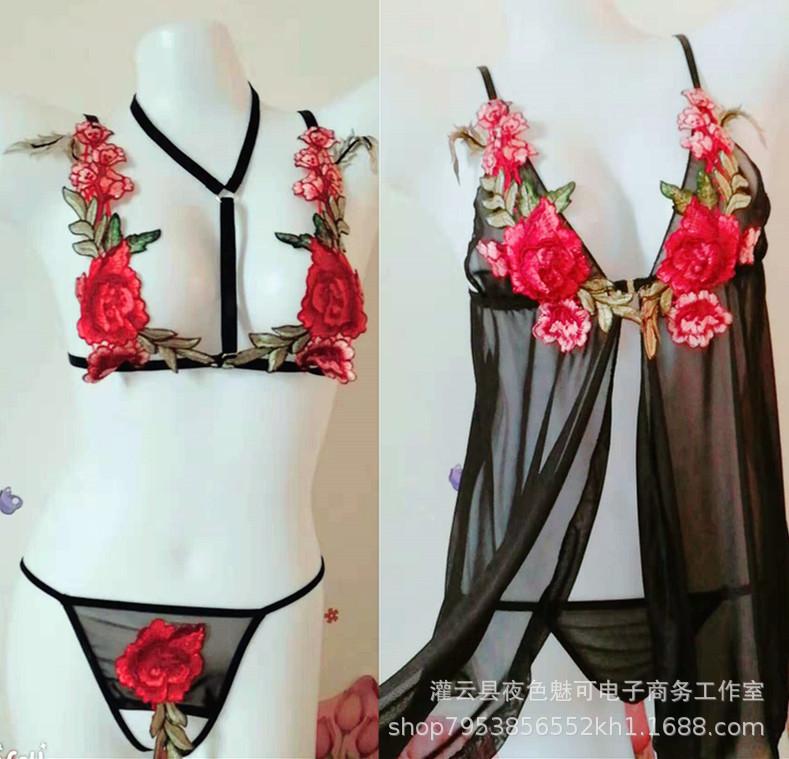 Lencería sexy con tirantes y abertura en el camisón de encaje bordado de malla transparente, pijama sexy de tres puntos