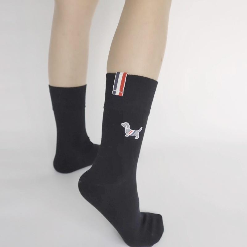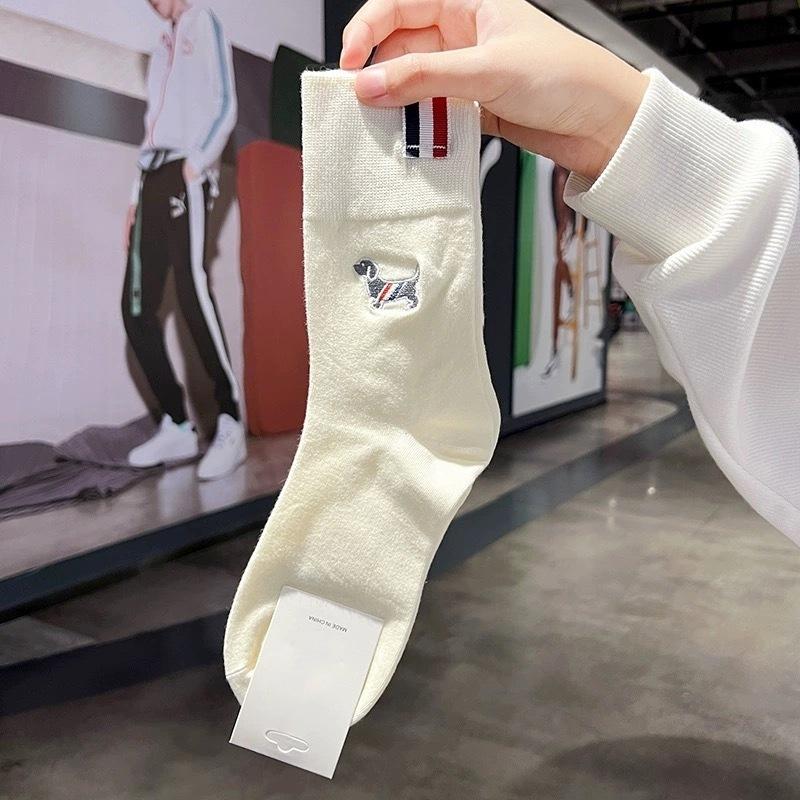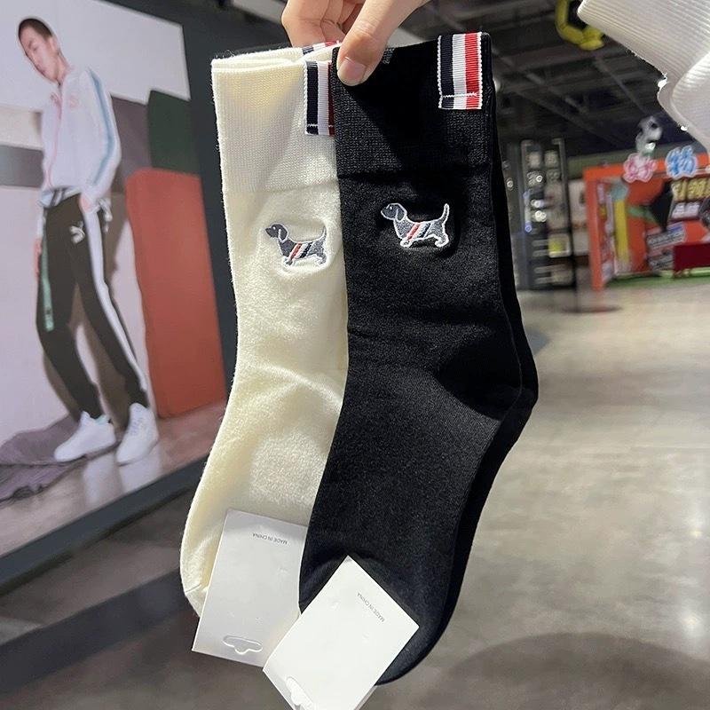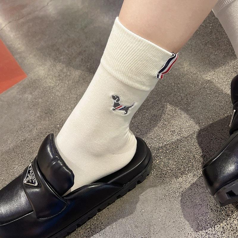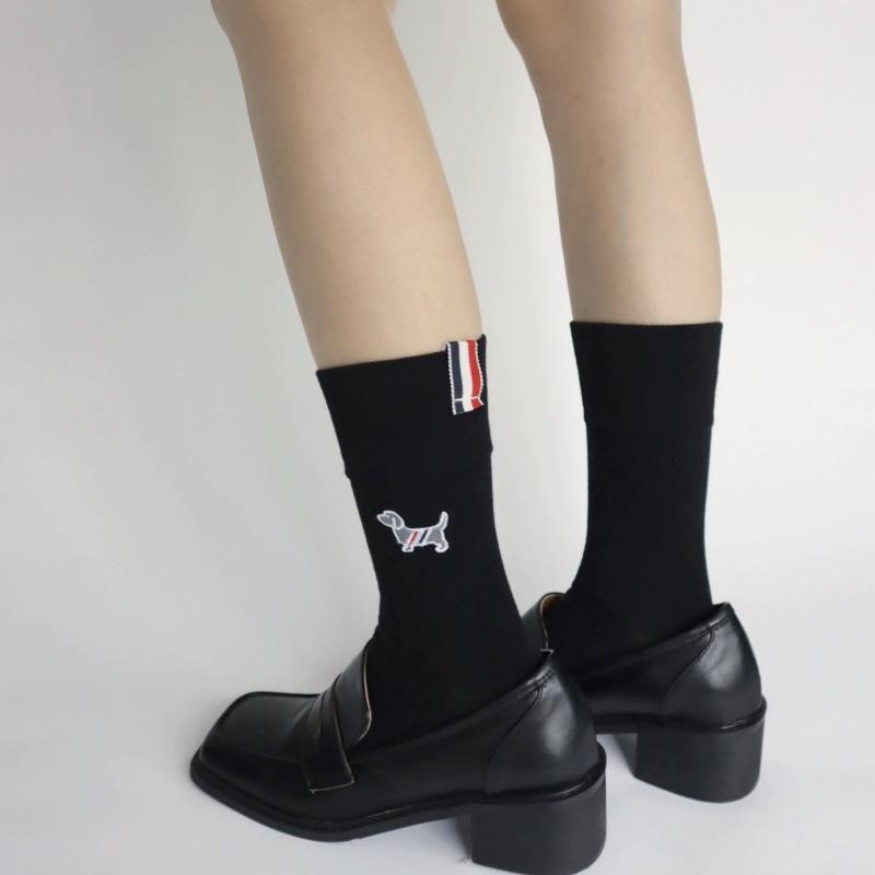 Calcetines de tubo medio con bordado de cachorros de marca europea de moda, calcetines blancos y negros británicos de nicho, calcetines apilados de moda para hombres y mujeres.