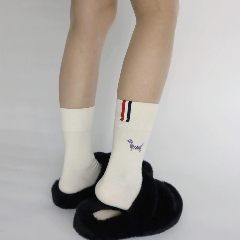 Compra Calcetines de tubo medio con bordado de cachorros de marca europea de moda, calcetines blancos y negros británicos de nicho, calcetines apilados de moda para hombres y mujeres. al por mayor en Joom.pro