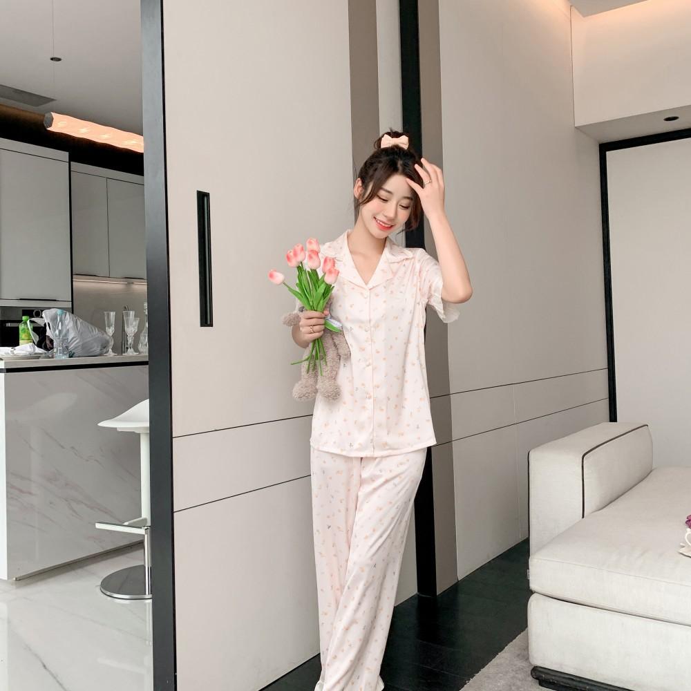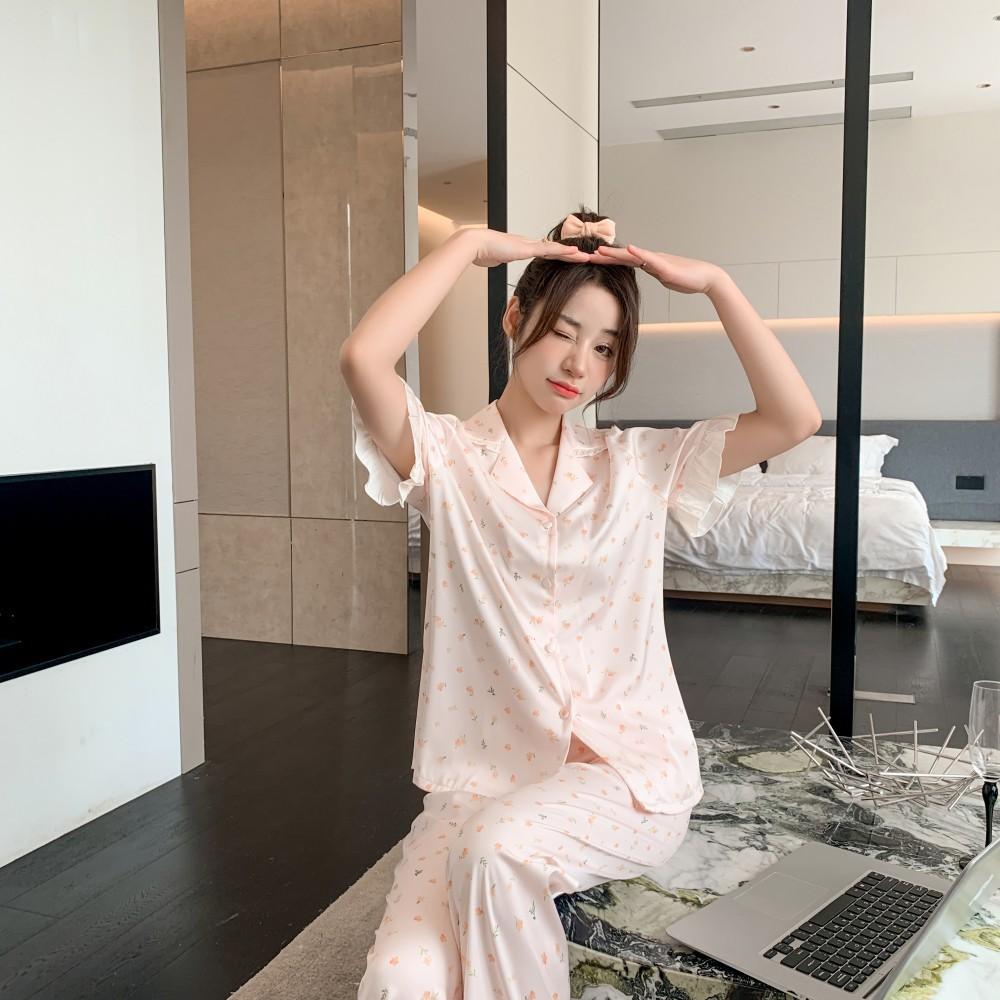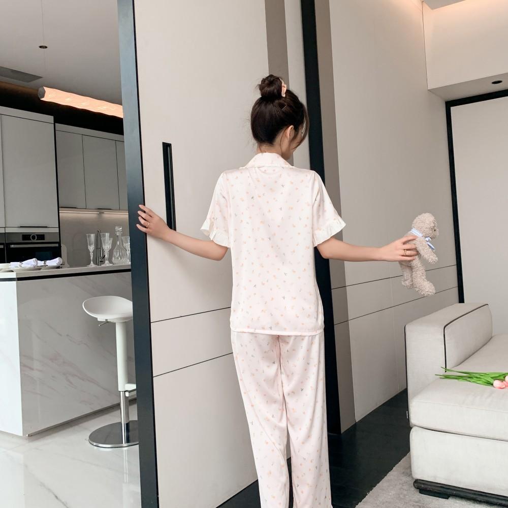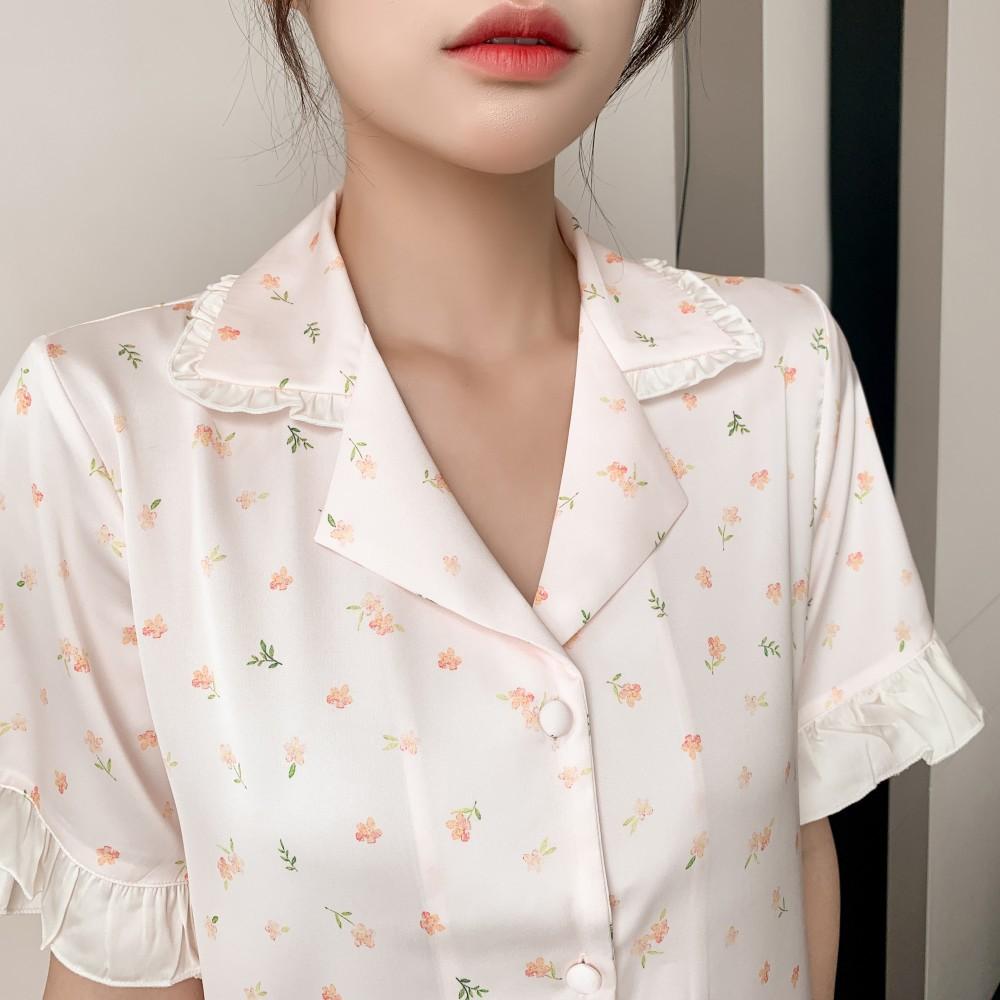 [Amor de verano] Pijama de seda helada para mujer, pantalones de verano de manga corta, traje de seda con estampado floral pequeño y fresco.