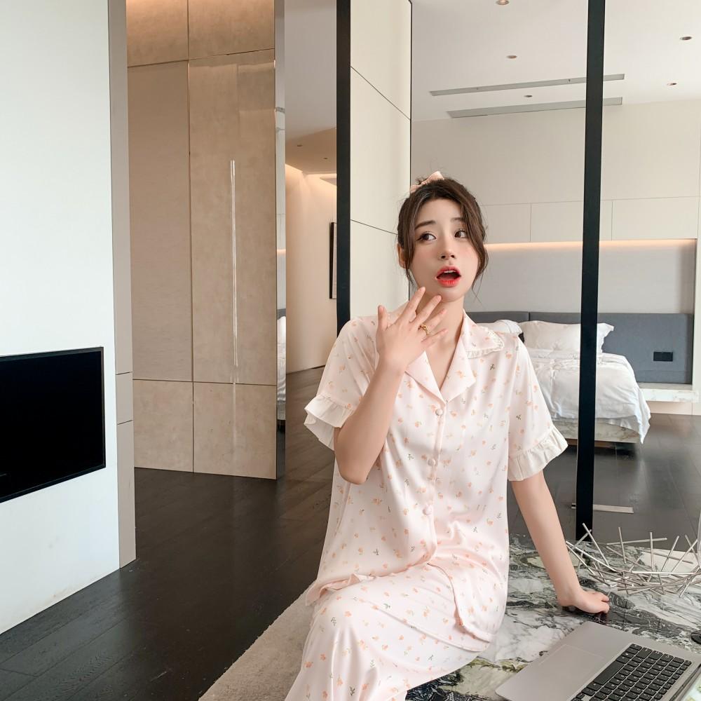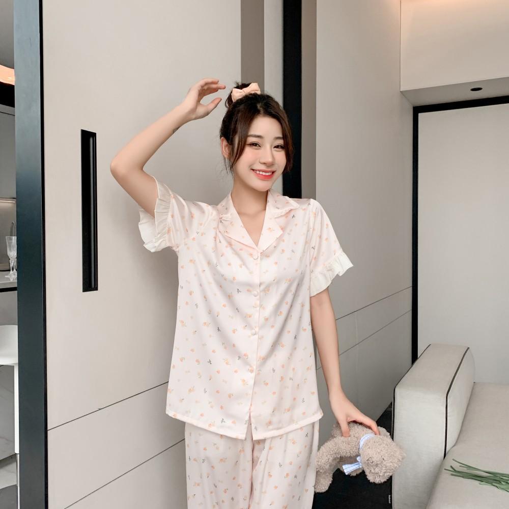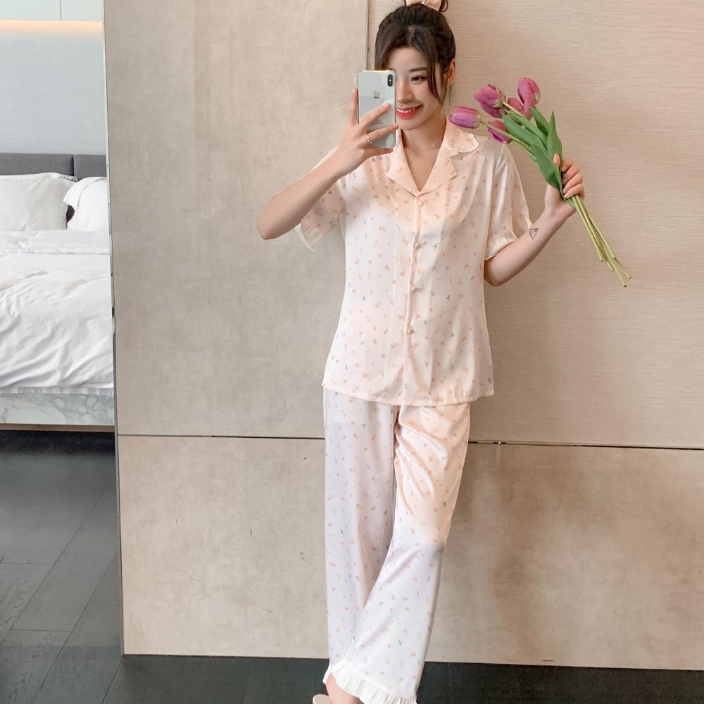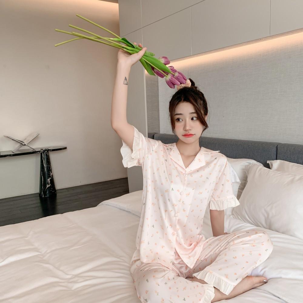 [Amor de verano] Pijama de seda helada para mujer, pantalones de verano de manga corta, traje de seda con estampado floral pequeño y fresco.
