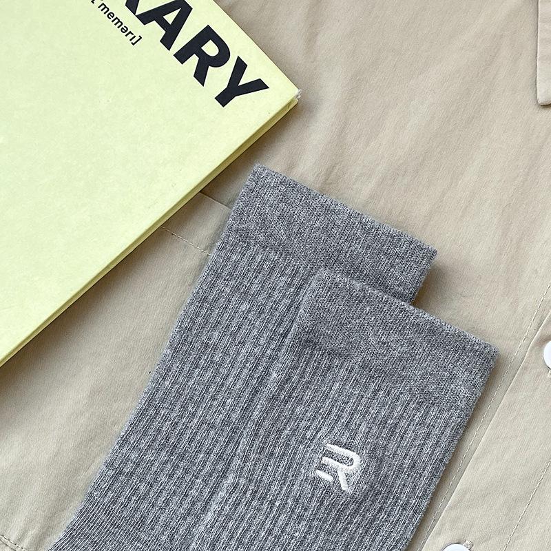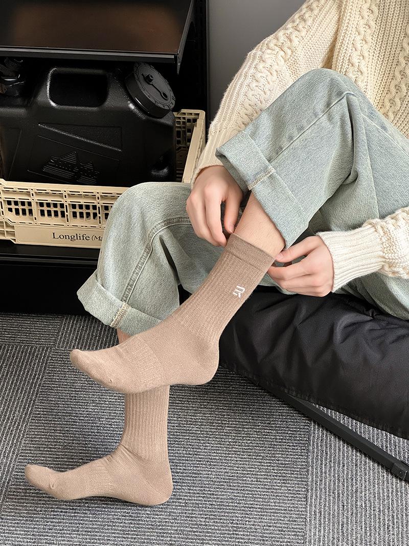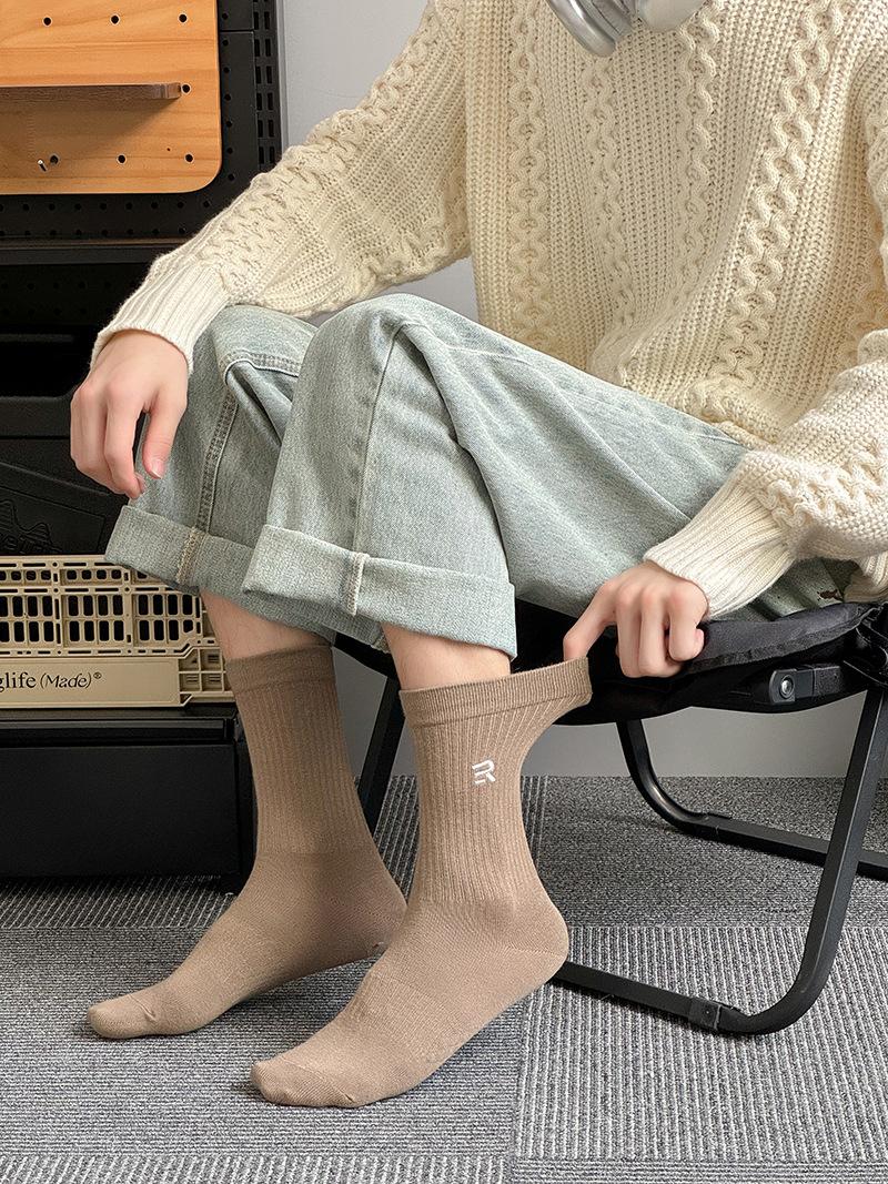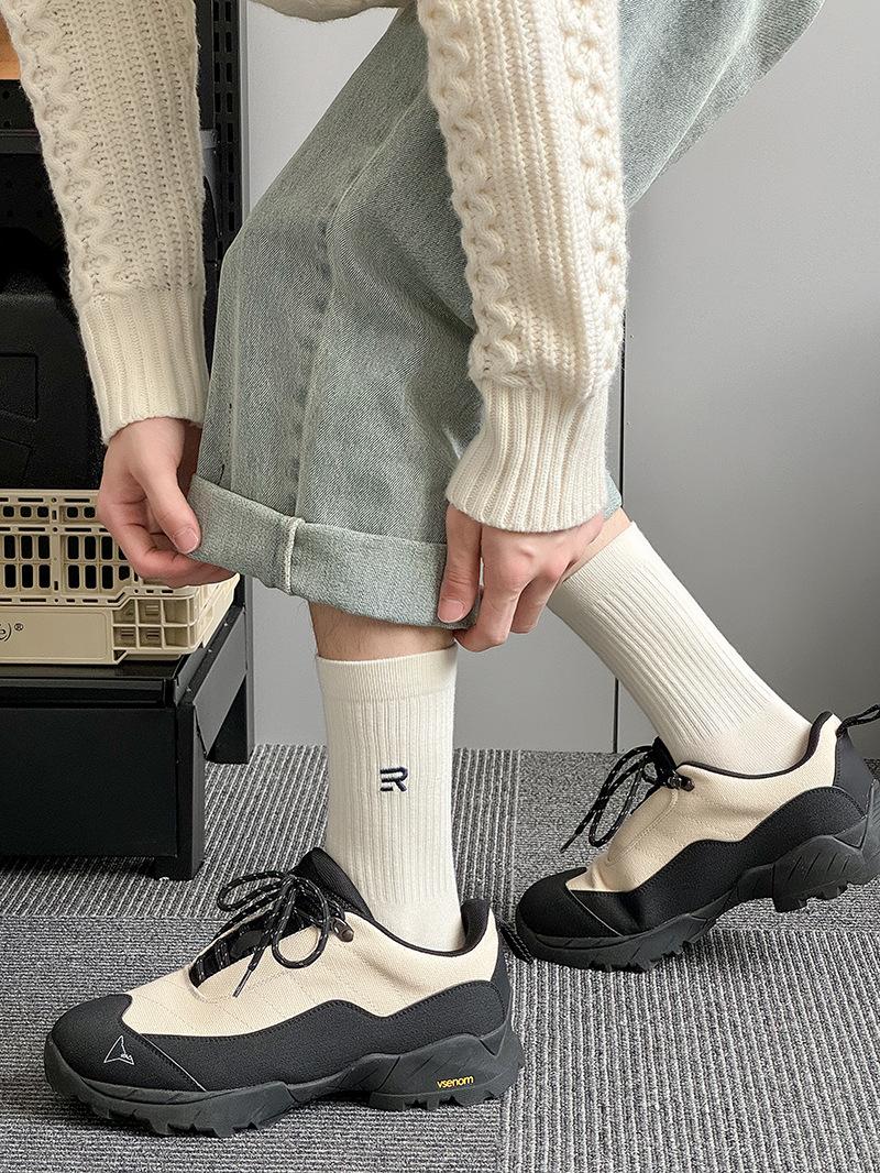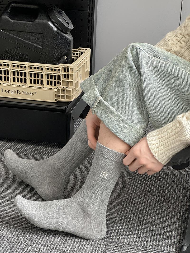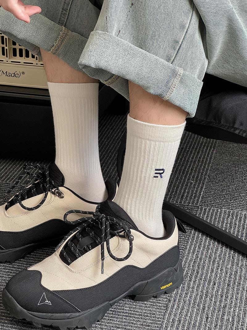 Calcetines deportivos de tubo medio con bordado de cintura R para hombre, calcetines altos blancos y negros para hombre, calcetines de algodón desodorante absorbentes de sudor para otoño e invierno.