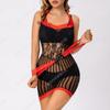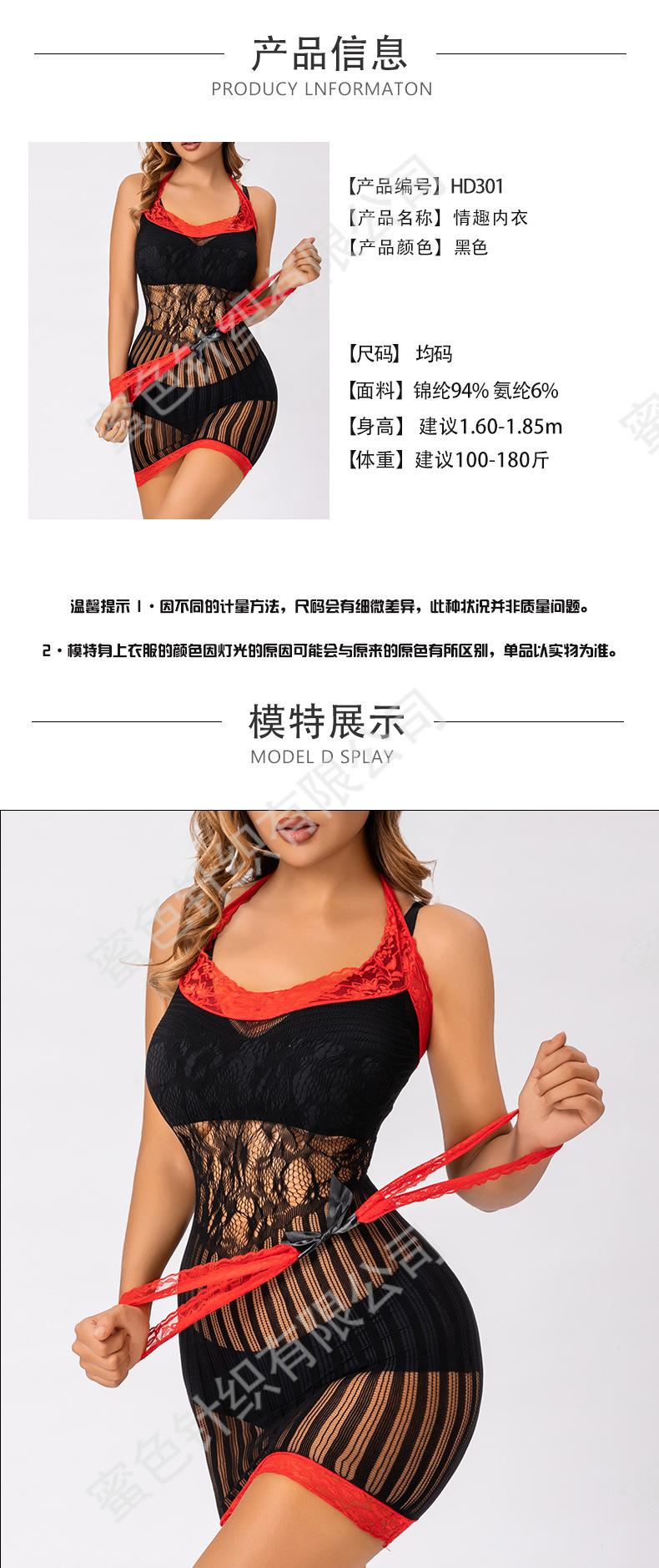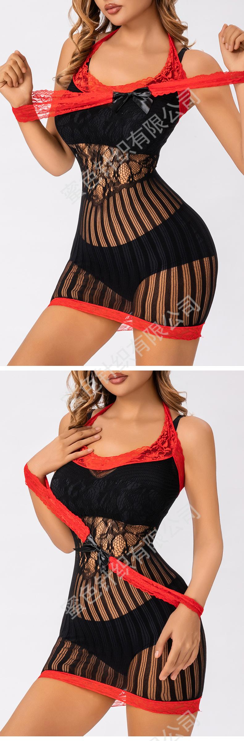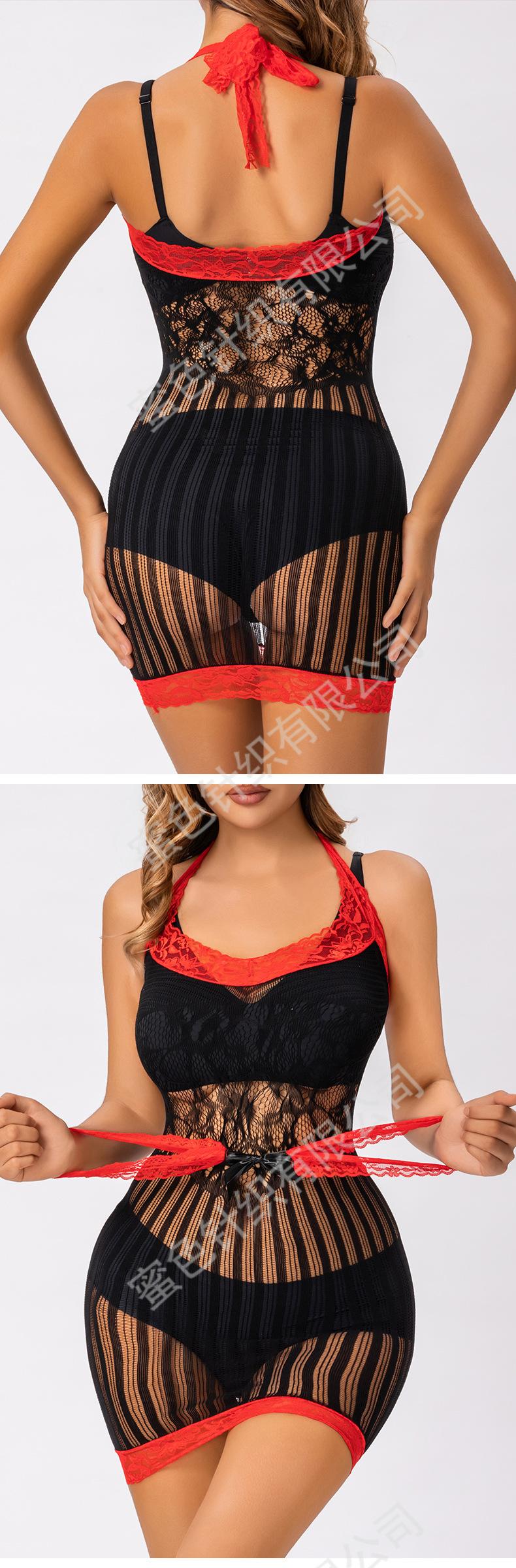 Lencería sexy con cuello colgante, falda de encaje a la cadera, perspectiva hueca, sin espalda, malla ajustada