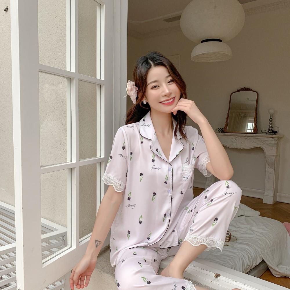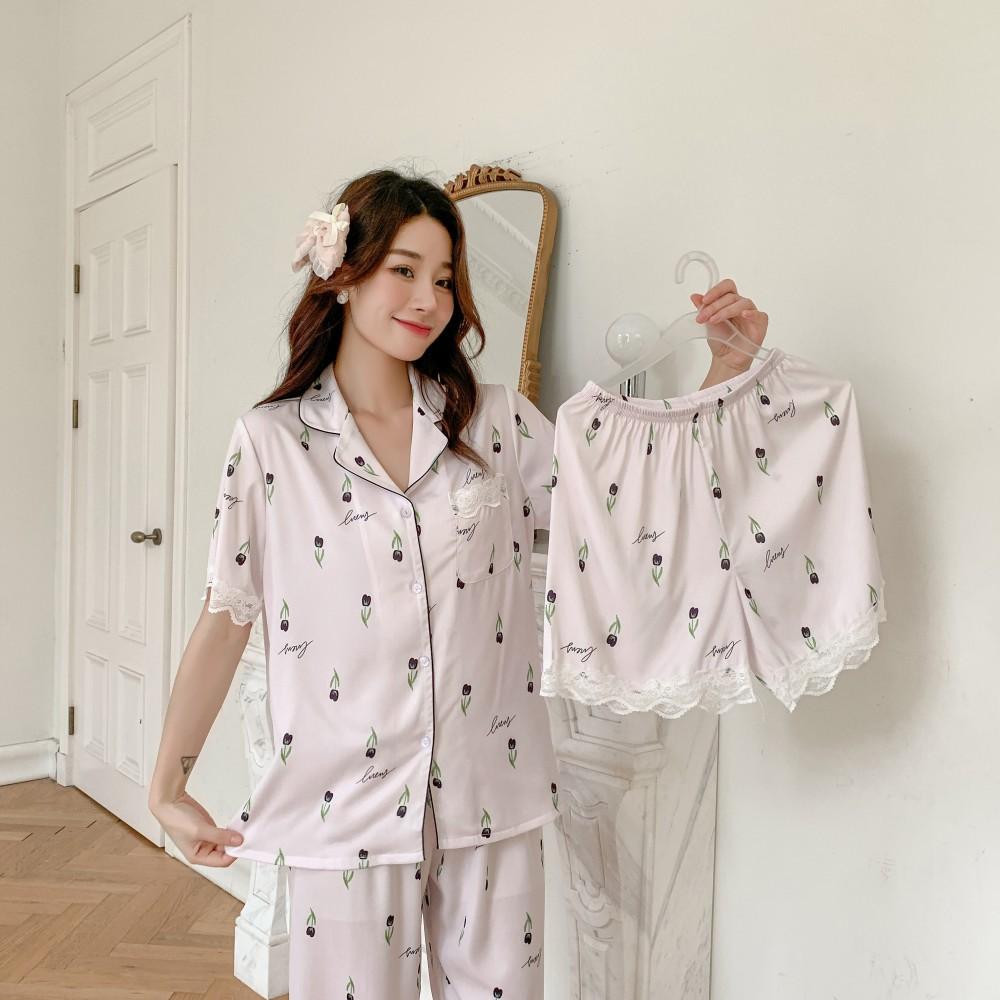 Conjunto de Pijama de Tres Piezas de Seda de Hielo con Estampado de Ácido Acético de Verano 2023, Fresco Conjunto de Ropa para el Hogar
