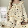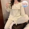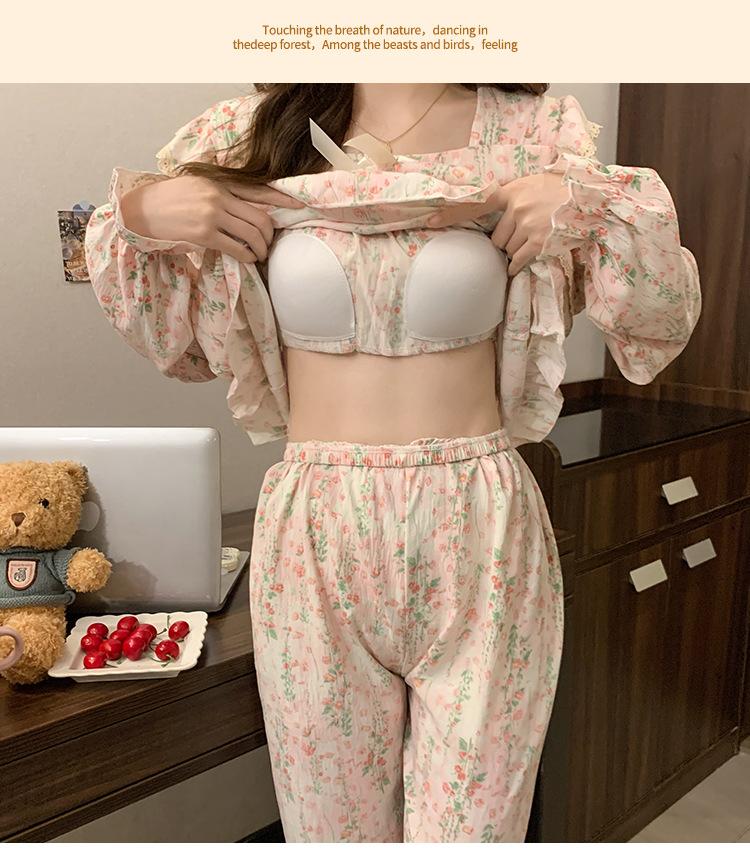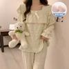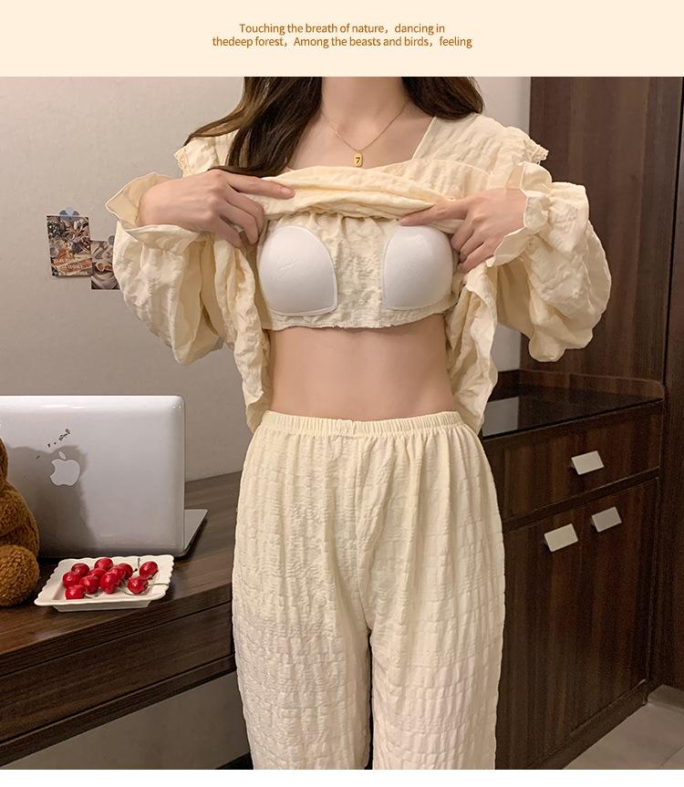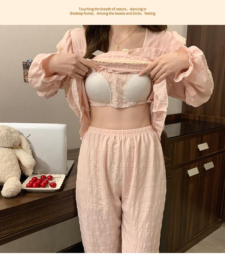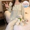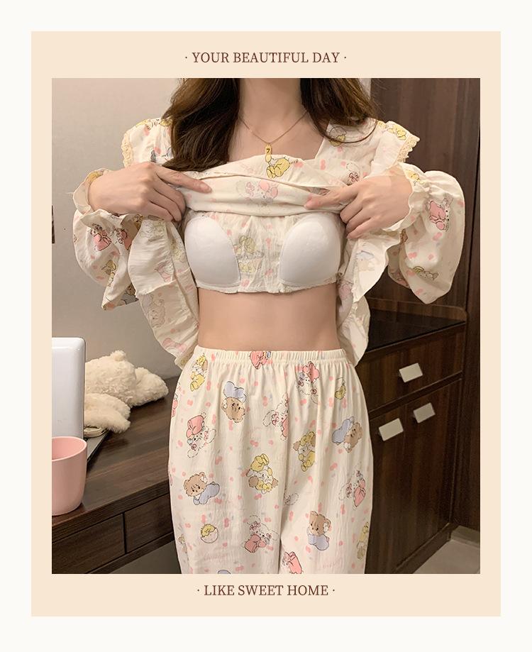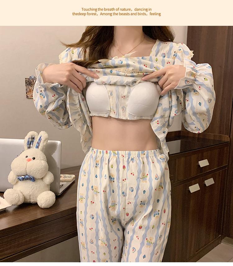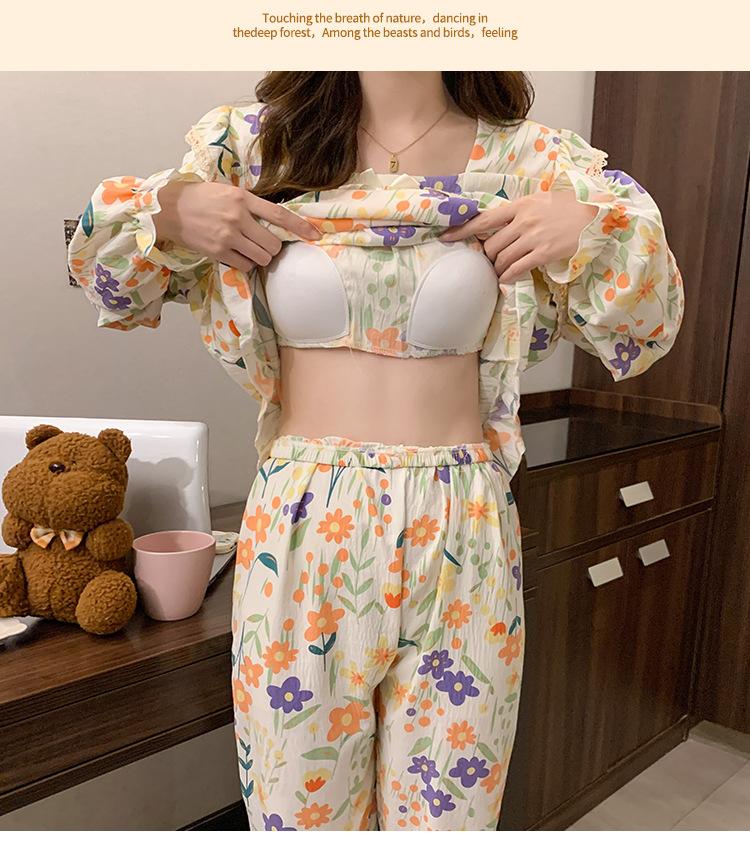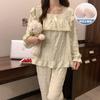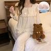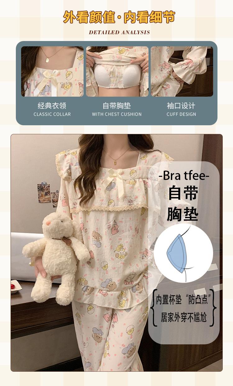 Pijama de algodón con almohadilla para el pecho para mujer, otoño, nuevo, manga larga, pantalones, encaje dulce, ropa para el hogar, traje, ropa exterior