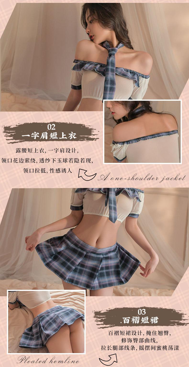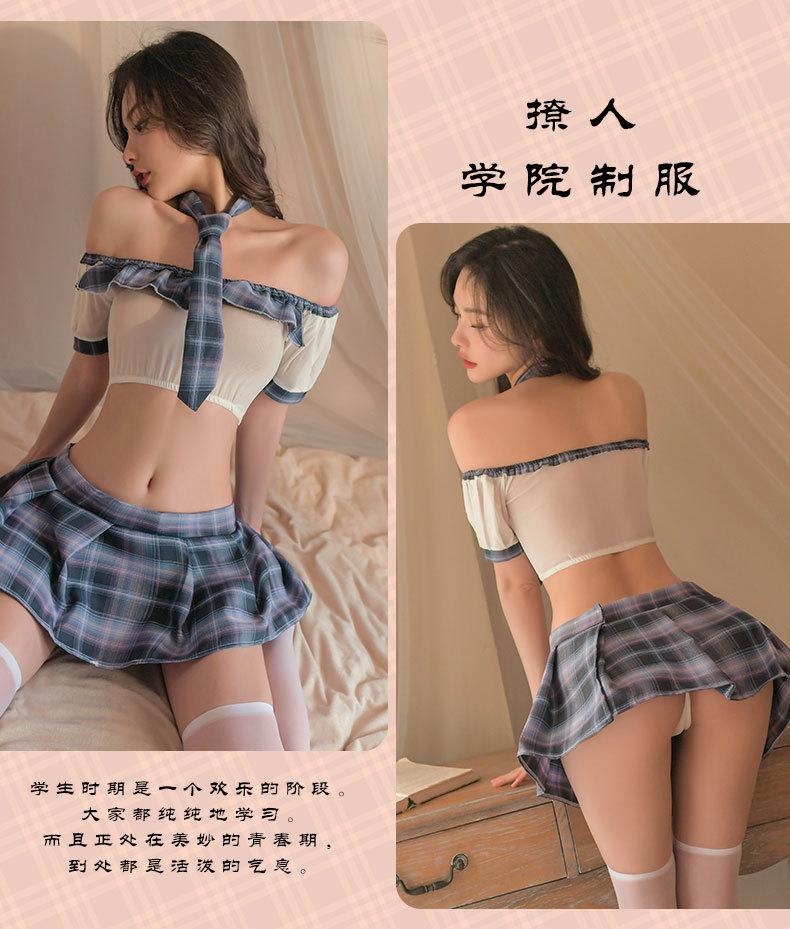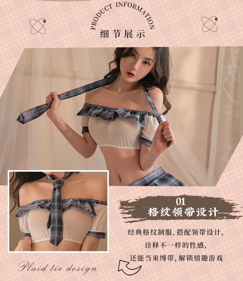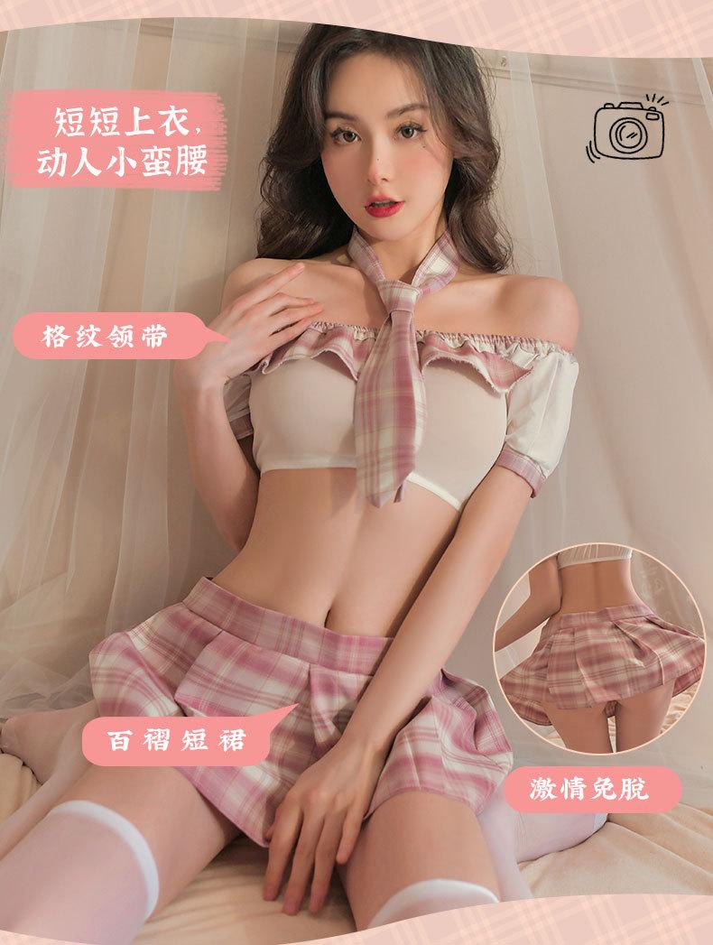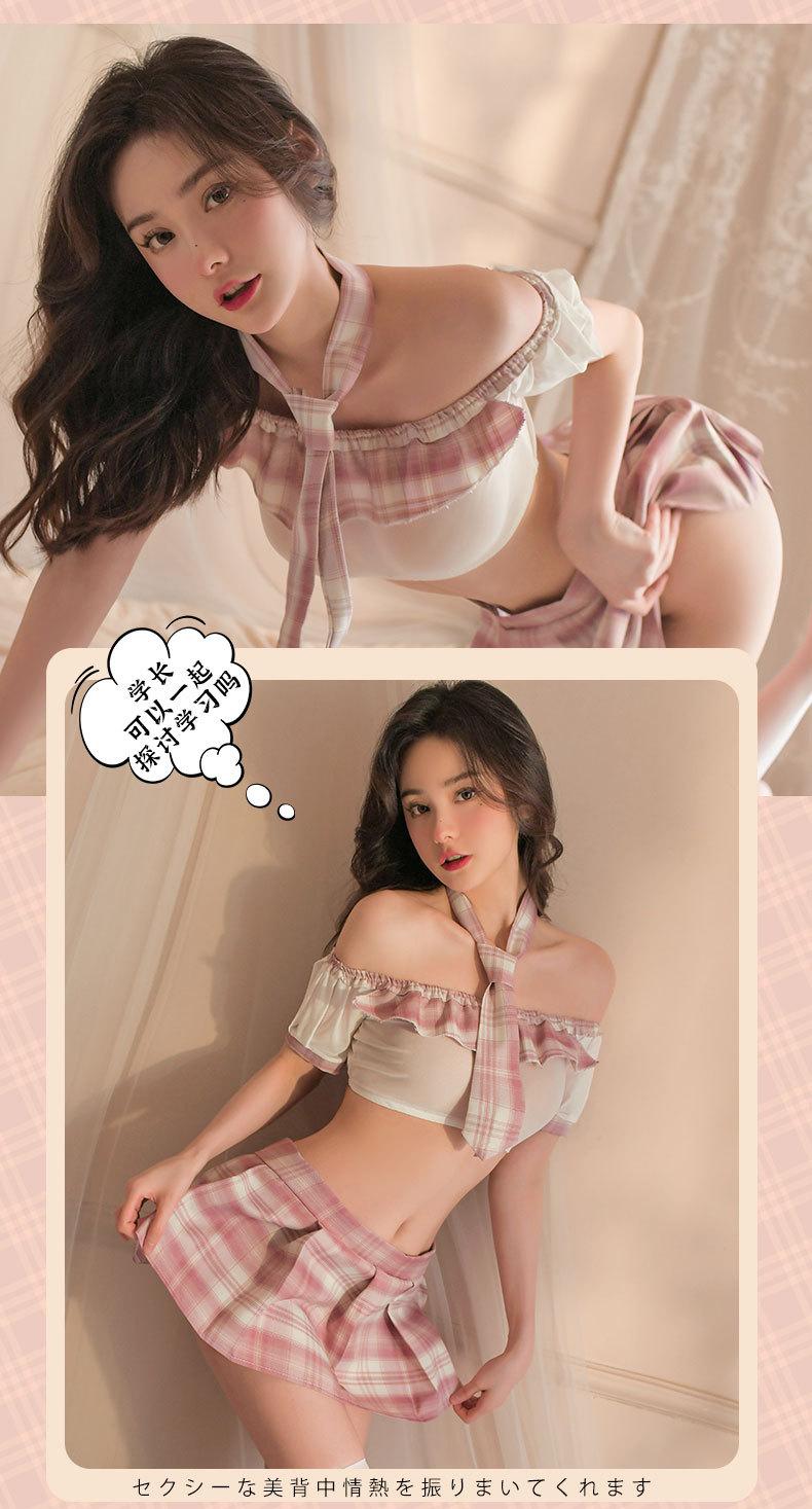 Purple plaid [top + skirt + tie + thong], Pink plaid [top + skirt + tie + thong], Purple plaid [top + skirt + ...