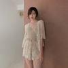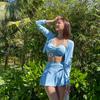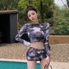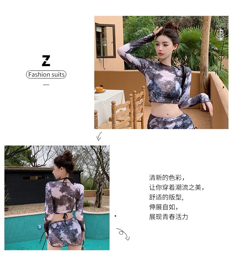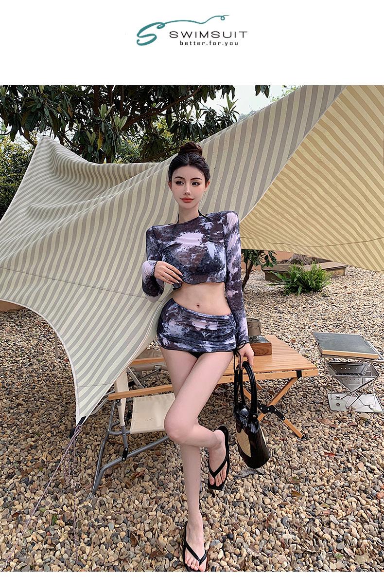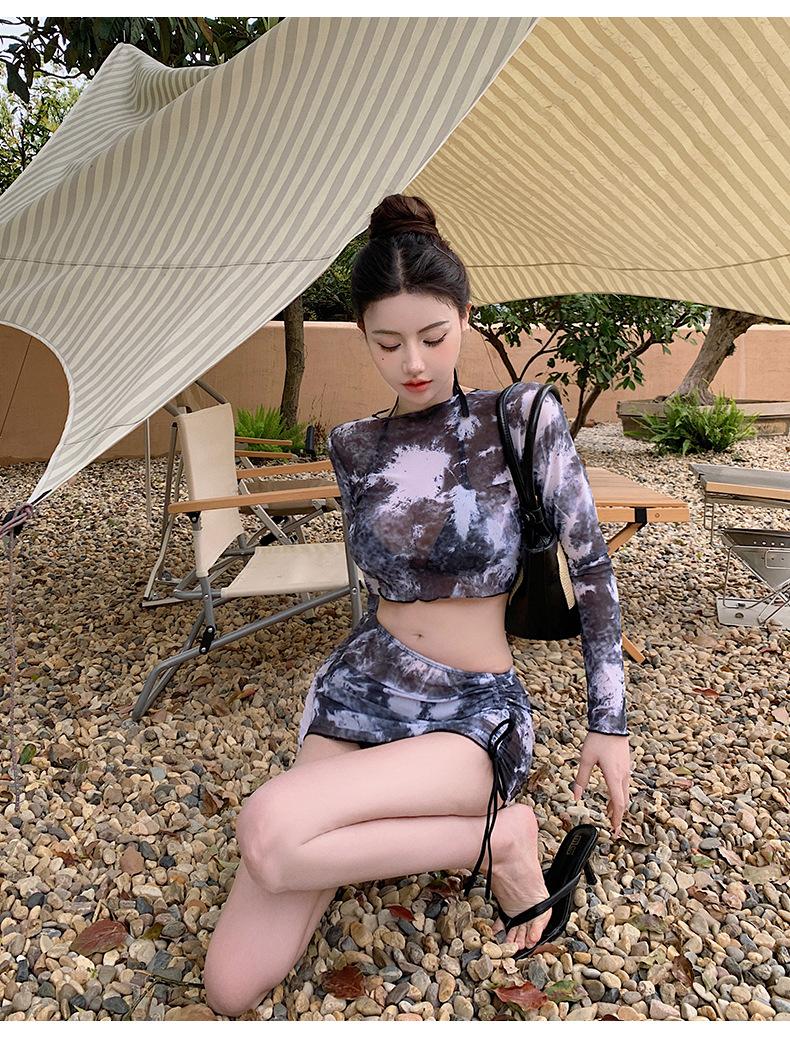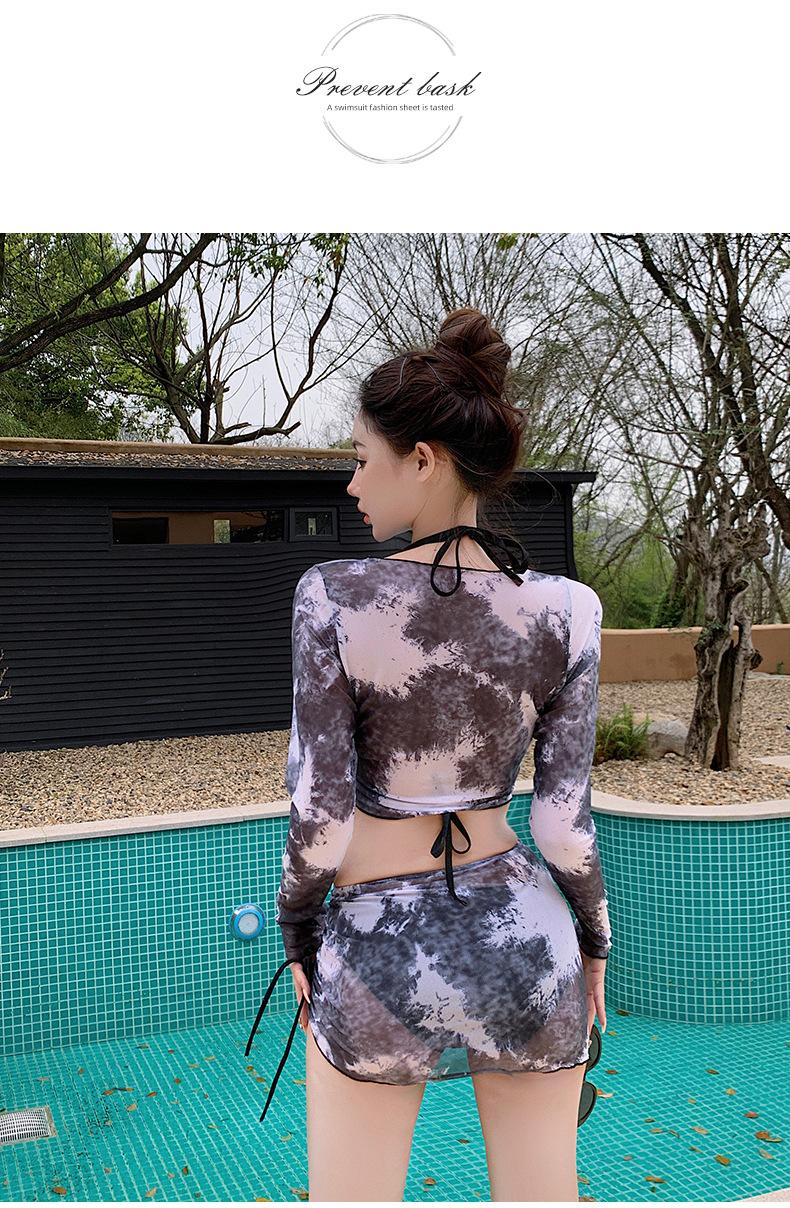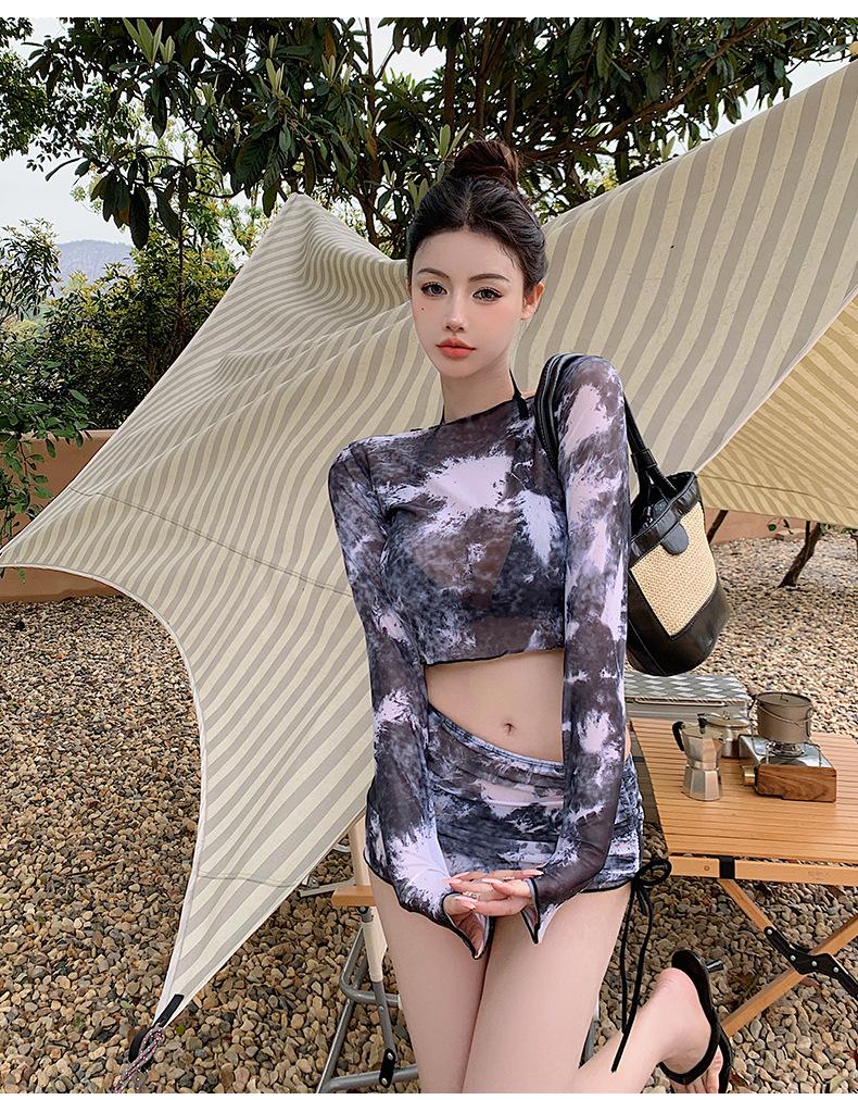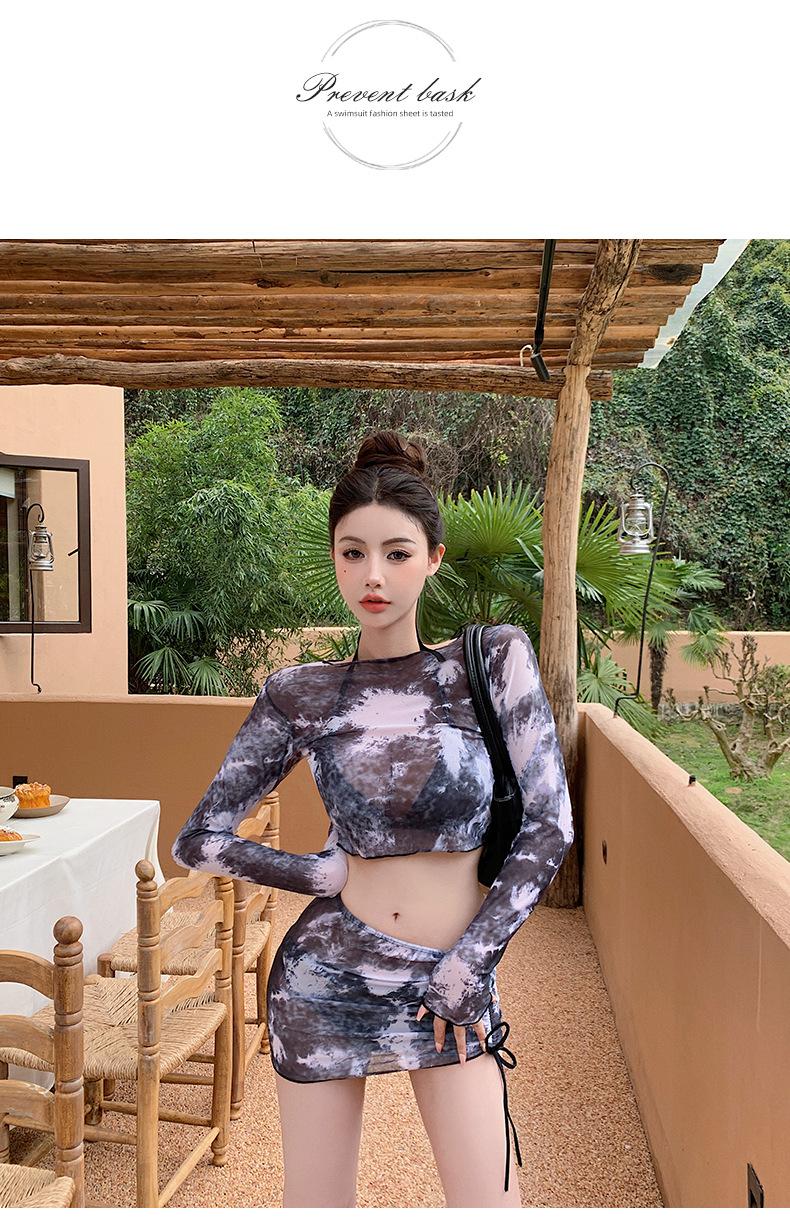 Traje de baño de cuatro piezas con efecto tie-dye, ligero, de lujo, de gasa sencilla, de manga larga, protector solar, conservador, traje de baño dividido, falda de gasa para mujer, blusa