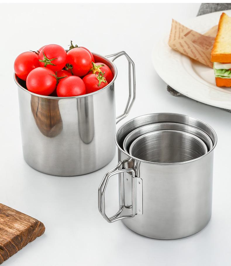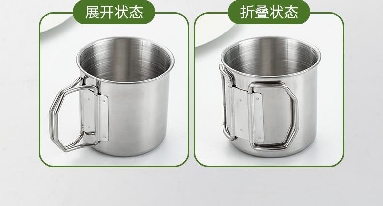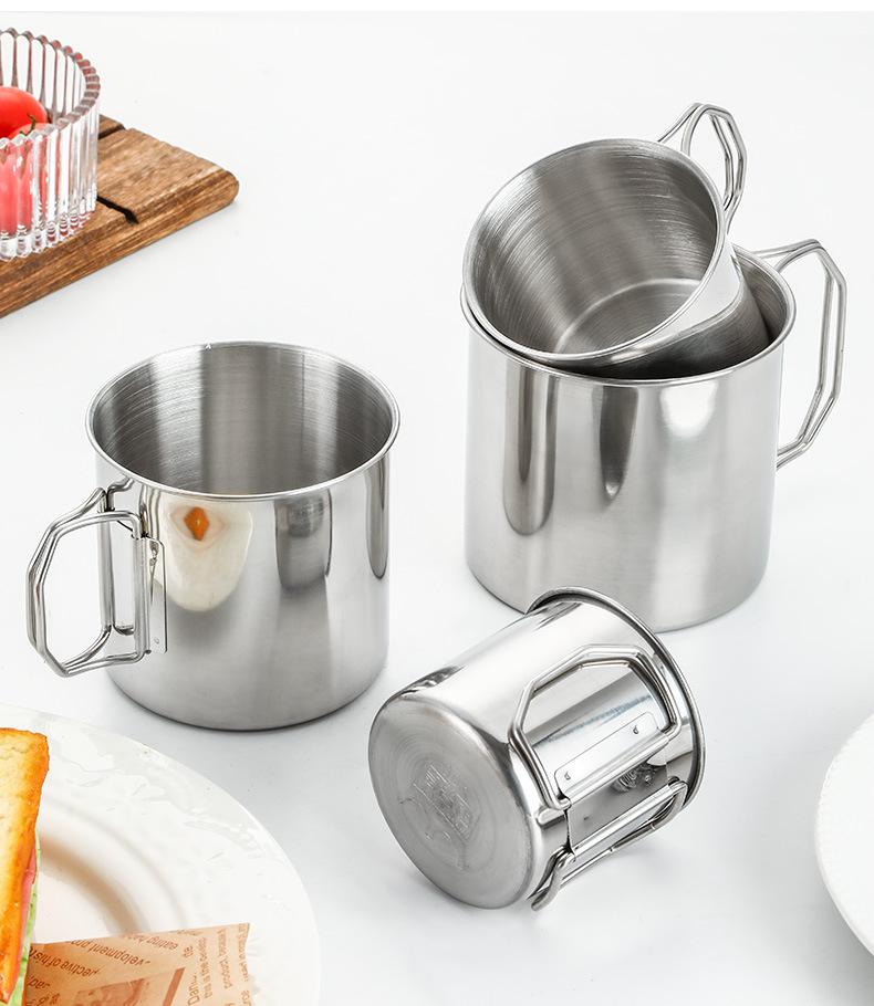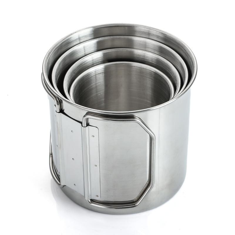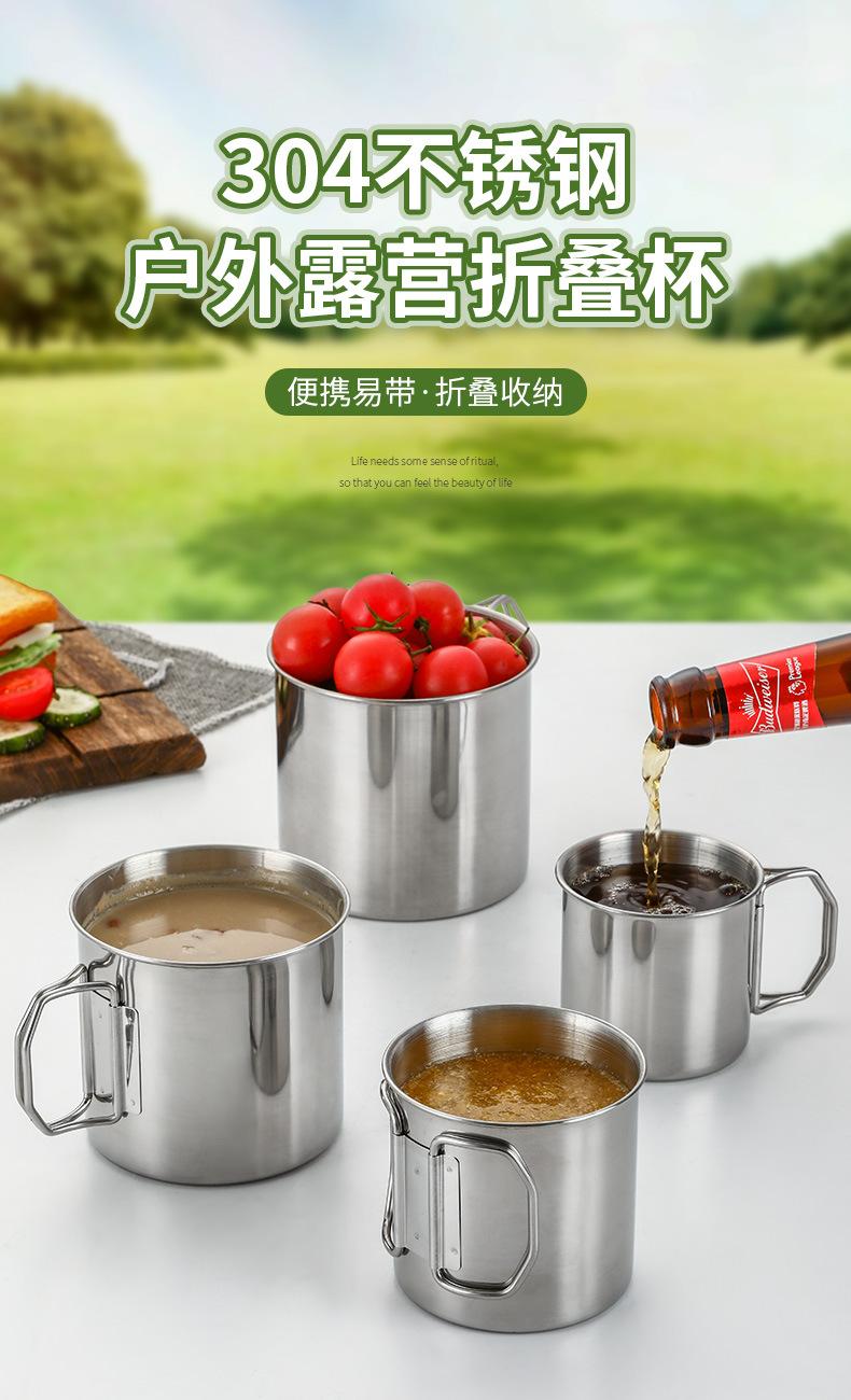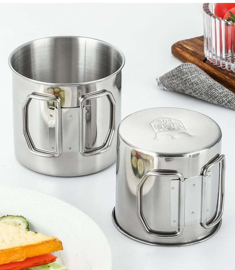 Taza de agua plegable de acero inoxidable 304 para acampar al aire libre, portátil, con asa plegable, para escalada y acampada.