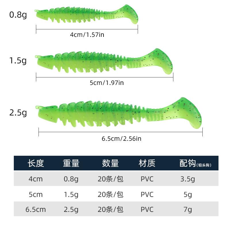 4cm/0.8g, 5cm/1.5g, 6.5cm/2.5g