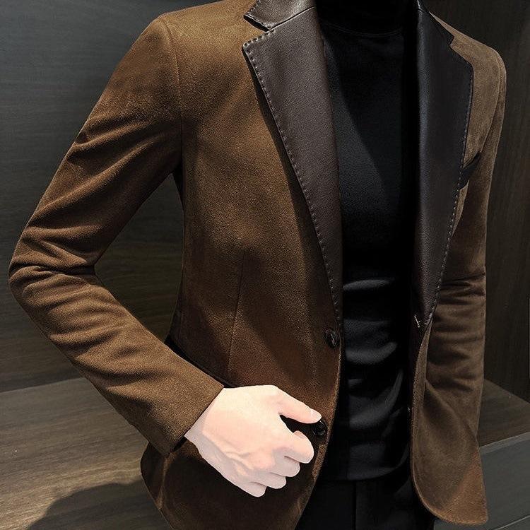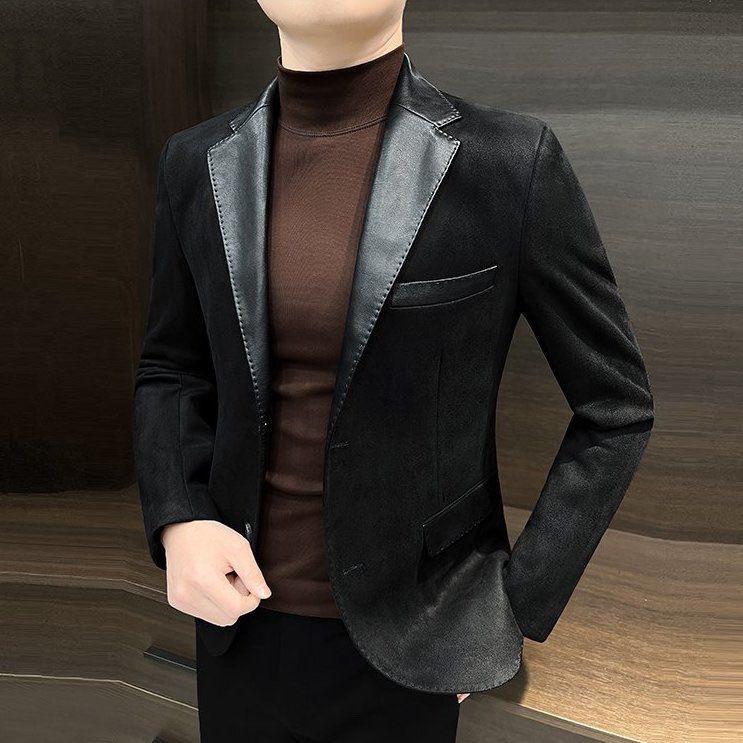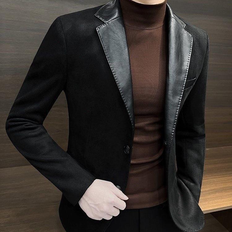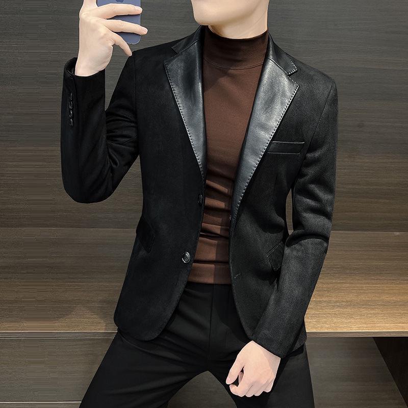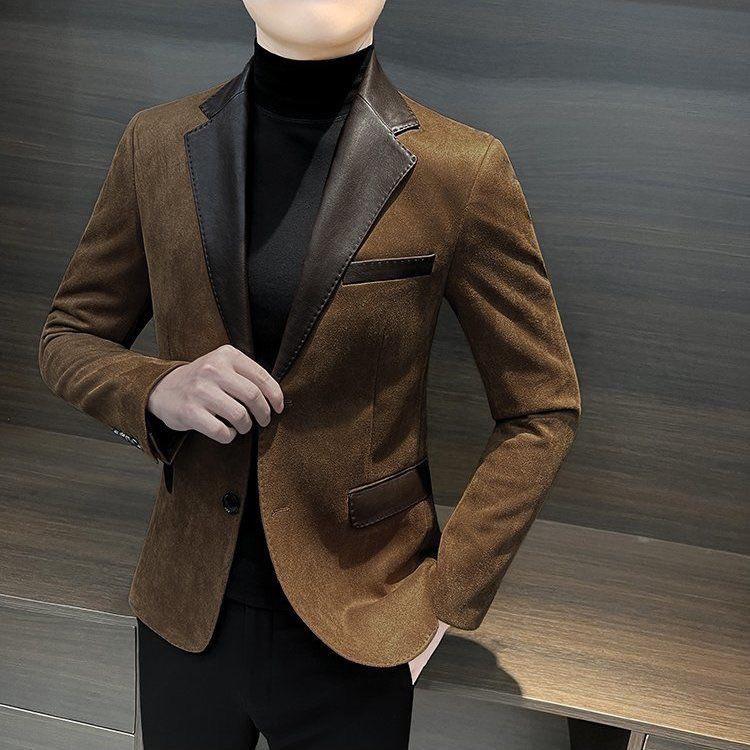 Chaqueta de traje informal con cuello de cuero para hombre, estilo occidental, con parches, para primavera y otoño