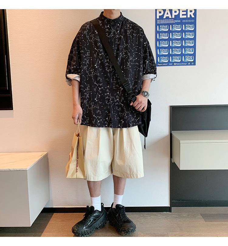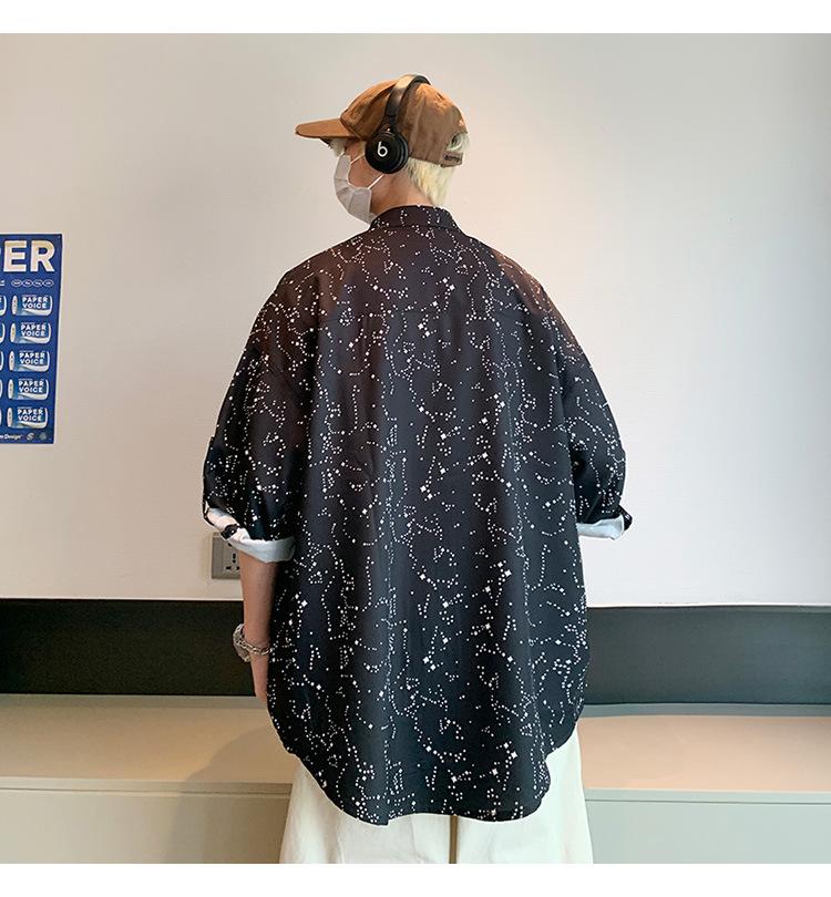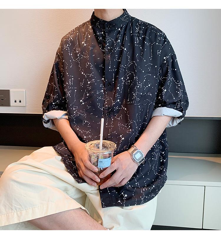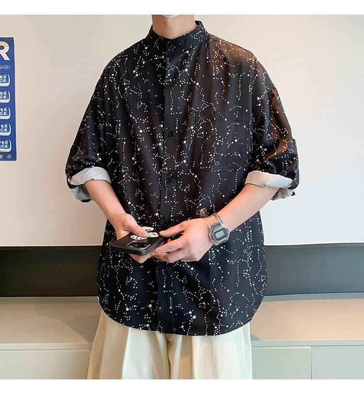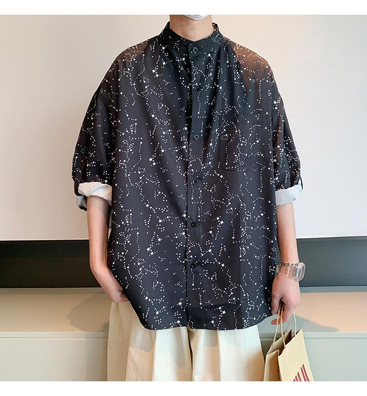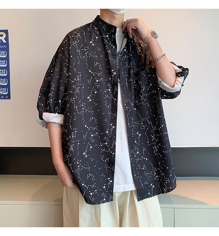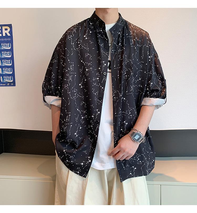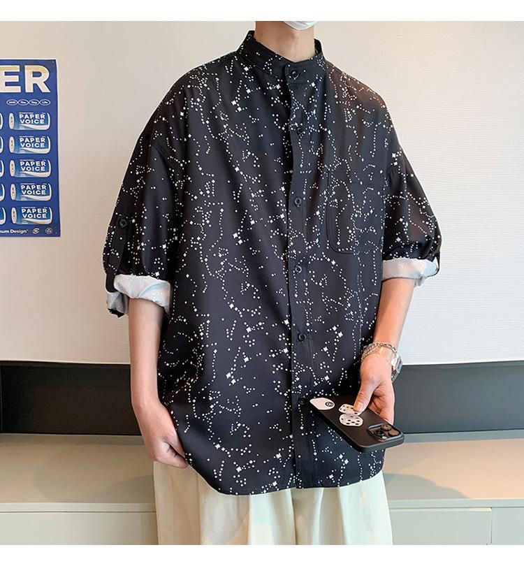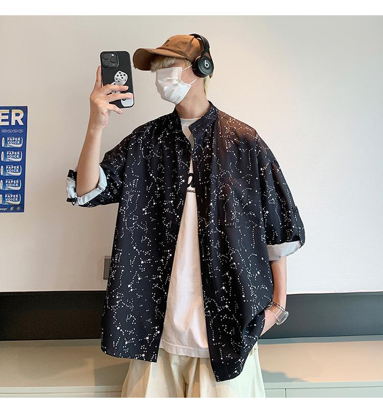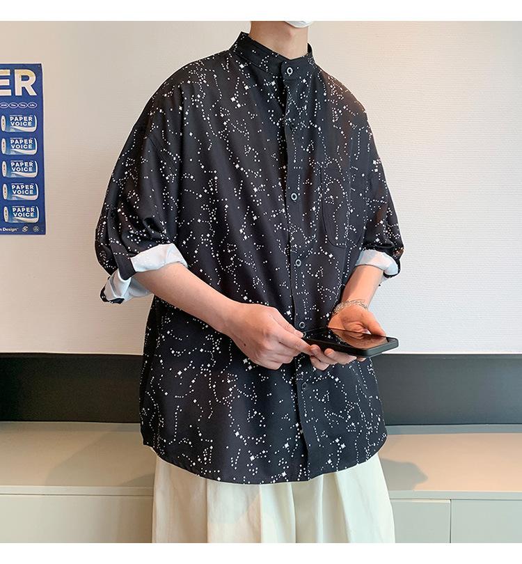 Camisa de manga corta drapeada de seda de hielo con estrellas para hombre, holgada, de talla grande, de moda, de verano, con cuello retro y forro de manga de siete puntos