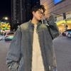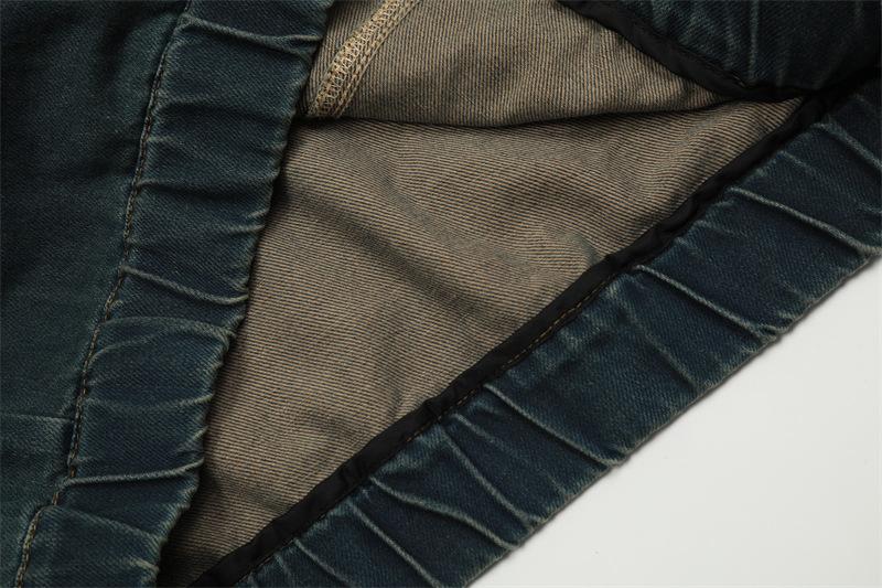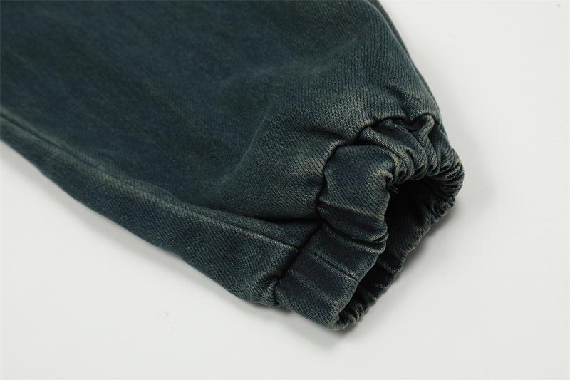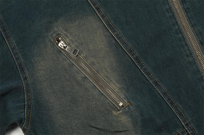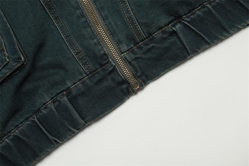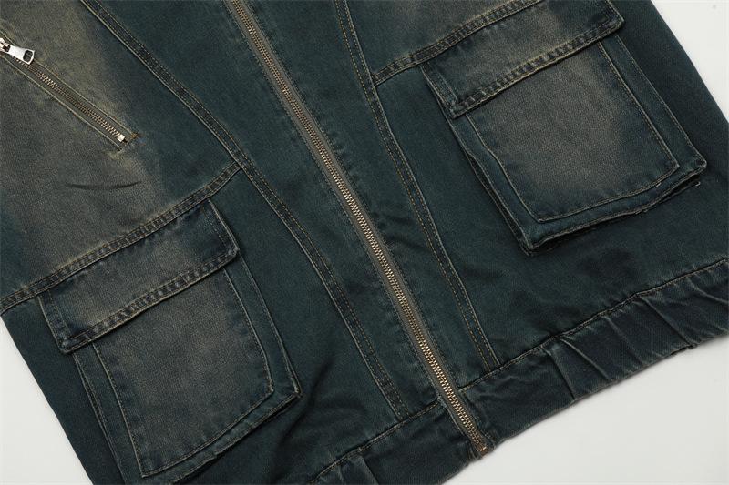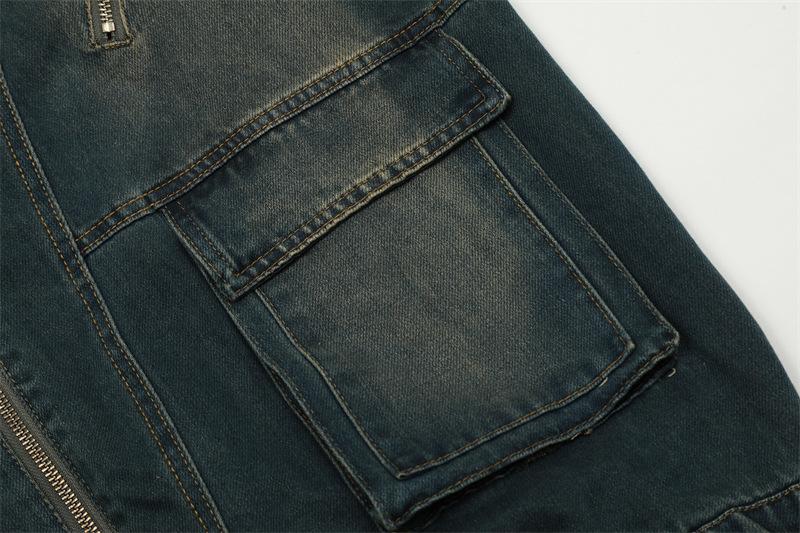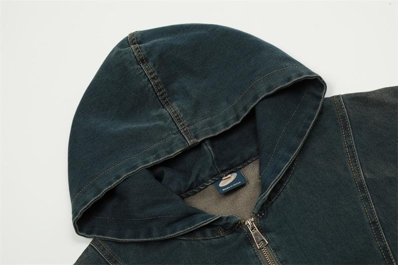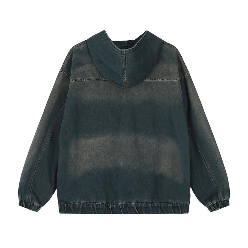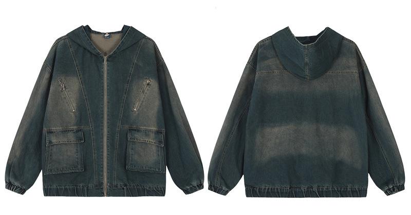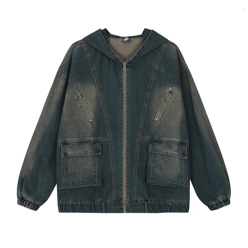 Chamarra de mezclilla con capucha estilo americano de calle, vintage, lavada, vieja, diseño de marca a la moda, bolsillos grandes, estilo utilitario, para hombre y mujer