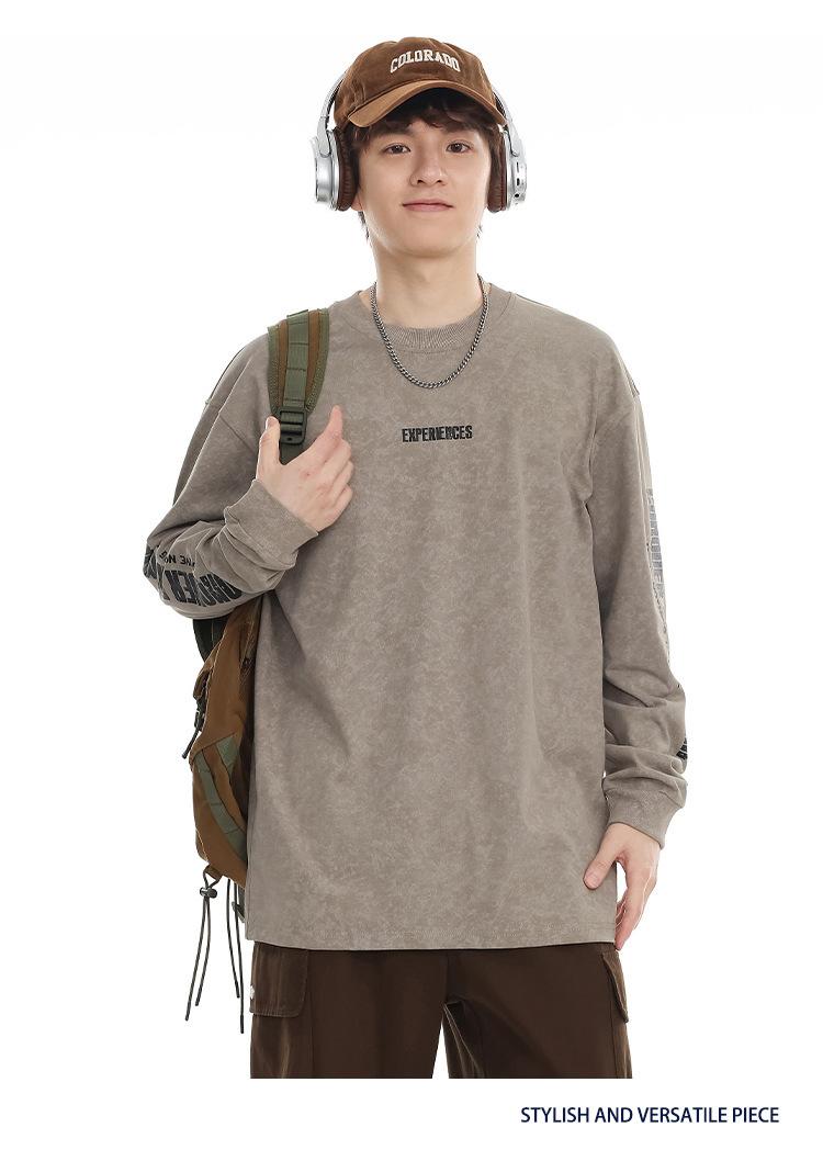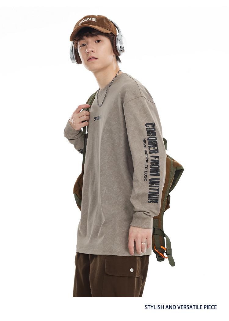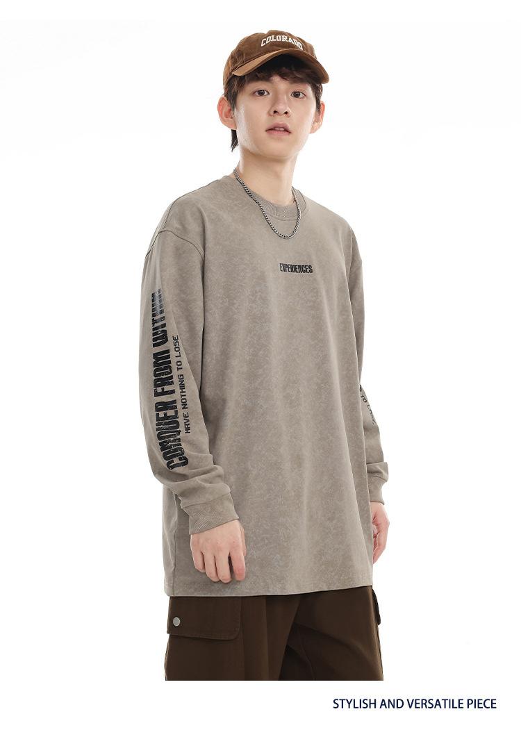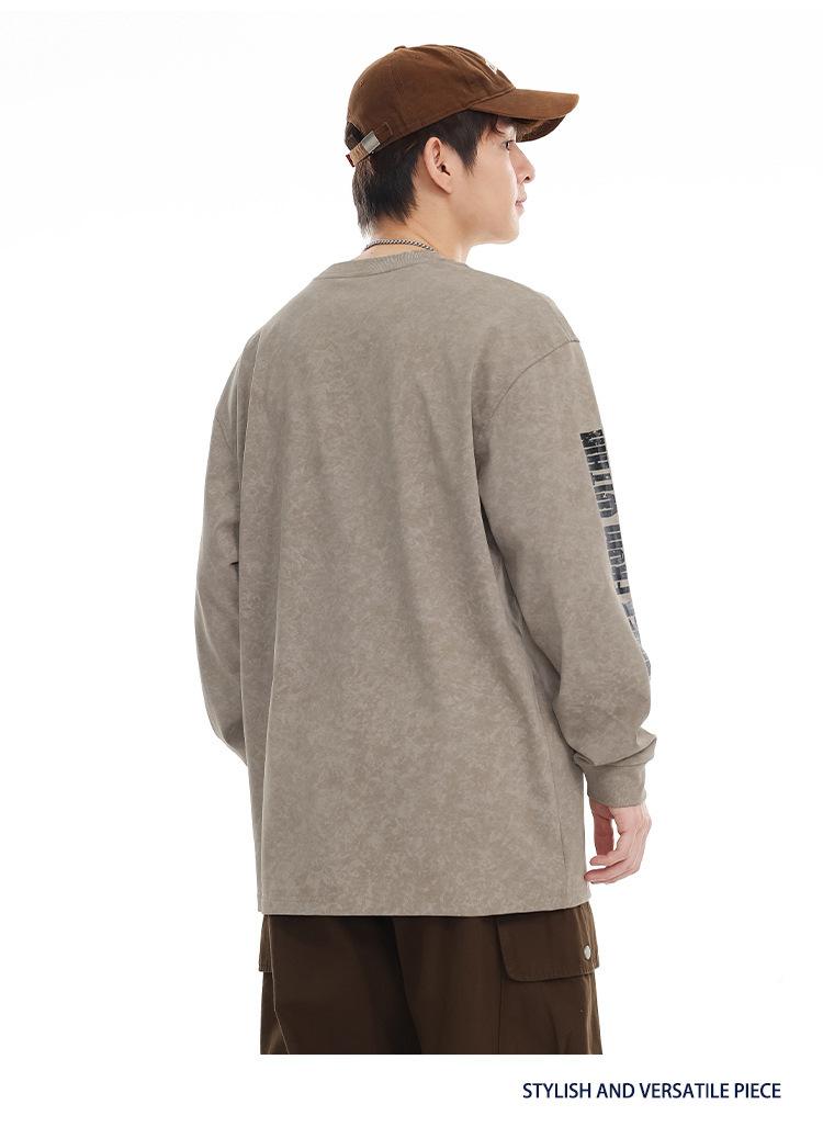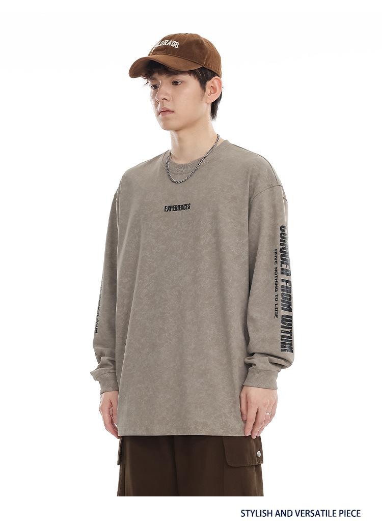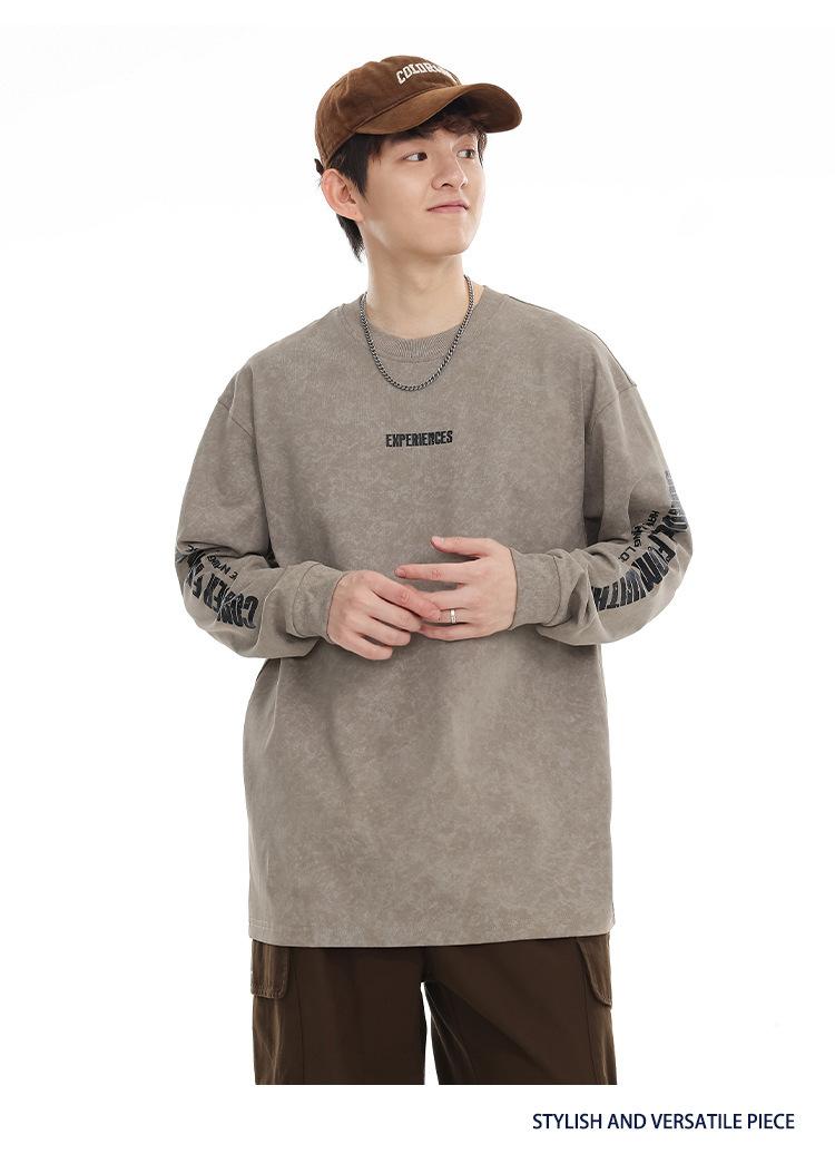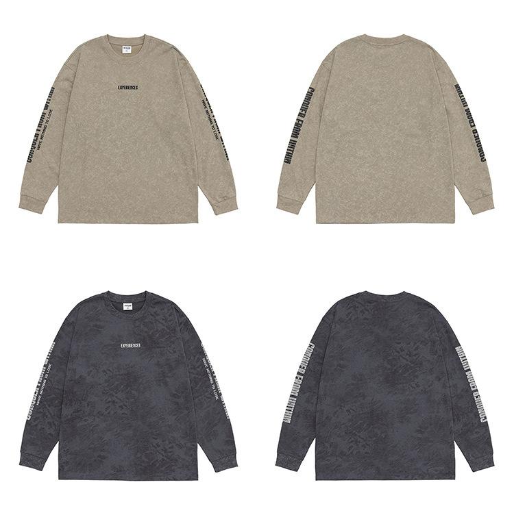 Camiseta retro americana lavada desgastada de manga larga para hombre marca de moda estampado de letras cuello redondo holgada casual top camiseta base