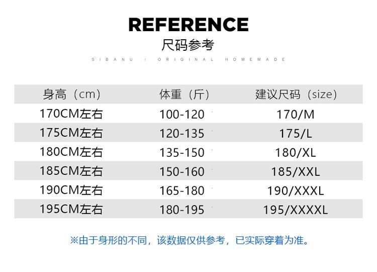 170/M, 175/L, 180/XL, 185/2XL, 190/3XL, 195/4XL