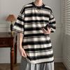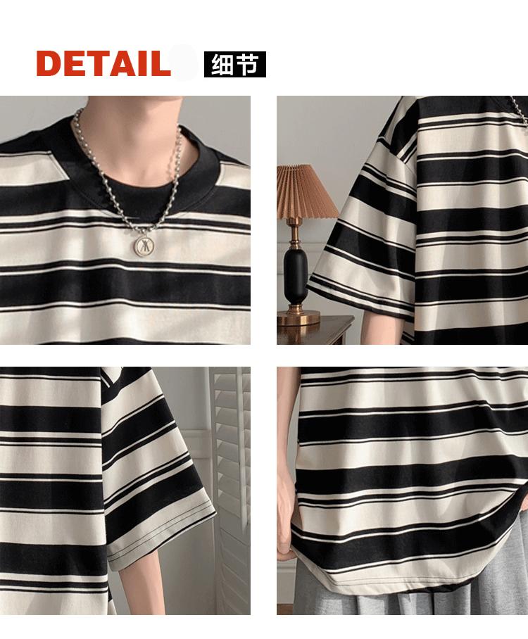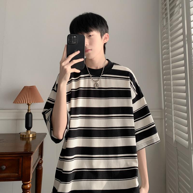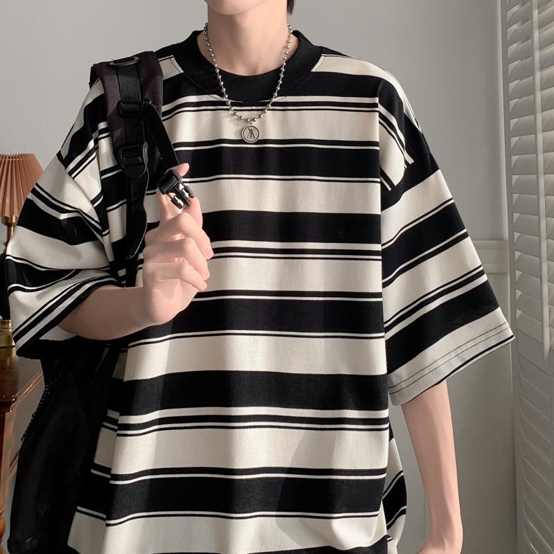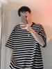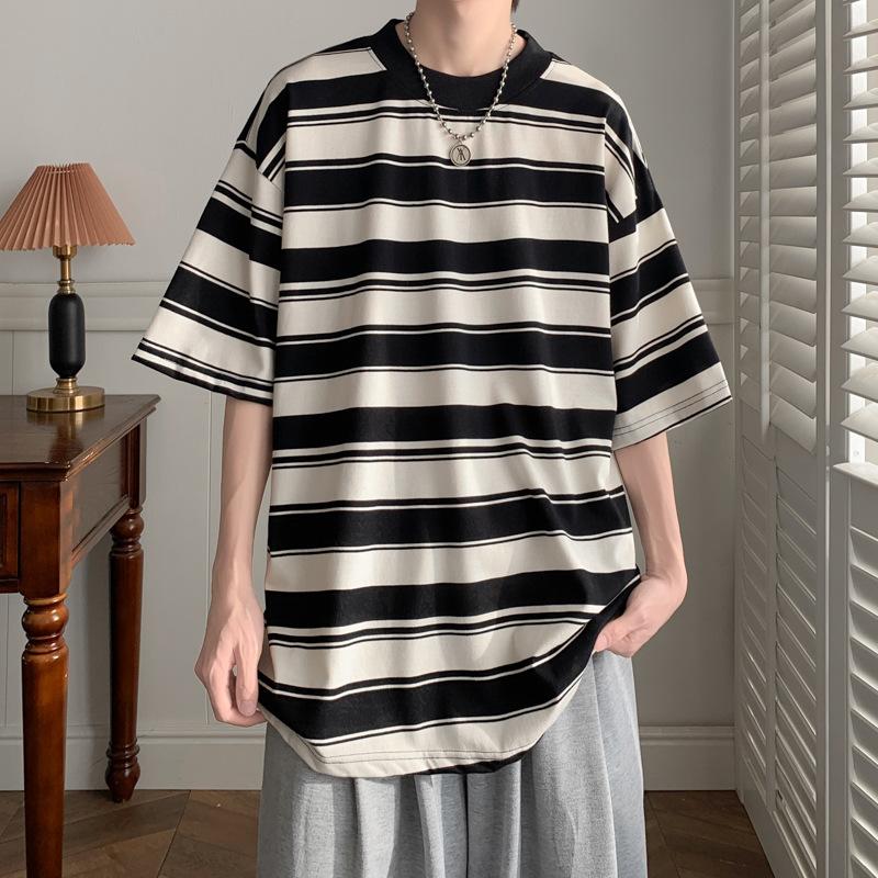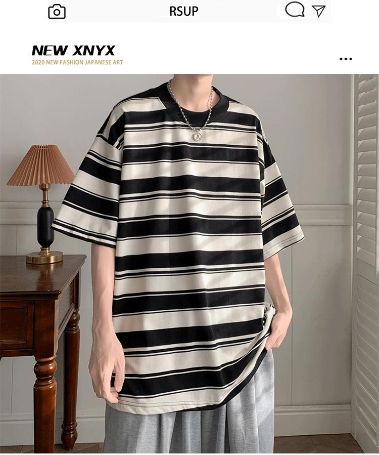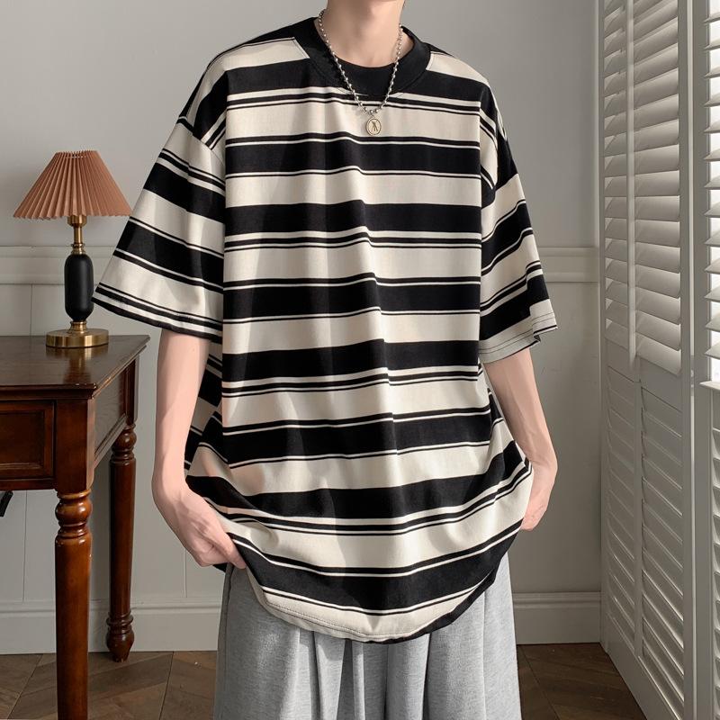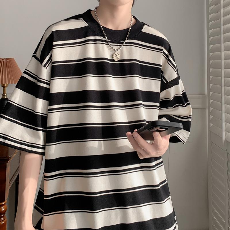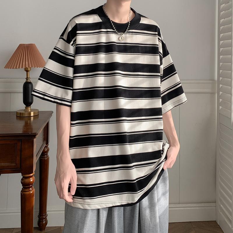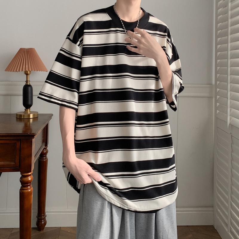 Camiseta de manga corta a rayas retro de estilo japonés para hombre y mujer, fina, sencilla, combinable, con cuello redondo, holgada, informal, de verano