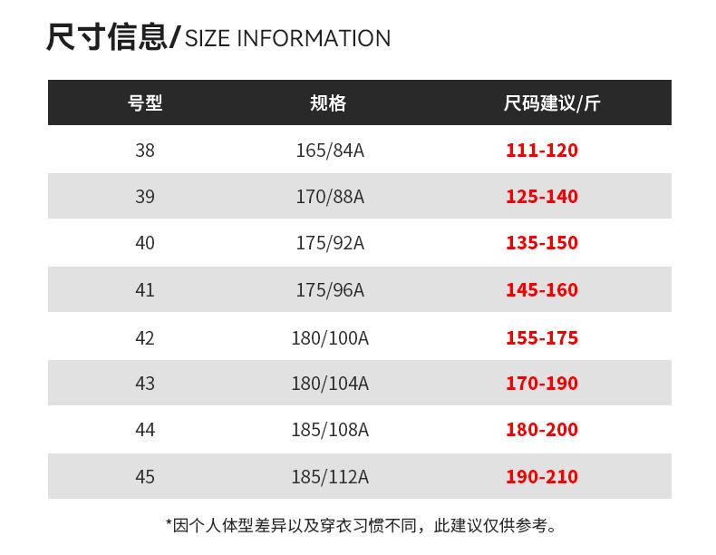 38 (below 60kg ), 39( 60-67.5kg ), 40( 67.5-75kg ), 41( 75-80kg ), 42( 80-85kg ), 43( 85-90kg ), 44( 90-97.5kg...