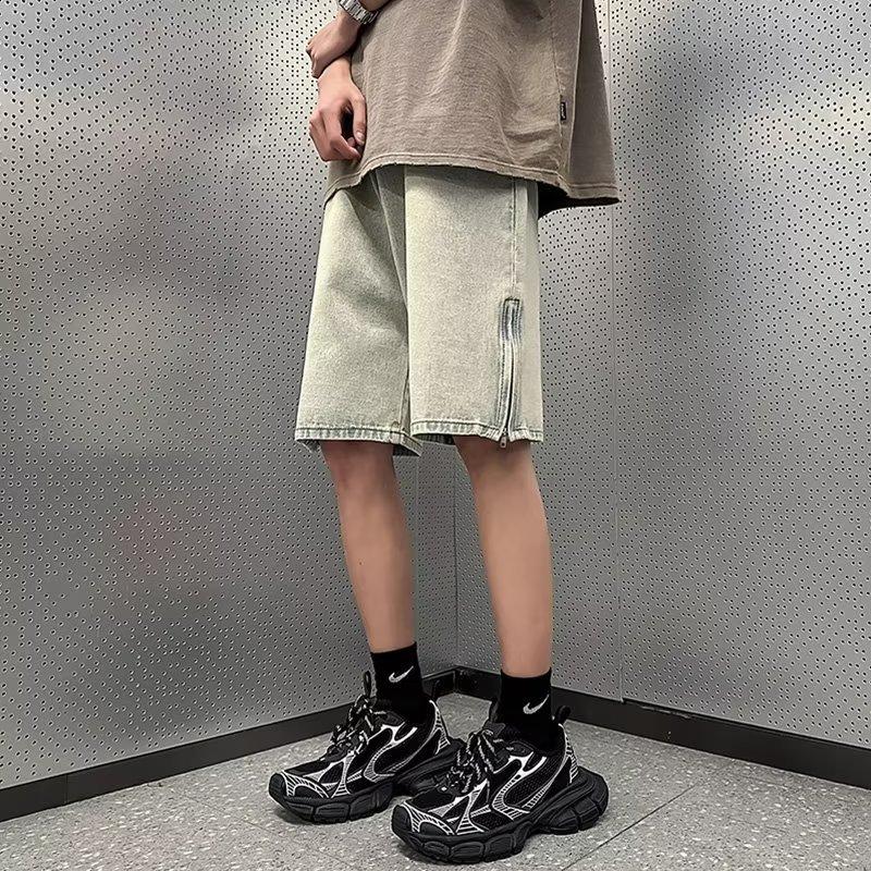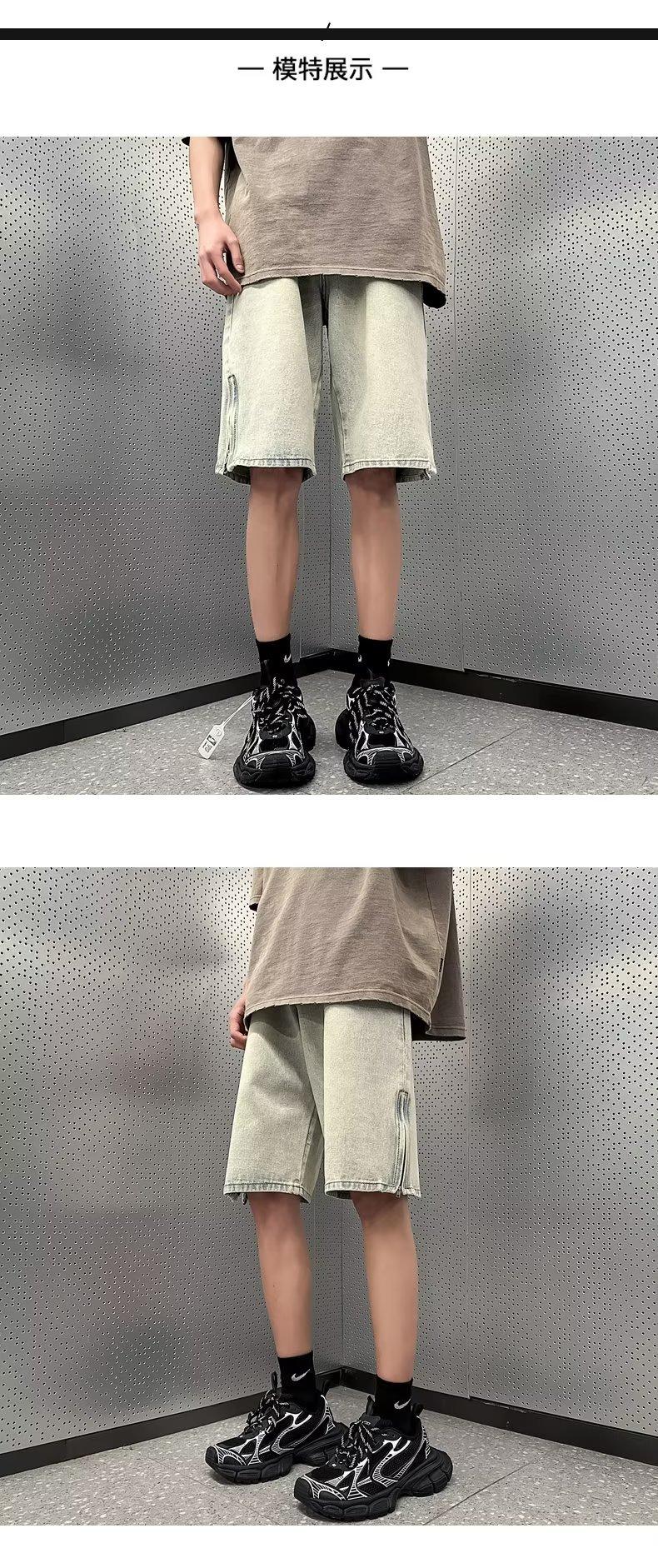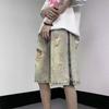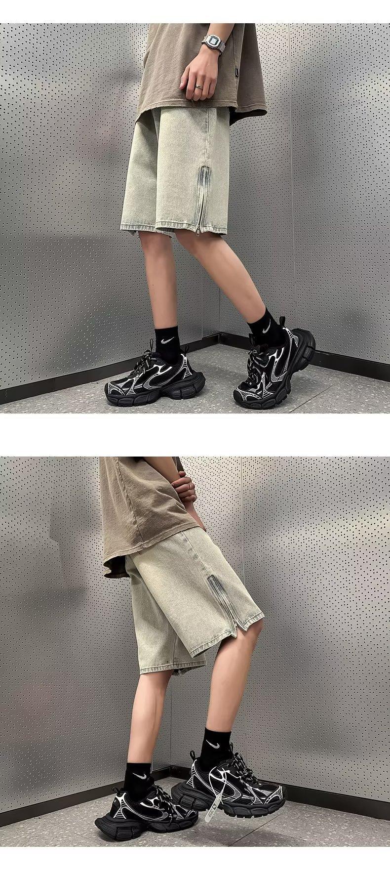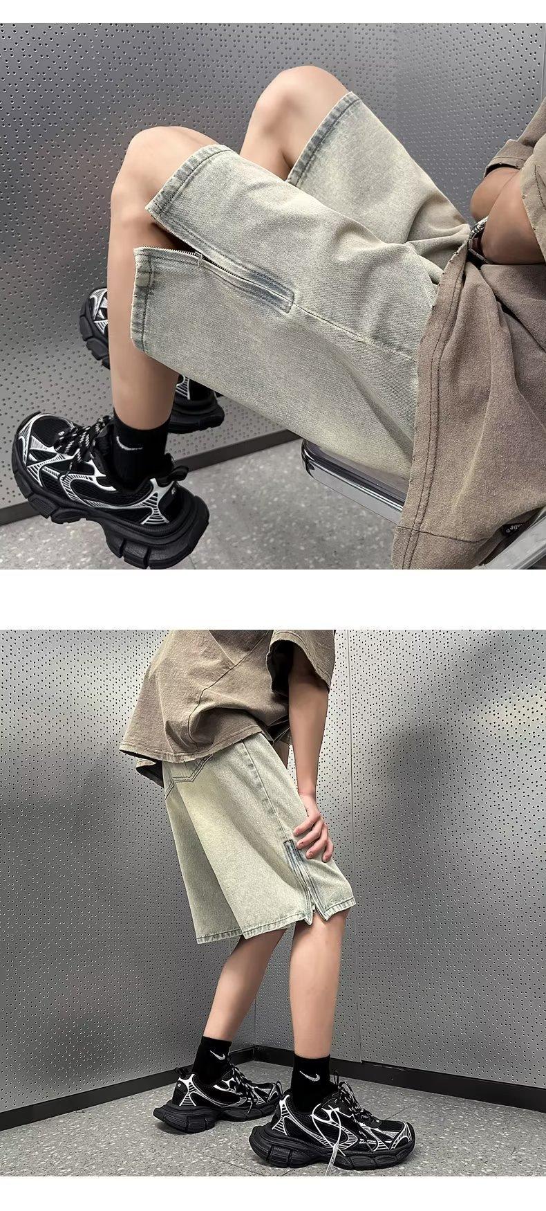 Shorts de mezclilla teñidos con barro amarillo para hombre, moda de estilo americano, cremallera, abertura, pantalones rectos, verano, sueltos, de pierna ancha