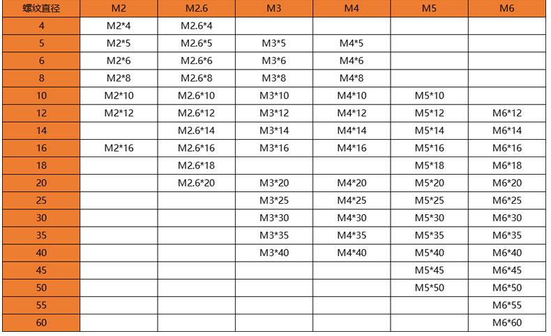 M2 * 4, M2 * 5, M2 * 6, M2 * 8, M2 * 10, M2 * 12, M2 * 16, M2.6 * 4, M2.6 * 5, M2.6 * 6, M2.6 * 8, M2.6 * 10, ...