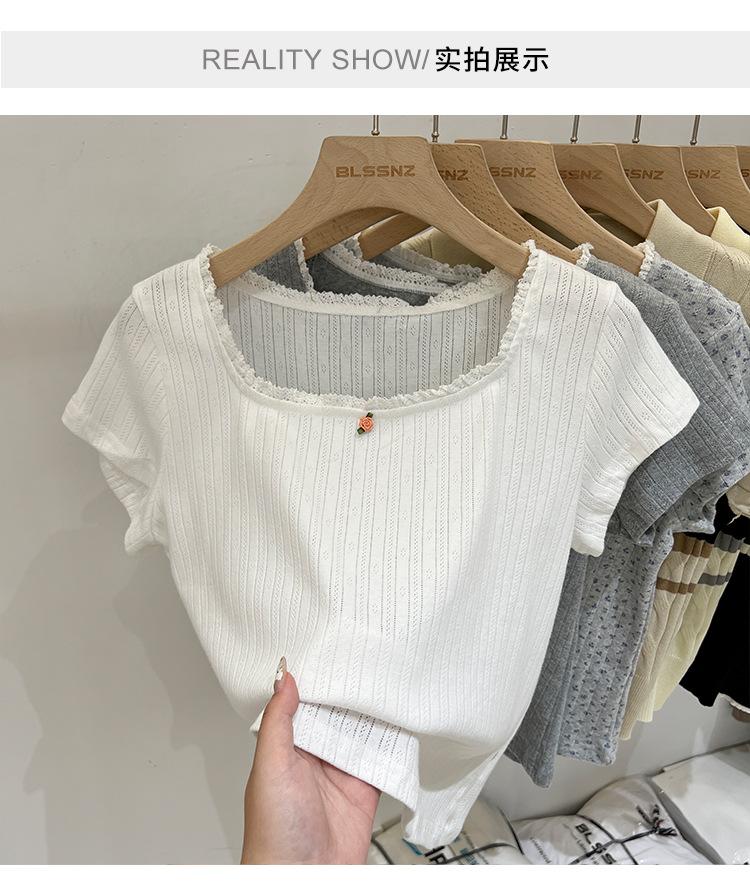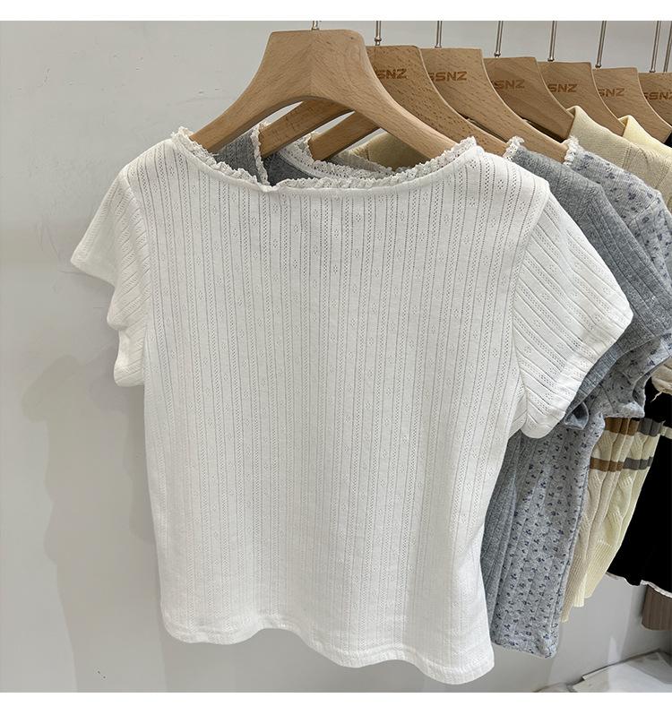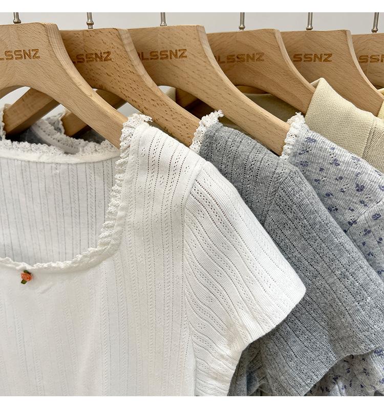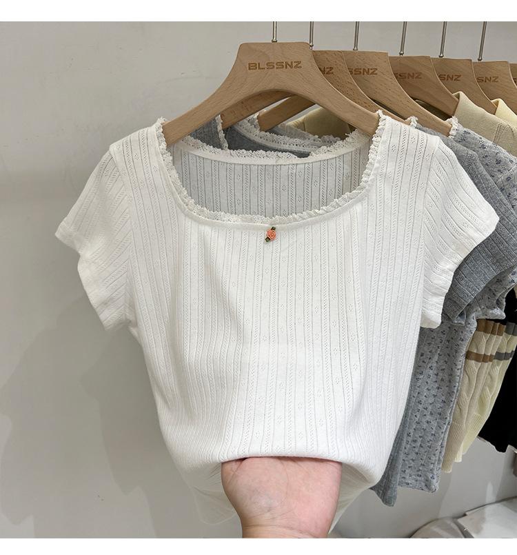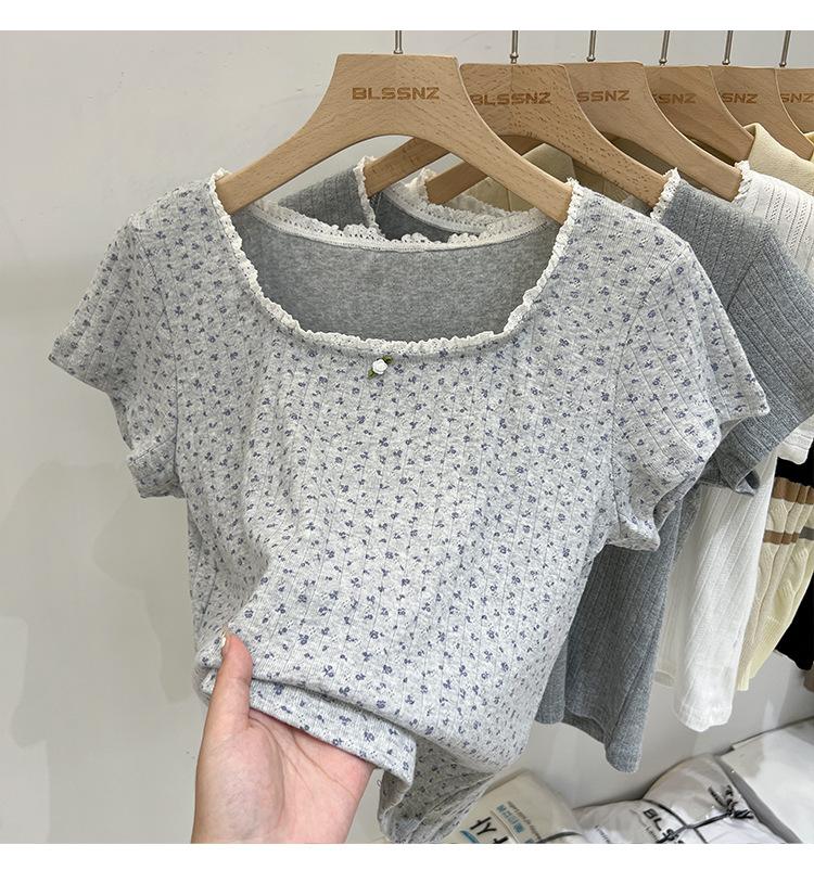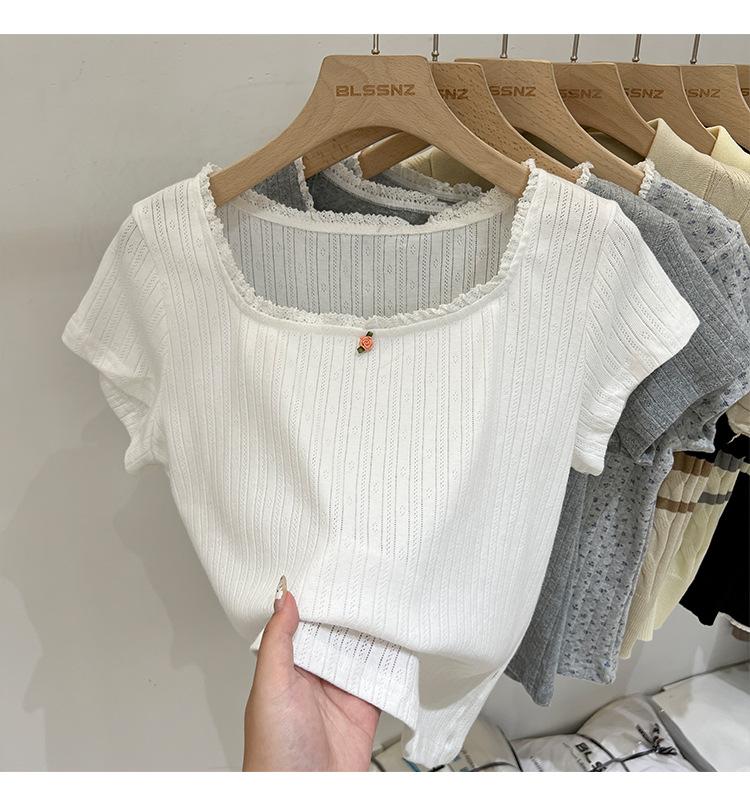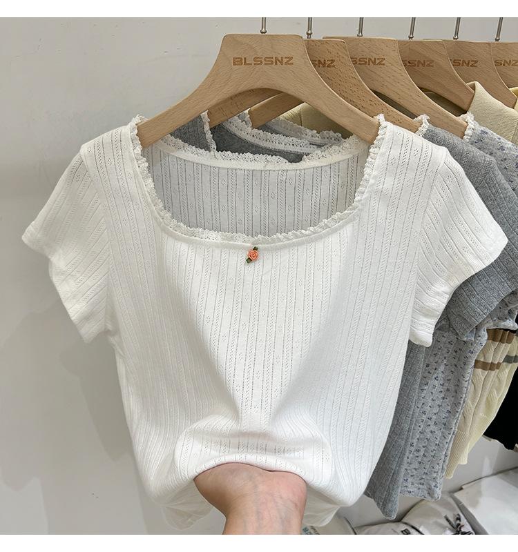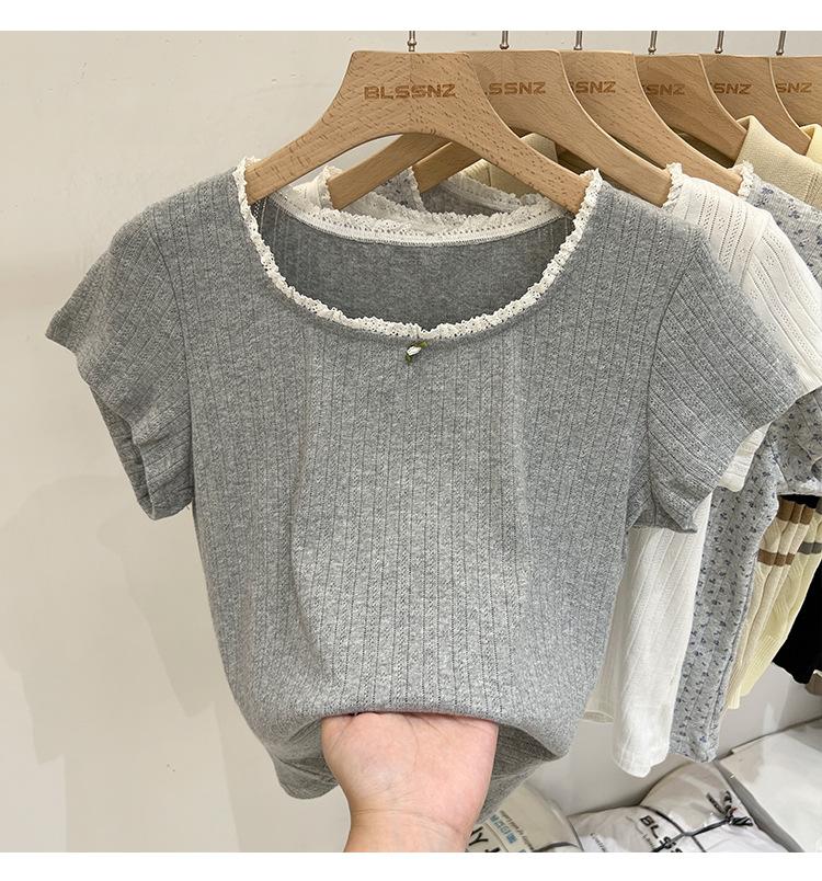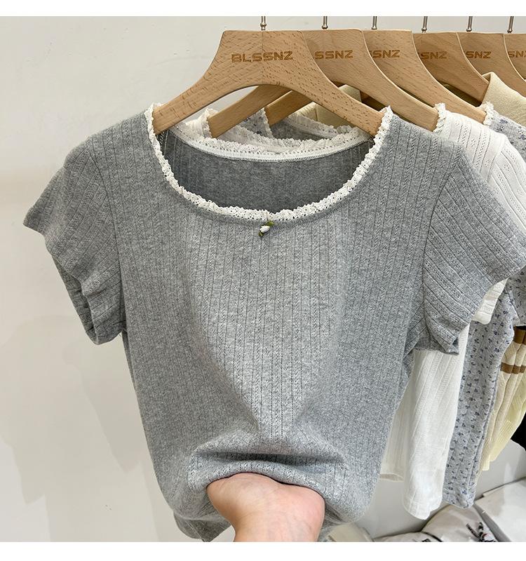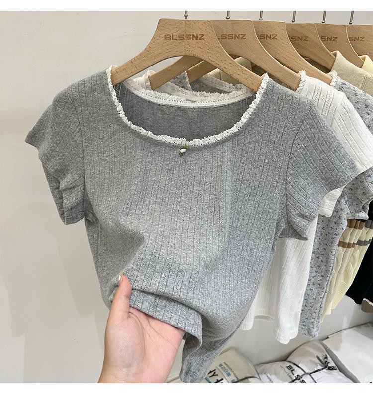 Camiseta de manga corta de algodón puro con hombros descubiertos y encaje gris para mujer, diseño de verano, cuello cuadrado, top corto puro, nuevo estilo 2024