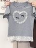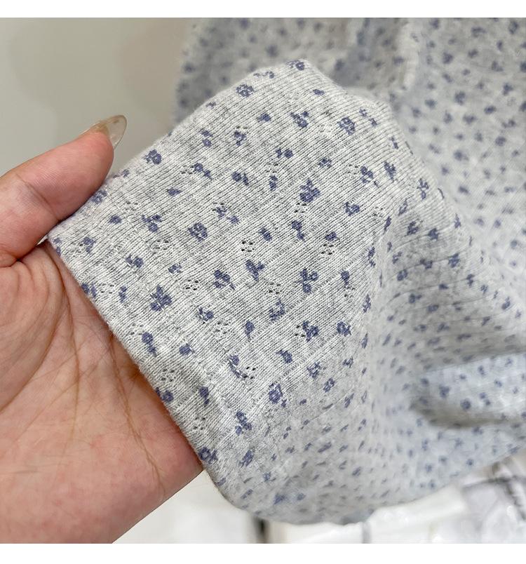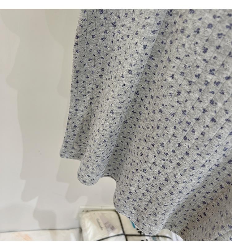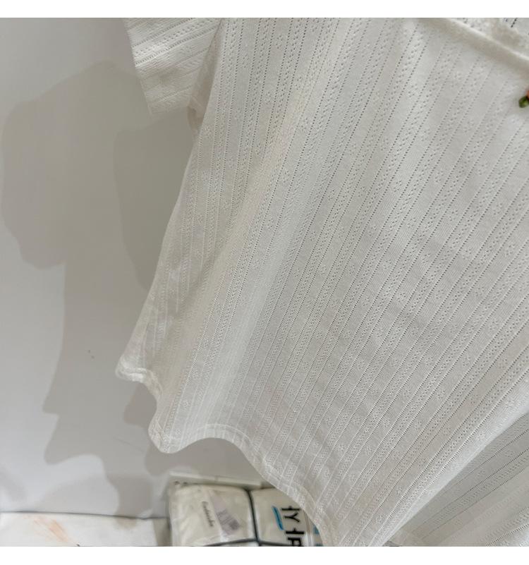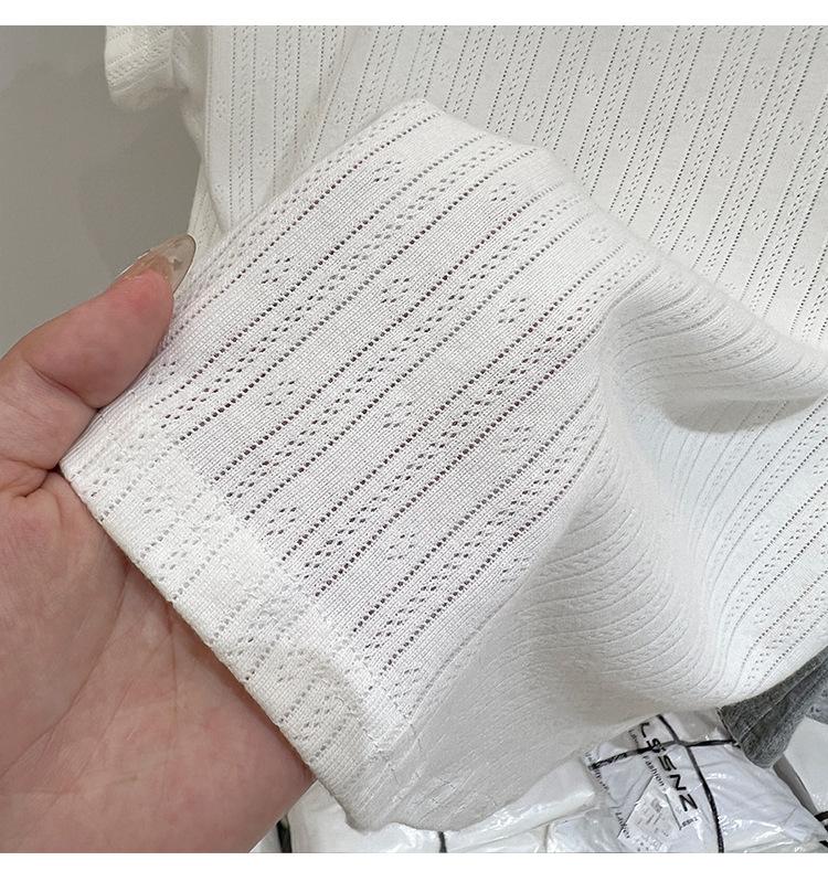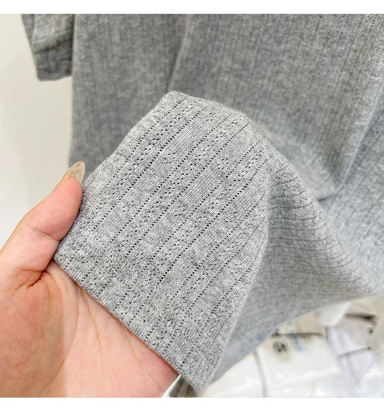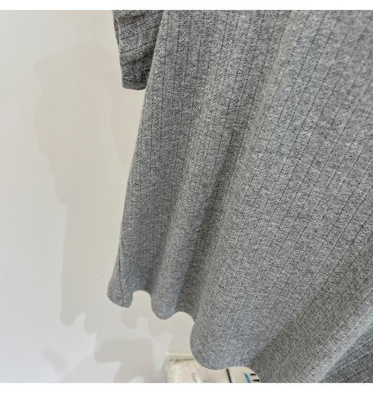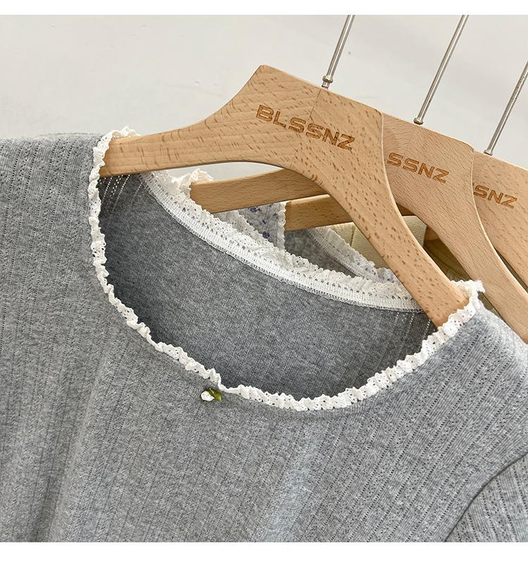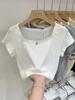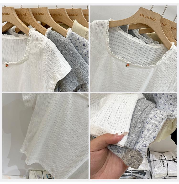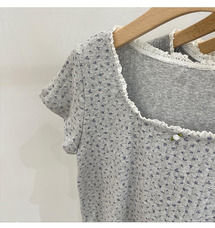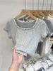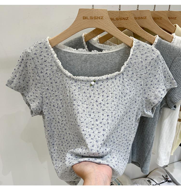 Camiseta de manga corta de algodón puro con hombros descubiertos y encaje gris para mujer, diseño de verano, cuello cuadrado, top corto puro, nuevo estilo 2024