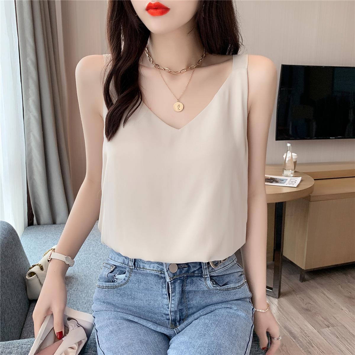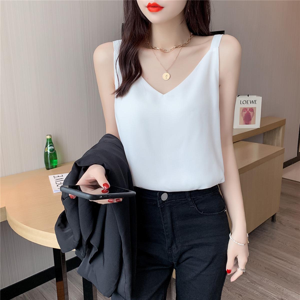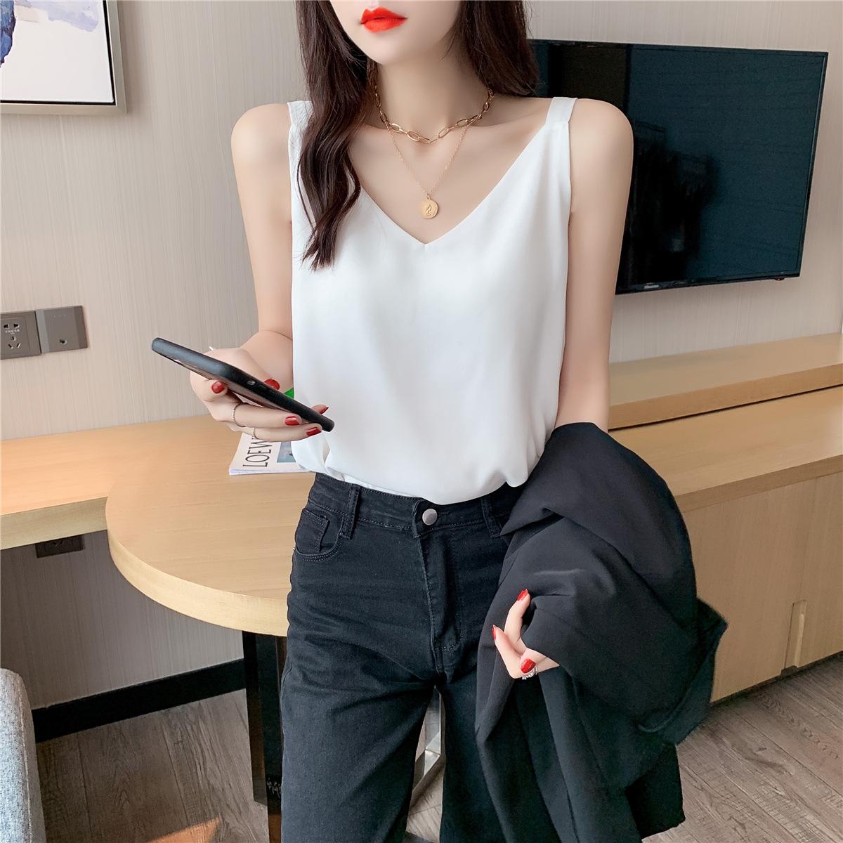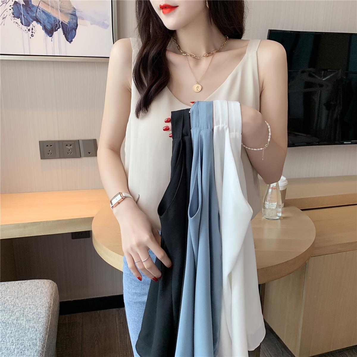 Camisola de gasa para mujer, novedad de verano 2024, con escote en V, doble capa, holgada, ajustada, interior blanca.