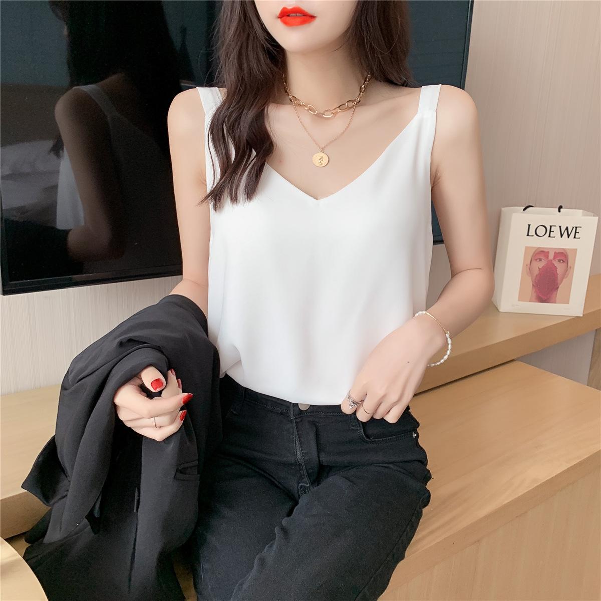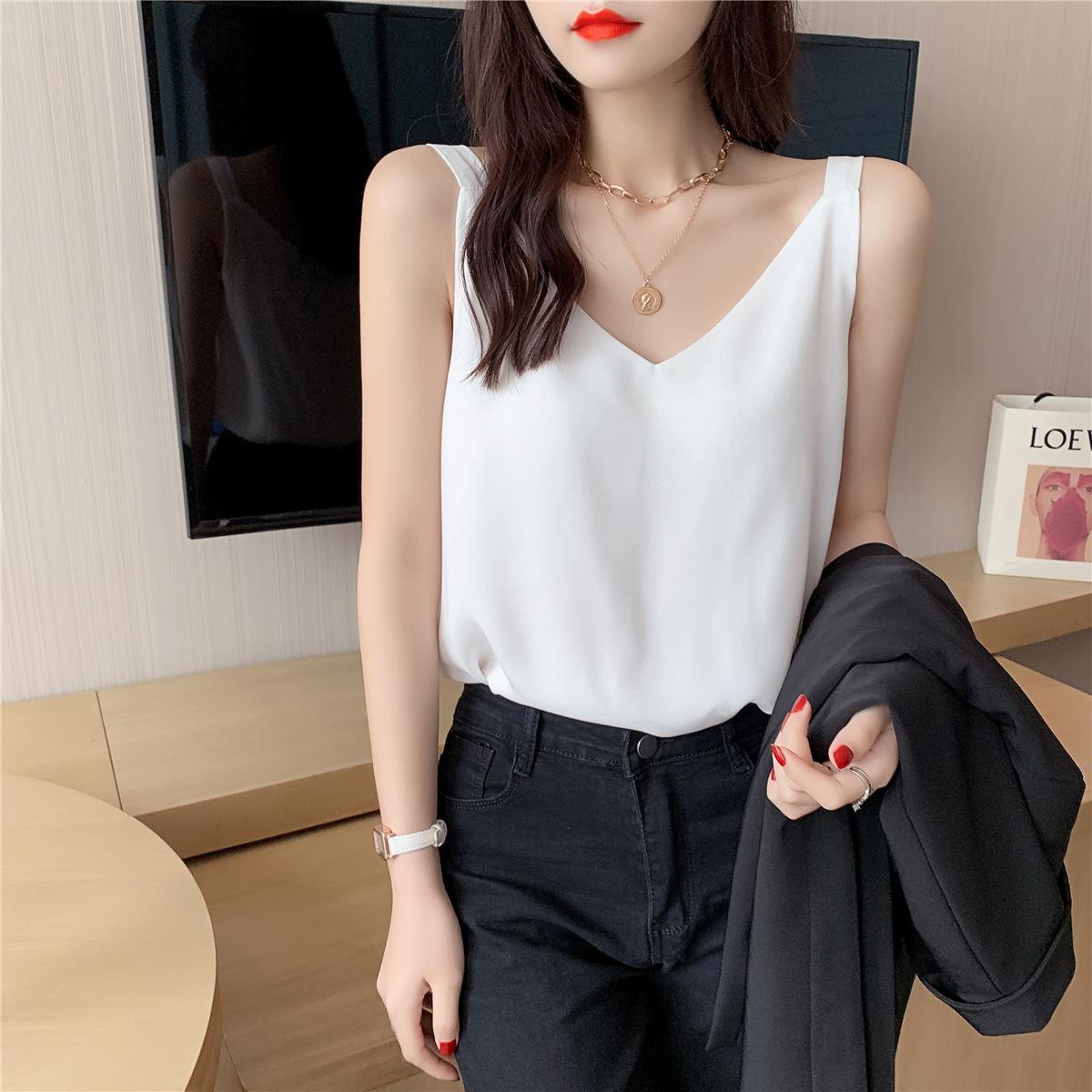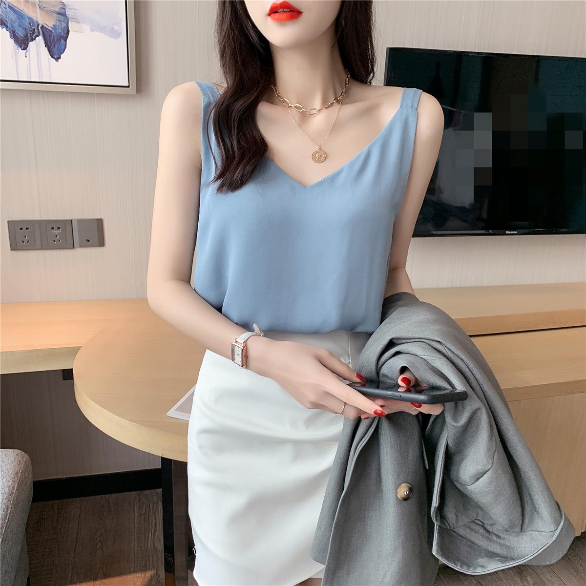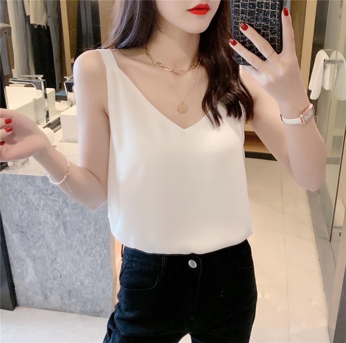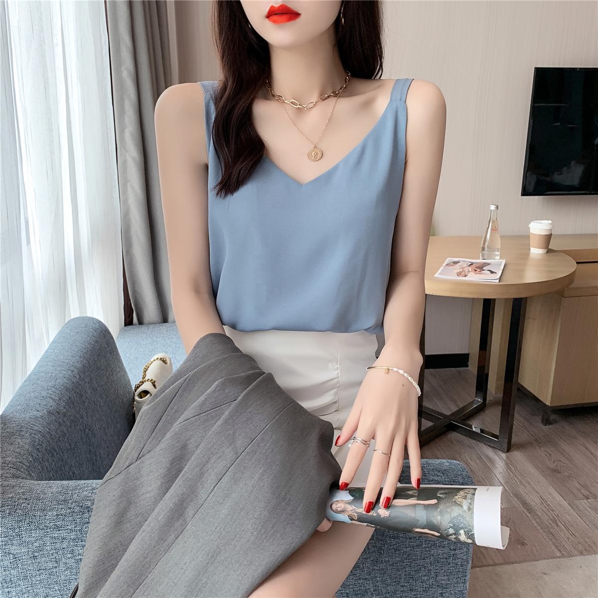 Camisola de gasa para mujer, novedad de verano 2024, con escote en V, doble capa, holgada, ajustada, interior blanca.